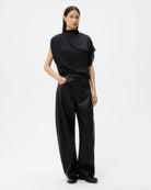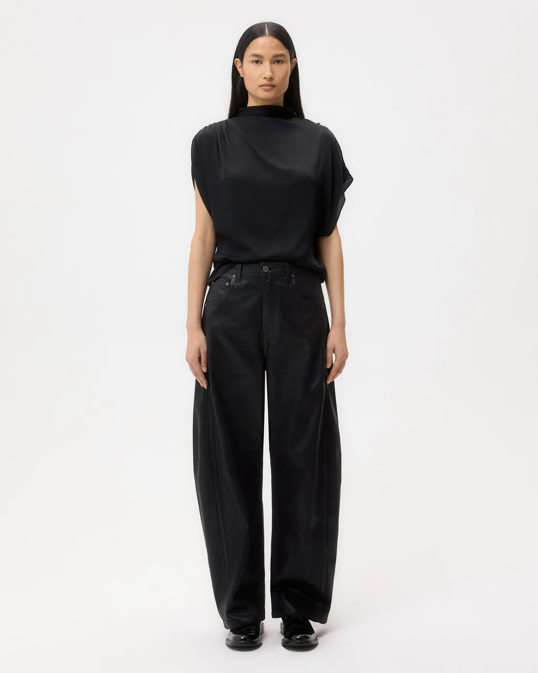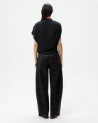 Mid-rise barrel pants in non-stretch, coated black denim, manufactured in LA. This jean is relaxed through the hip and leg and has darts at the knee. Complete with a five pocket style, detailed with nail head rivets, belt loops, zip fly and metal shank at the waistband.