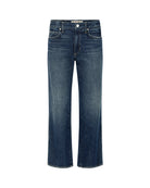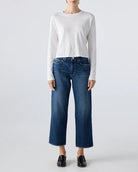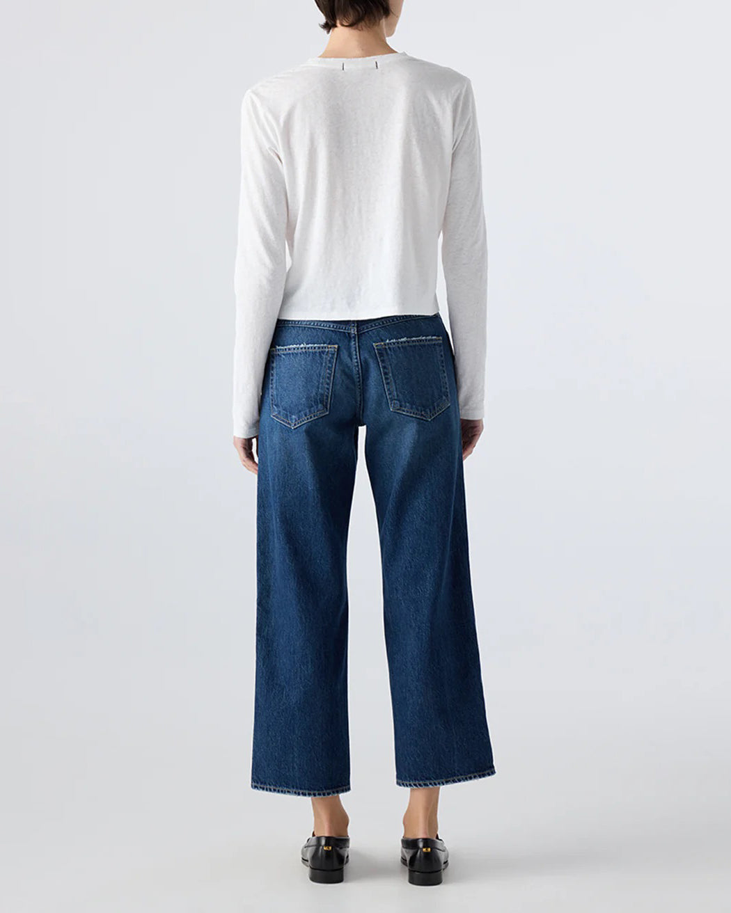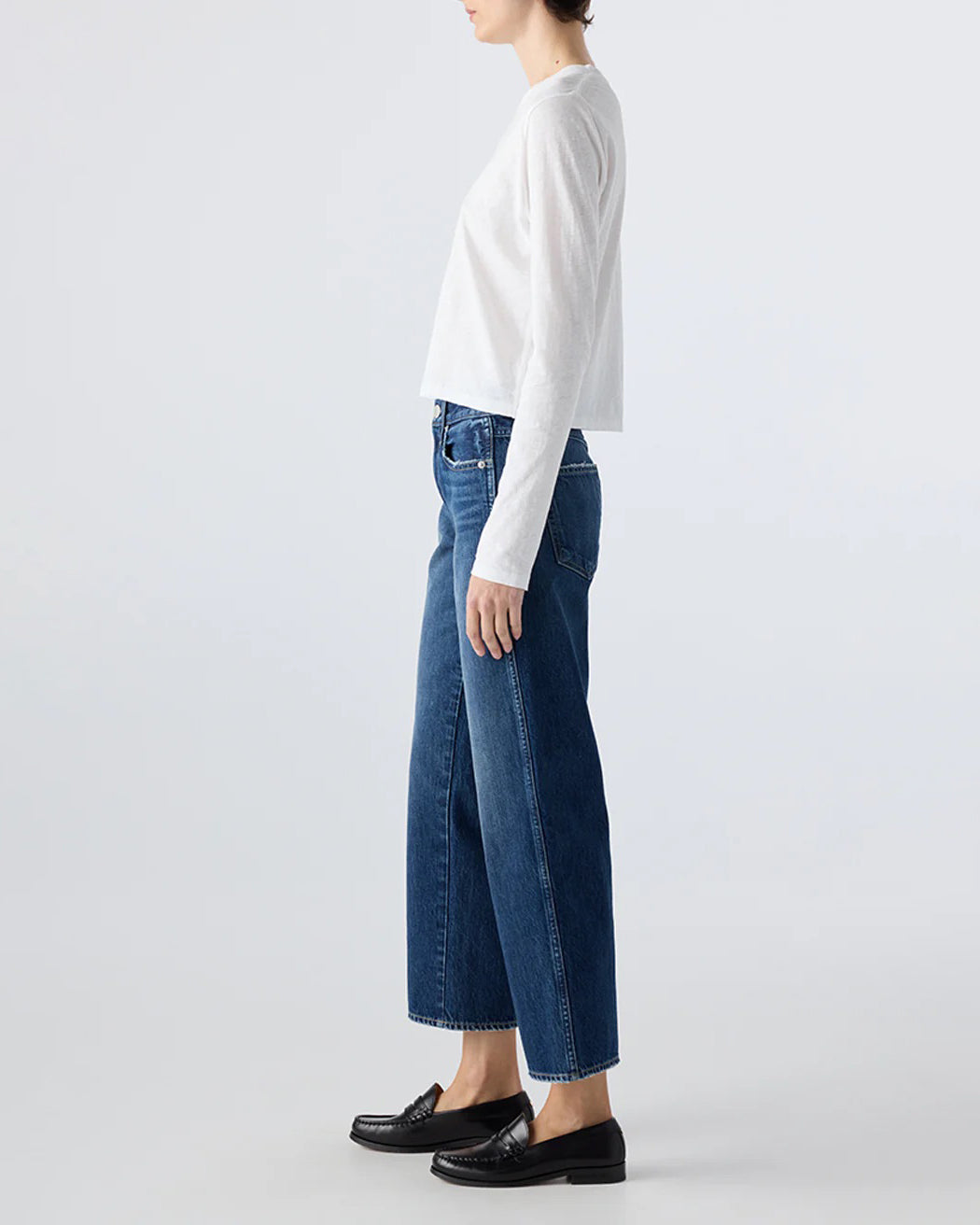 This cropped, wide straight leg is our easiest fit yet. Cut from premium rigid denim with a mid rise, this pair is meant to sit low on the hips for a relaxed look. Thoughtful distressing throughout. Denim hem. Zip fly.