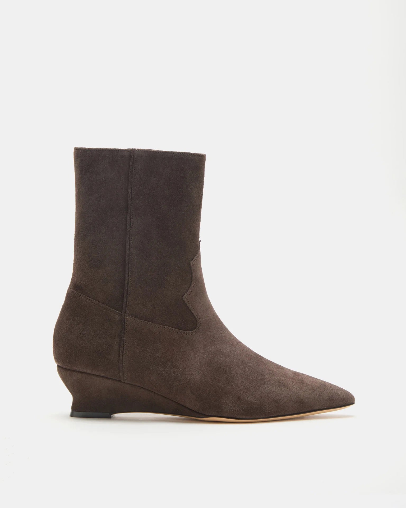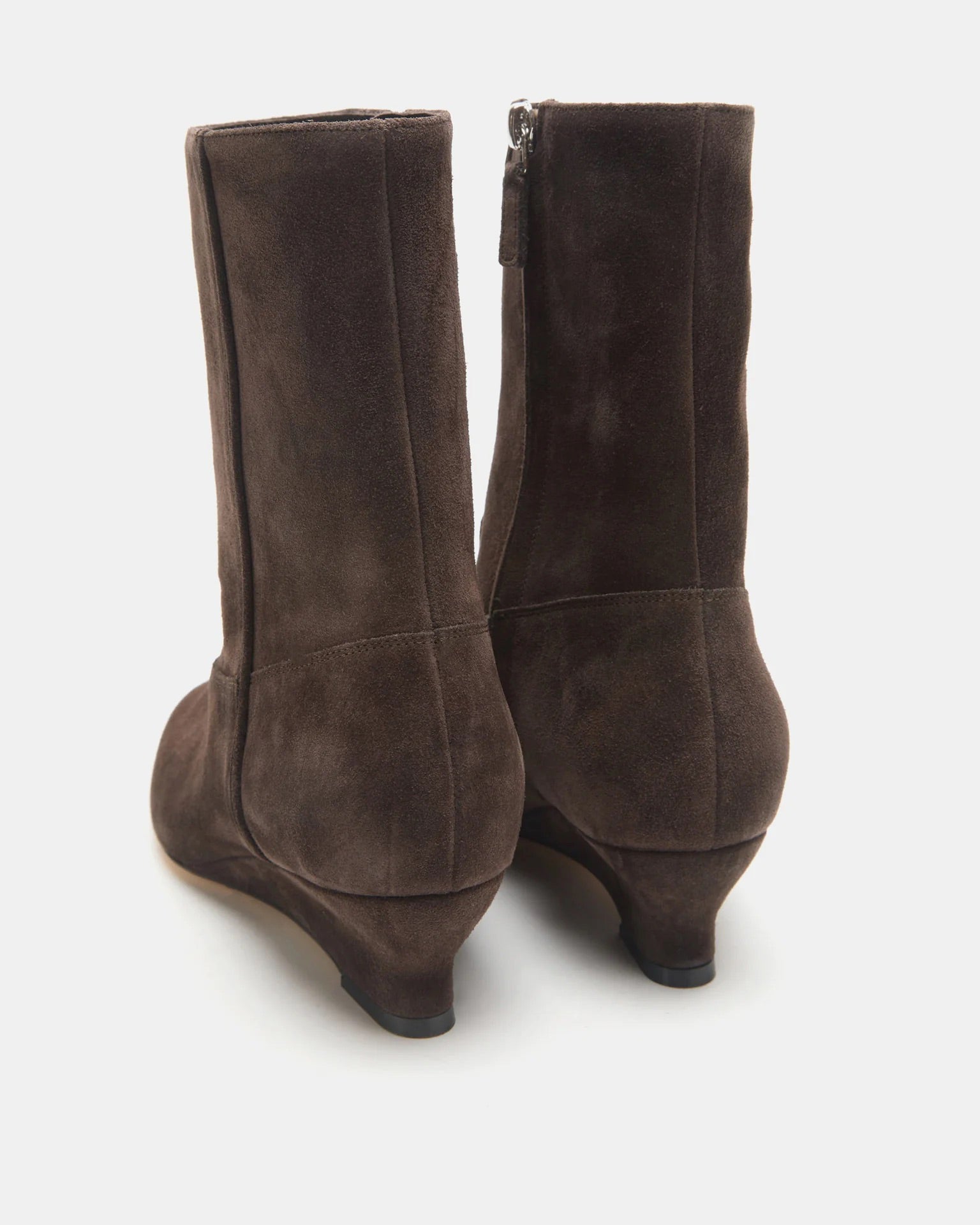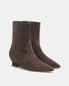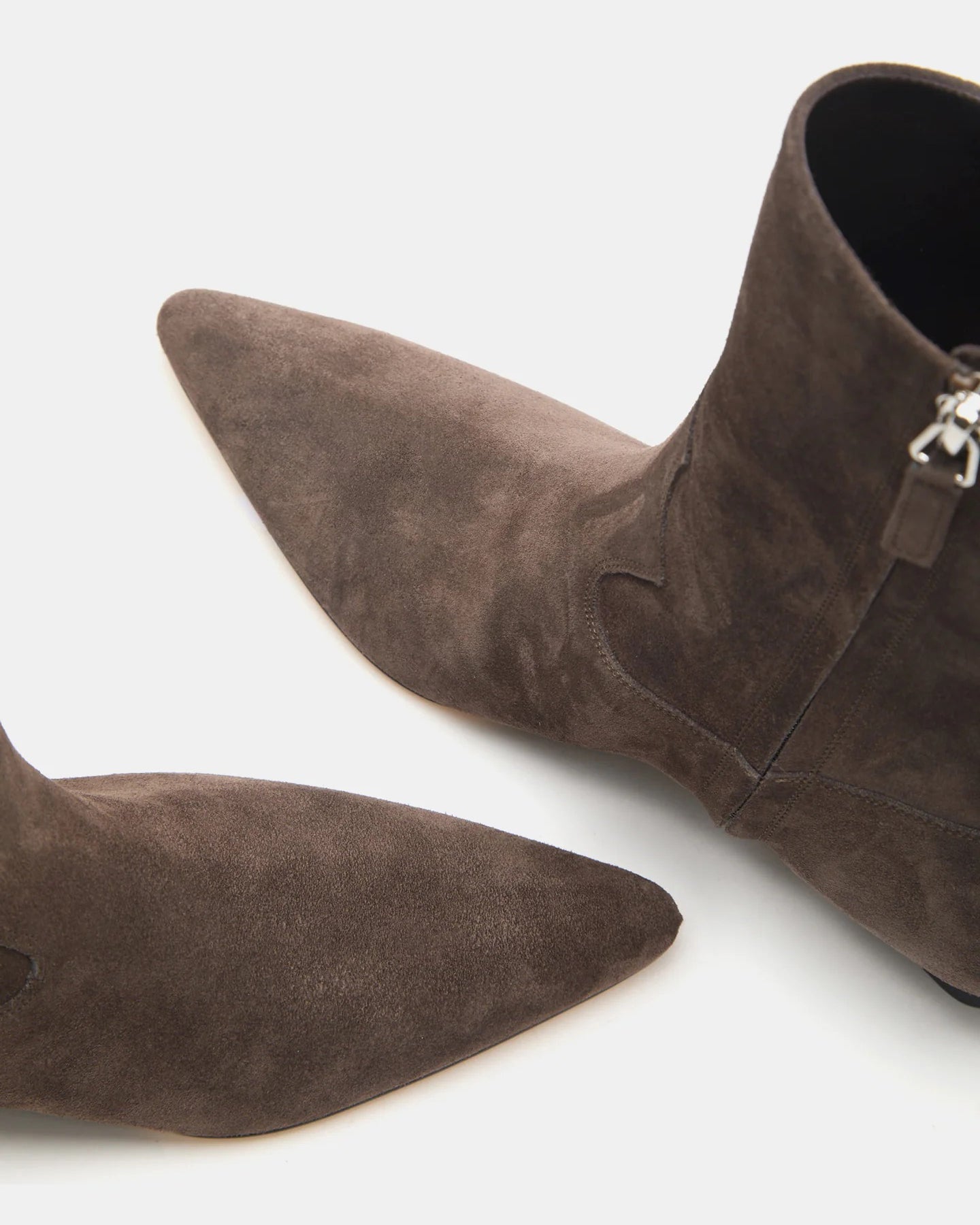 Camille Boot, handcrafted in pepper suede, with a pointy toe, cushioned calf leather insole and zip fastening. 40mm heel.