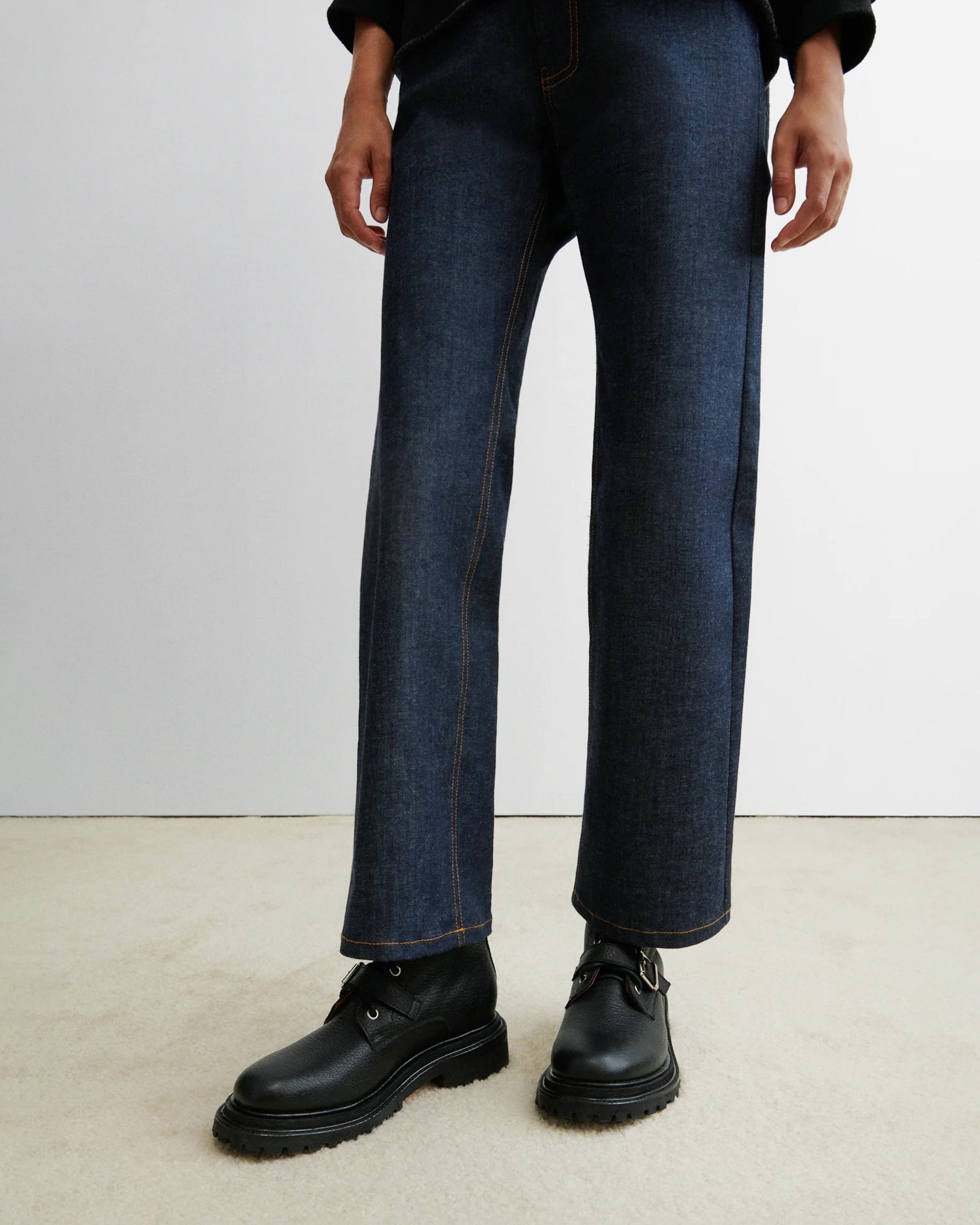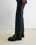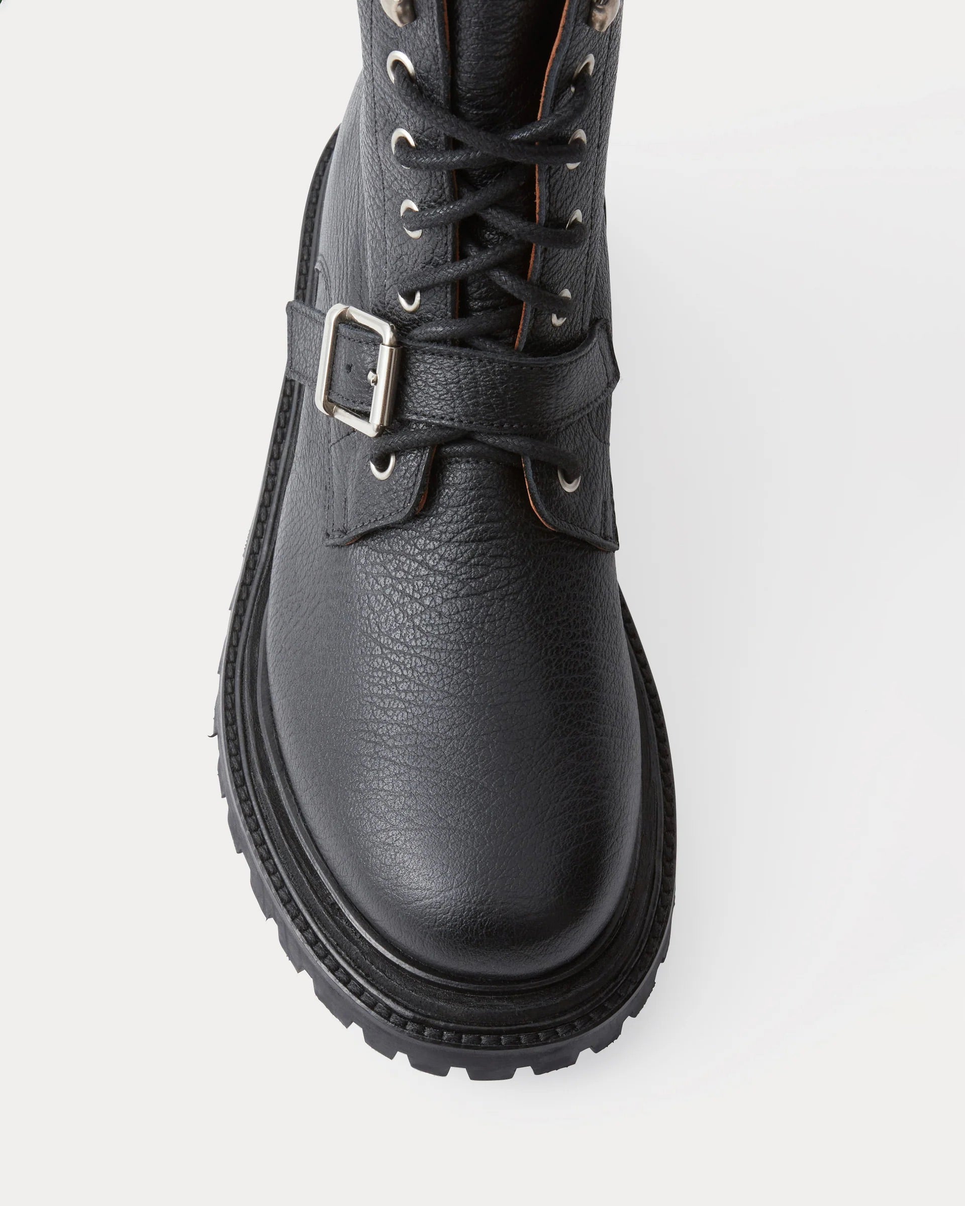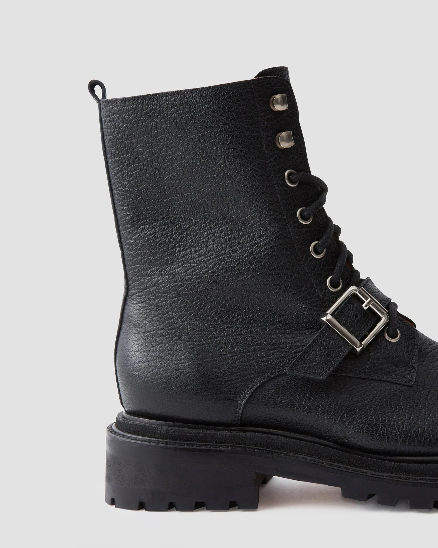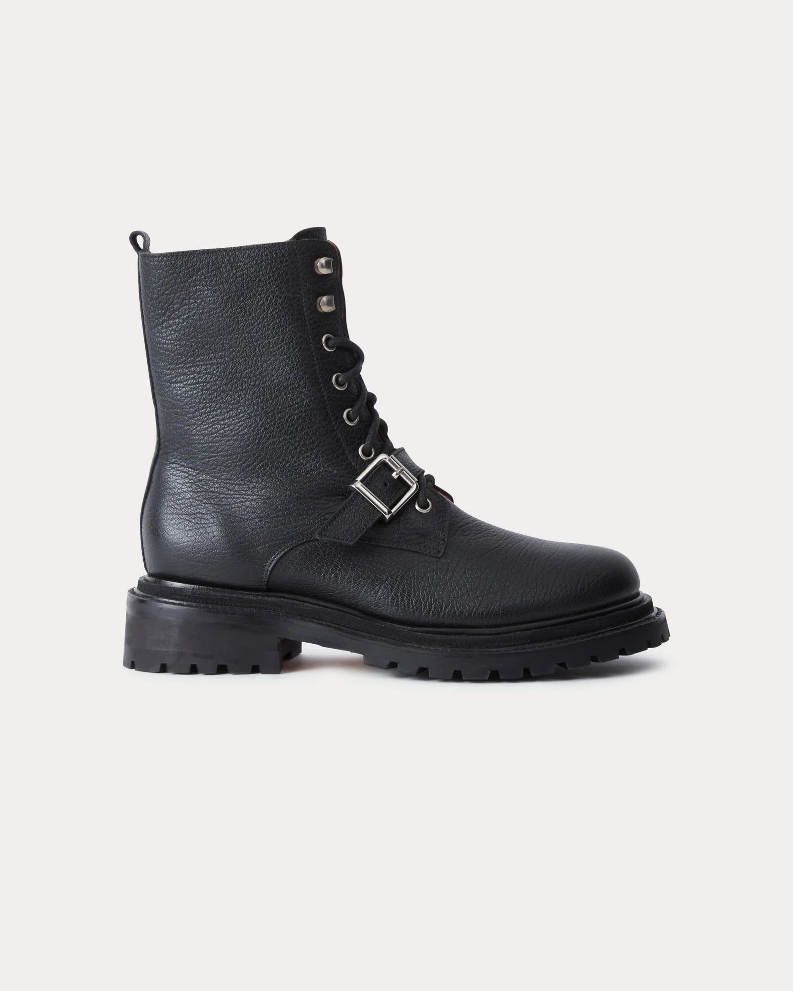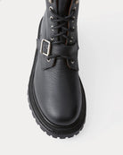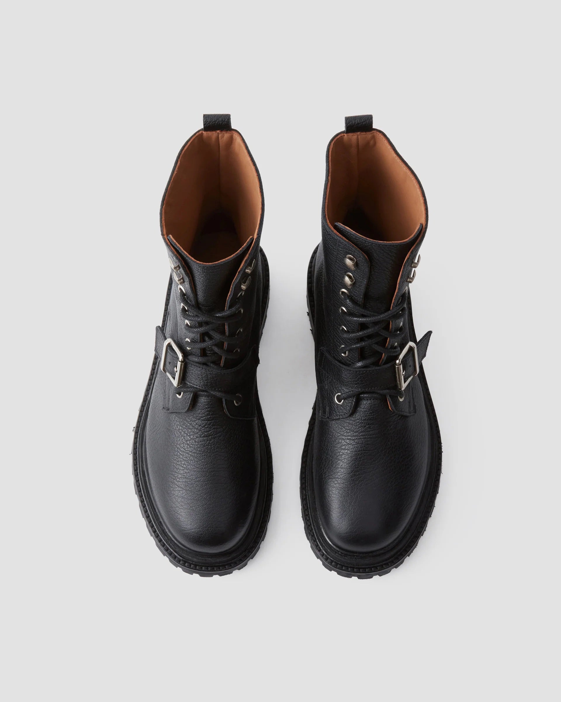 Luxurious Nappa leather combat boots with a round toe and chunky platform sole. Features metal buckle detail and lace-up closure.