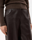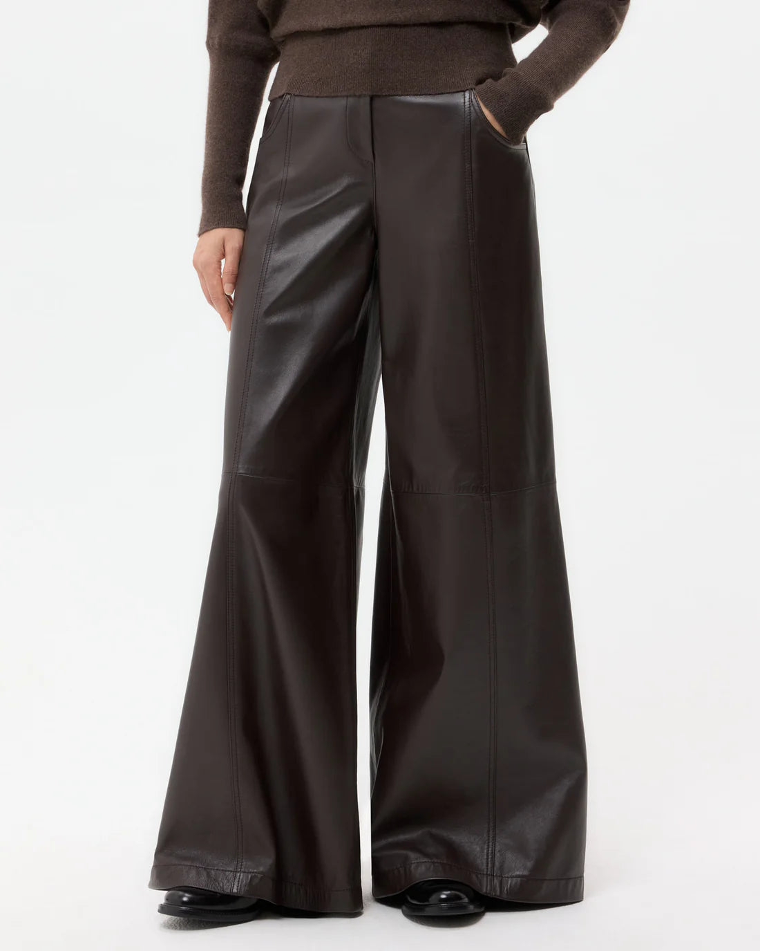 High-rise, floor length pants in Nappa lamb leather. The Demie is a flat-front, wide leg pant, complete with a zip-fly, hook and eye fastening, belt loops, side pocket and back welt pocket.