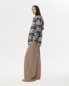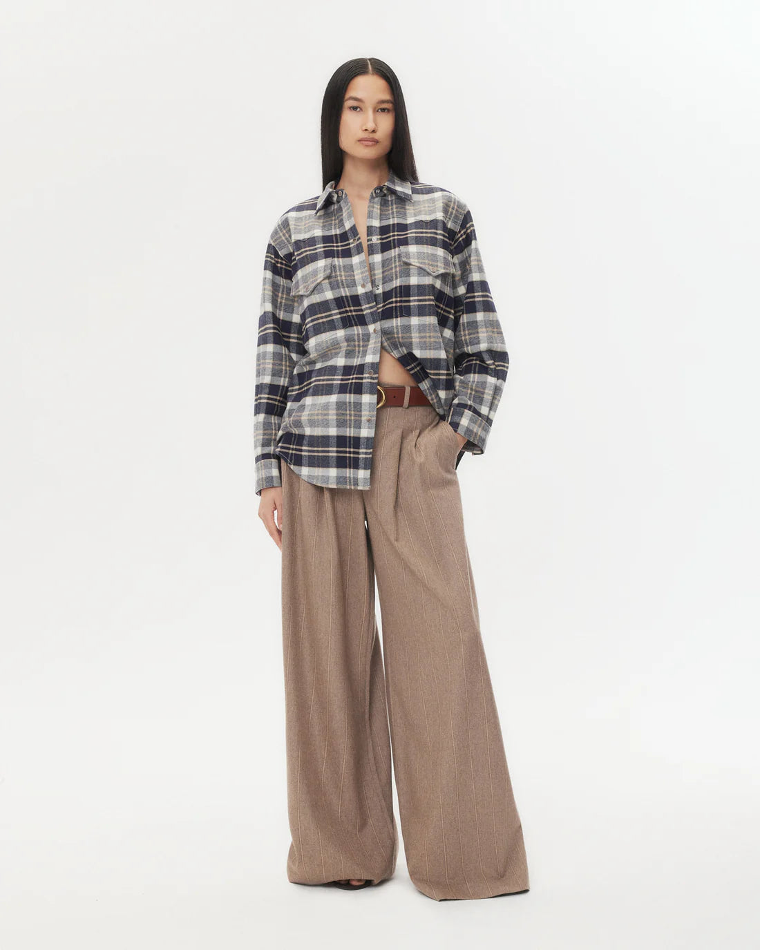 Oversized, western inspired work shirt in cotton flannel. Fabric is 100% cotton plaid with a 3-ply weave for softness, drape, and a cashmere-flannel finish. Utility details: chest flap pockets, a snap button placket and front yoke. Complete with button cuffs and contrast stitching at the seams.