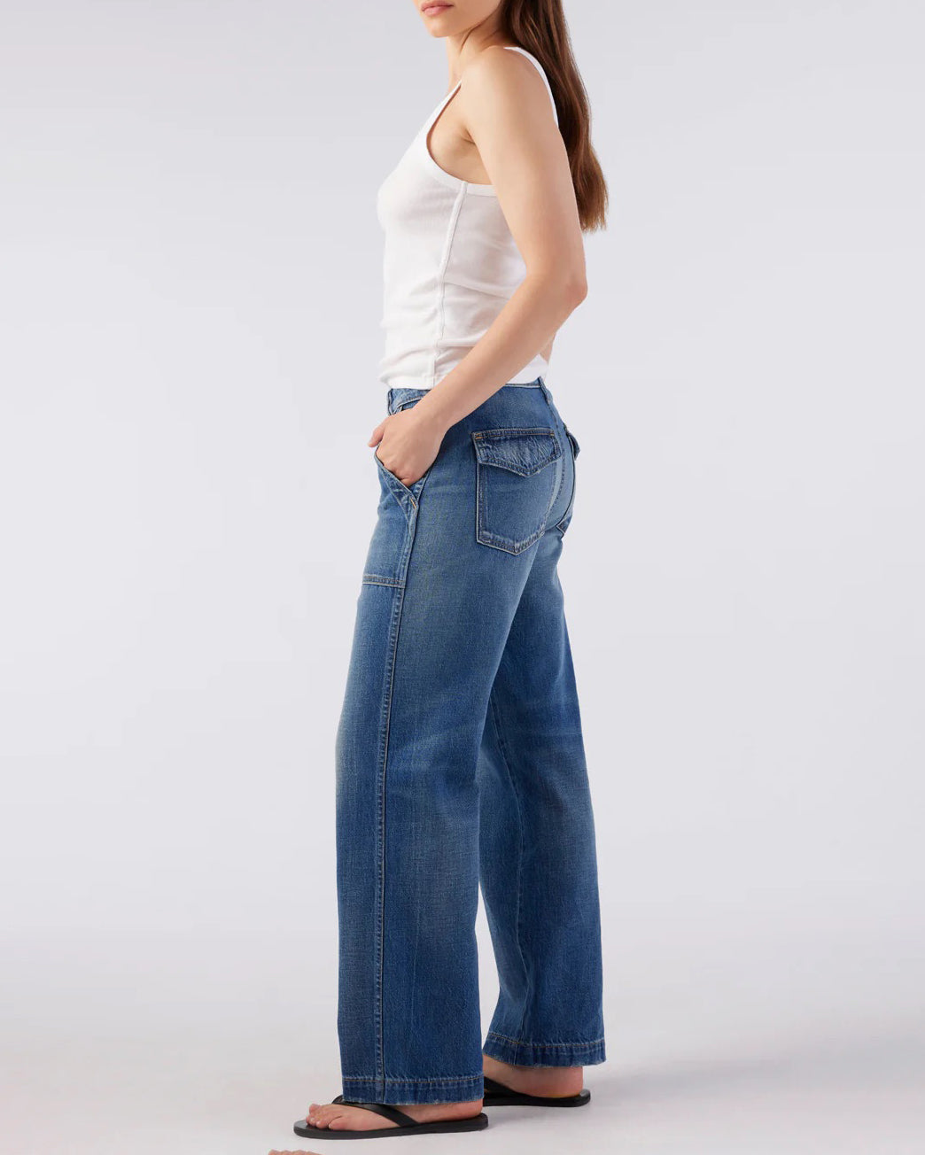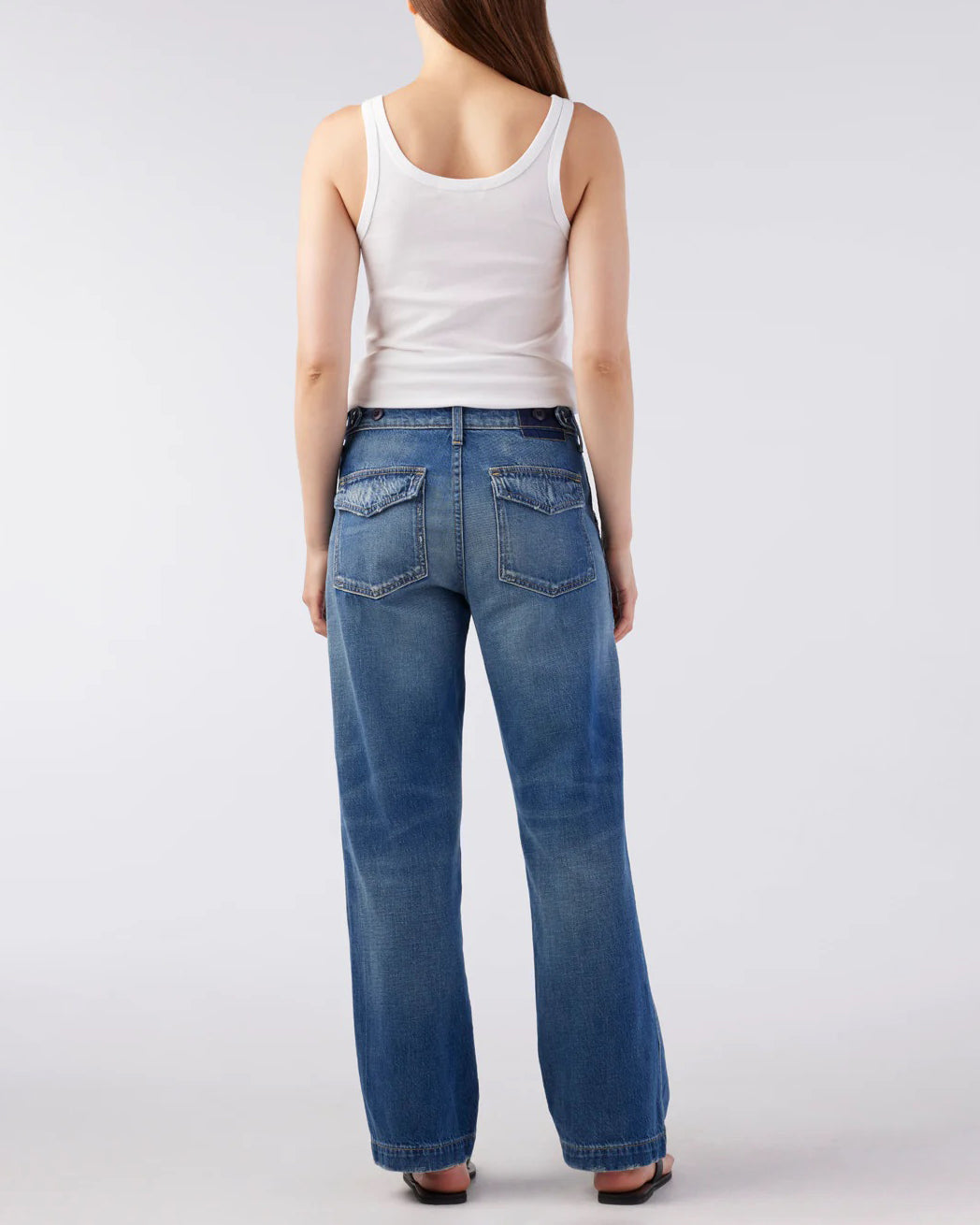 Our latest take on our classic Easy Army Trouser. Slightly more oversized with a wider, straight leg and a full inseam, these trousers offer a new twist on one of your favorites. Featuring military inspired front patch pockets and patch and flap pockets at the back. Plus, waistband tabs have been added for versatility, allowing you to cinch them at the waist or extend for a more boyish look. Trouser hem. Zip fly.
