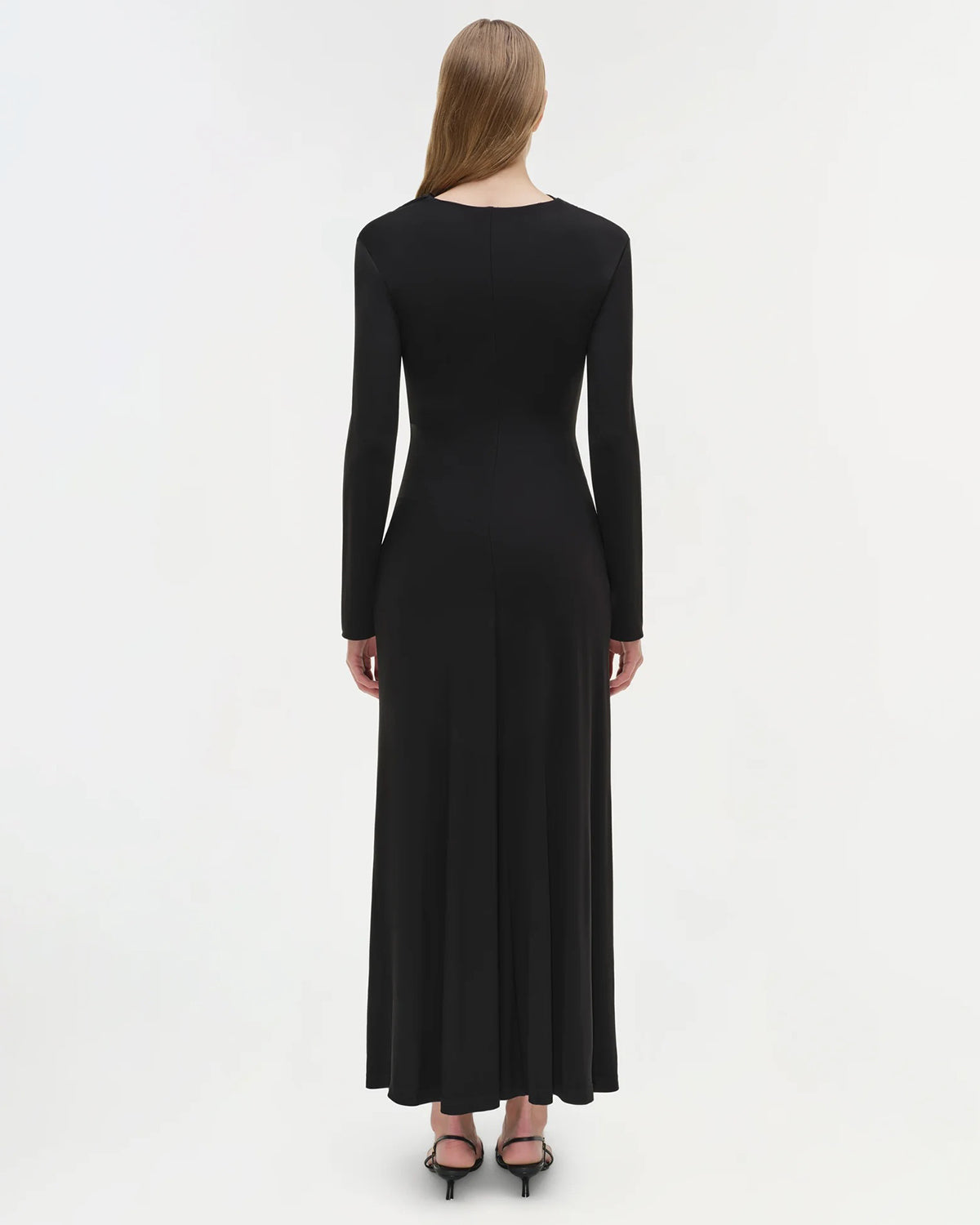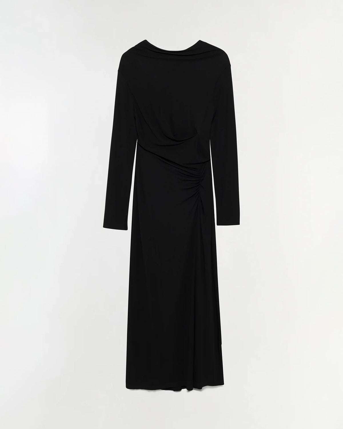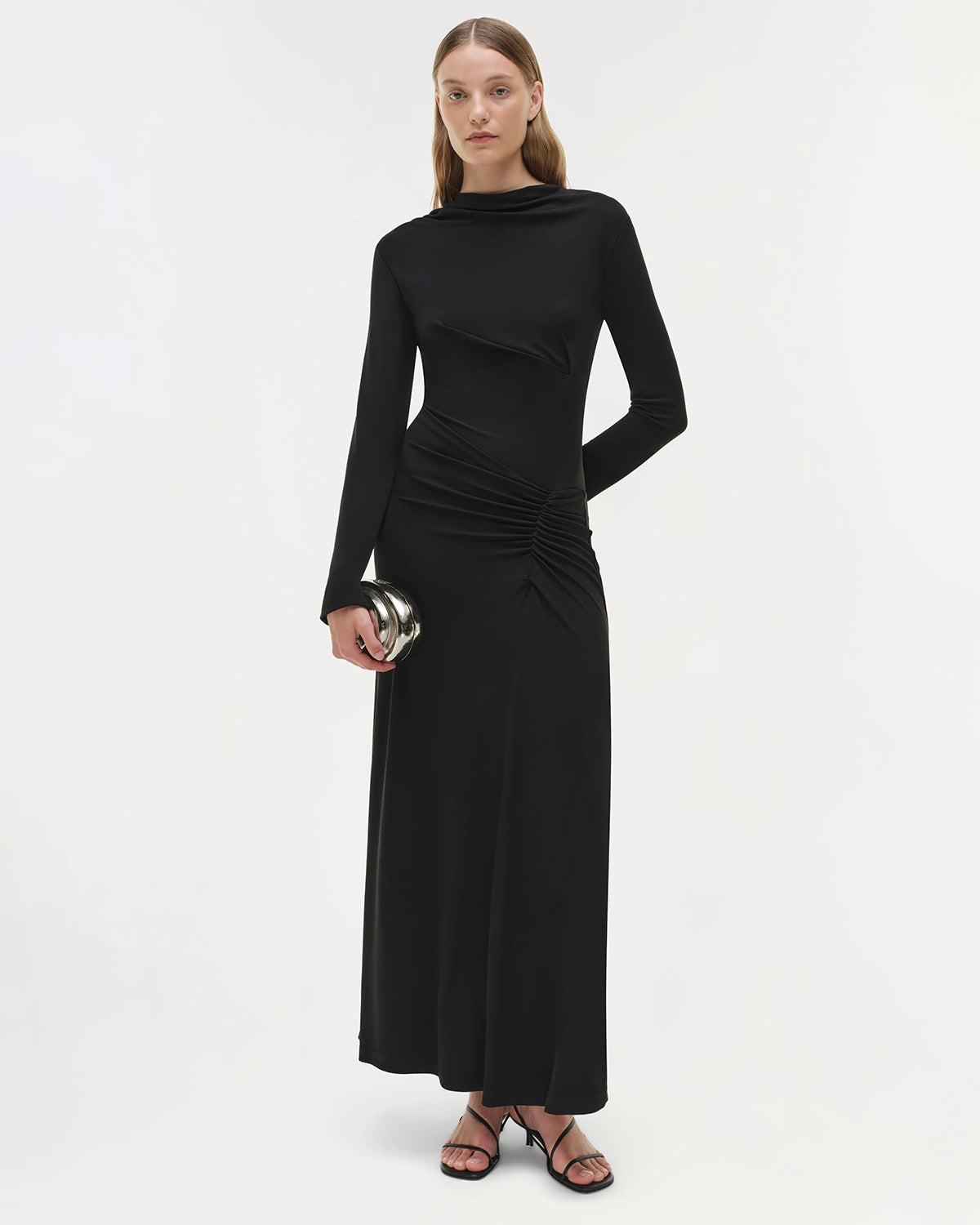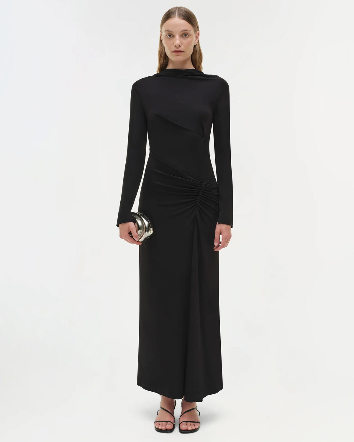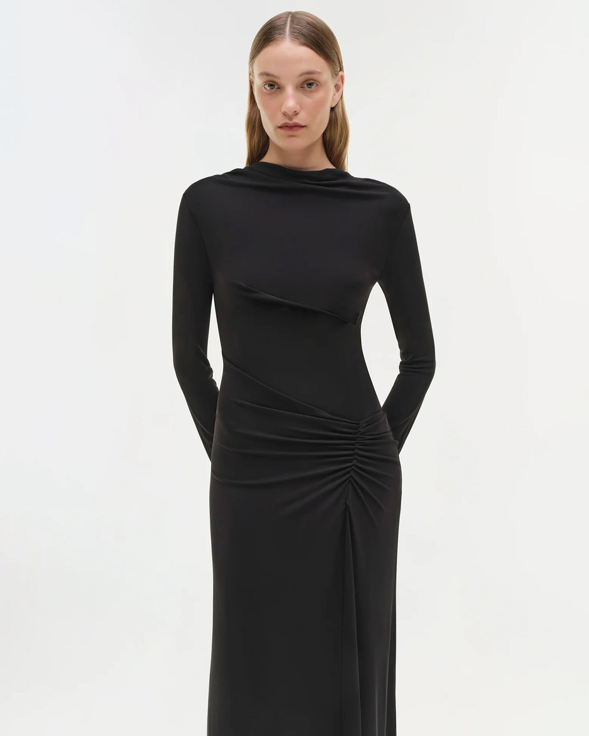 This long-sleeve midi in draped jersey features an artful, figure-flattering silhouette, embodying understated elegance with a modern twist.