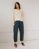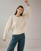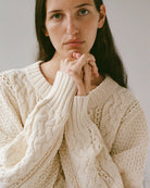 Our classic cable knit is an essential in our cool weather wardrobe, with a subtly boxy, oversized fit for the perfect relaxed cut. Crafted in Organic Cotton that is durable, soft and breathable. This cable knit pattern is inspired by a beloved Irish Aran cable sweater in our designer's wardrobe. Each cable historically represents the safe return of the fisherman and good luck during the day. This knit features a honeycomb pattern, which represents the hard work and diligence of bees, the diamond pattern represents wealth and the cables signify the ropes of the fisherman's boats for luck.