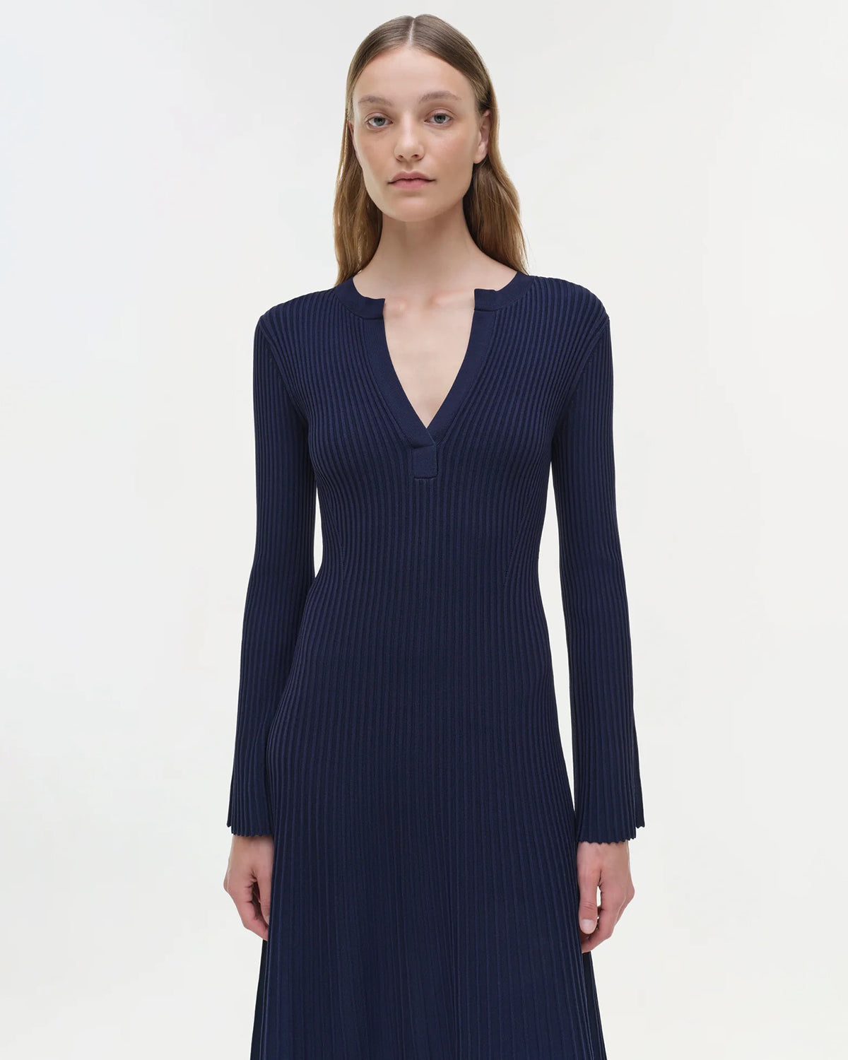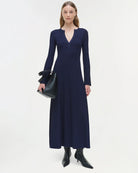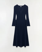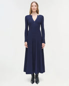 A midi dress in luxurious matte knit that artfully drapes the form. V-neckline, cinched waist, and long bell sleeves.