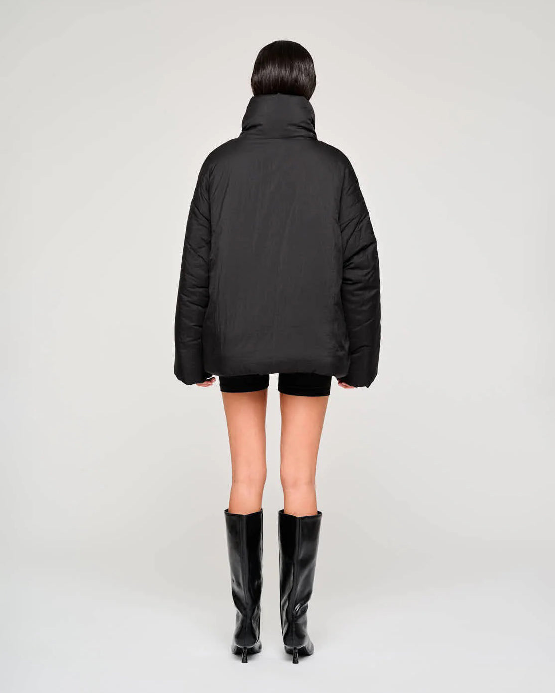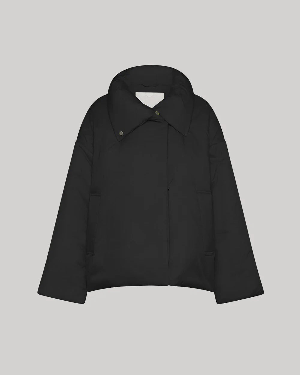 Oversized fit, short down jacket made of extra-soft nylon. The minimalist design is enhanced by a double-breasted closure with hidden buttons and an adjustable high collar with buttons, ensuring comfort and protection on cold days. The side pockets on the front complete the garment with a practical and functional detail.