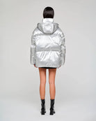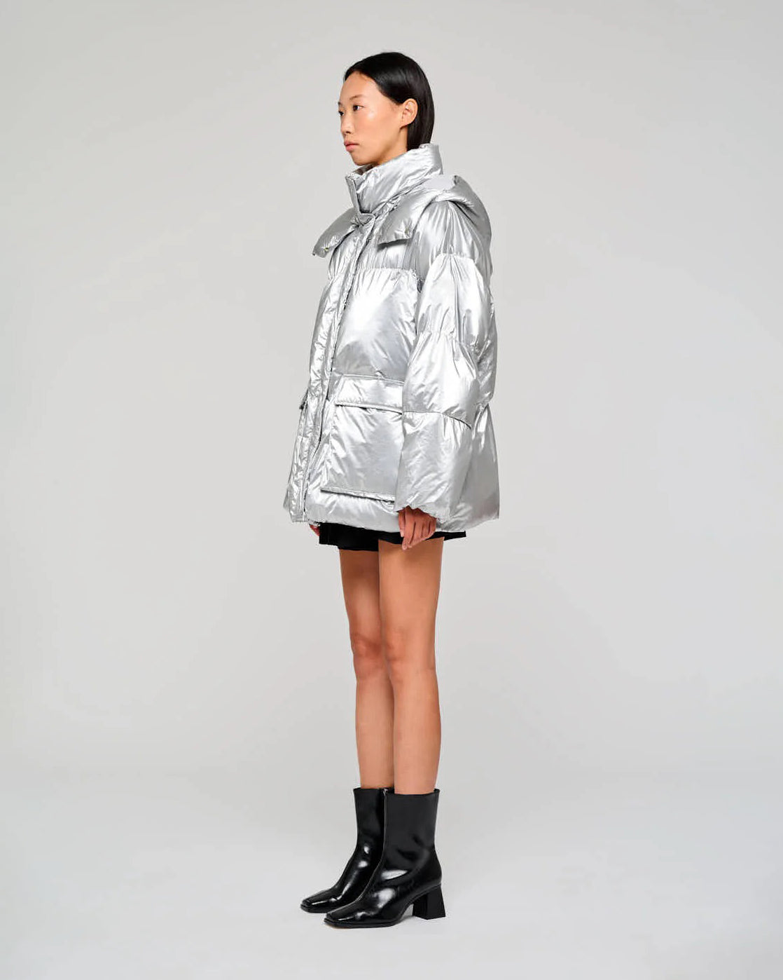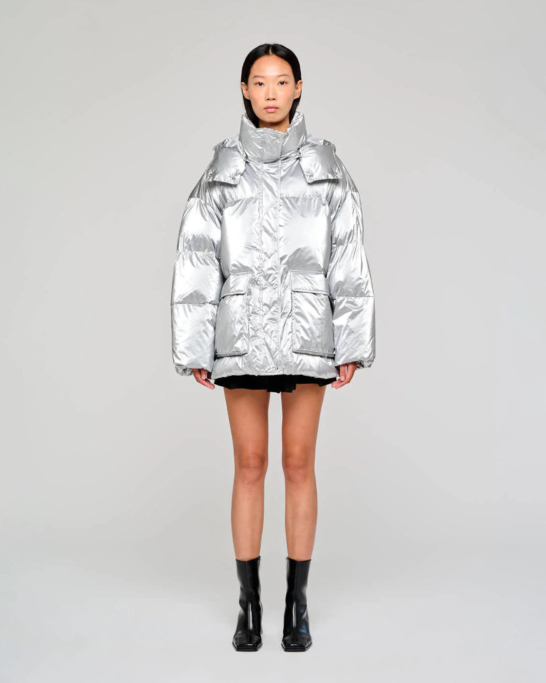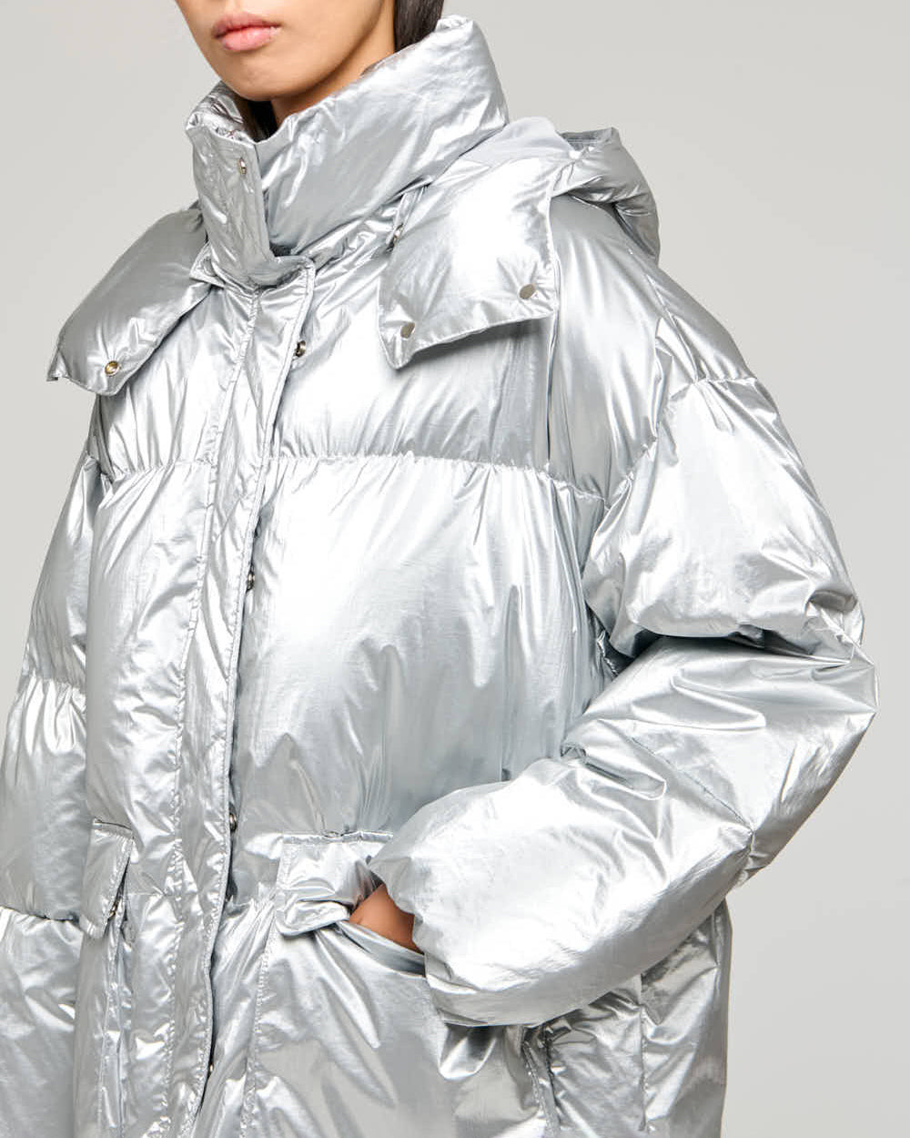 Padded jacket with a soft fit, made of water-repellent nylon. The simple design is enhanced by a high, wrap-around collar and a removable hood with front flaps that allow it to be fully closed at the neck, offering optimal protection from the cold and wind. The front button closure, while deep pockets with flaps and buttons, add everyday functionality. The loose-fitting sleeves complete this practical and contemporary piece.