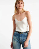 Slim camisole in silk charmeuse. Adjustable skinny straps. Shirt tale detail at hem.