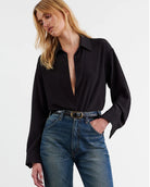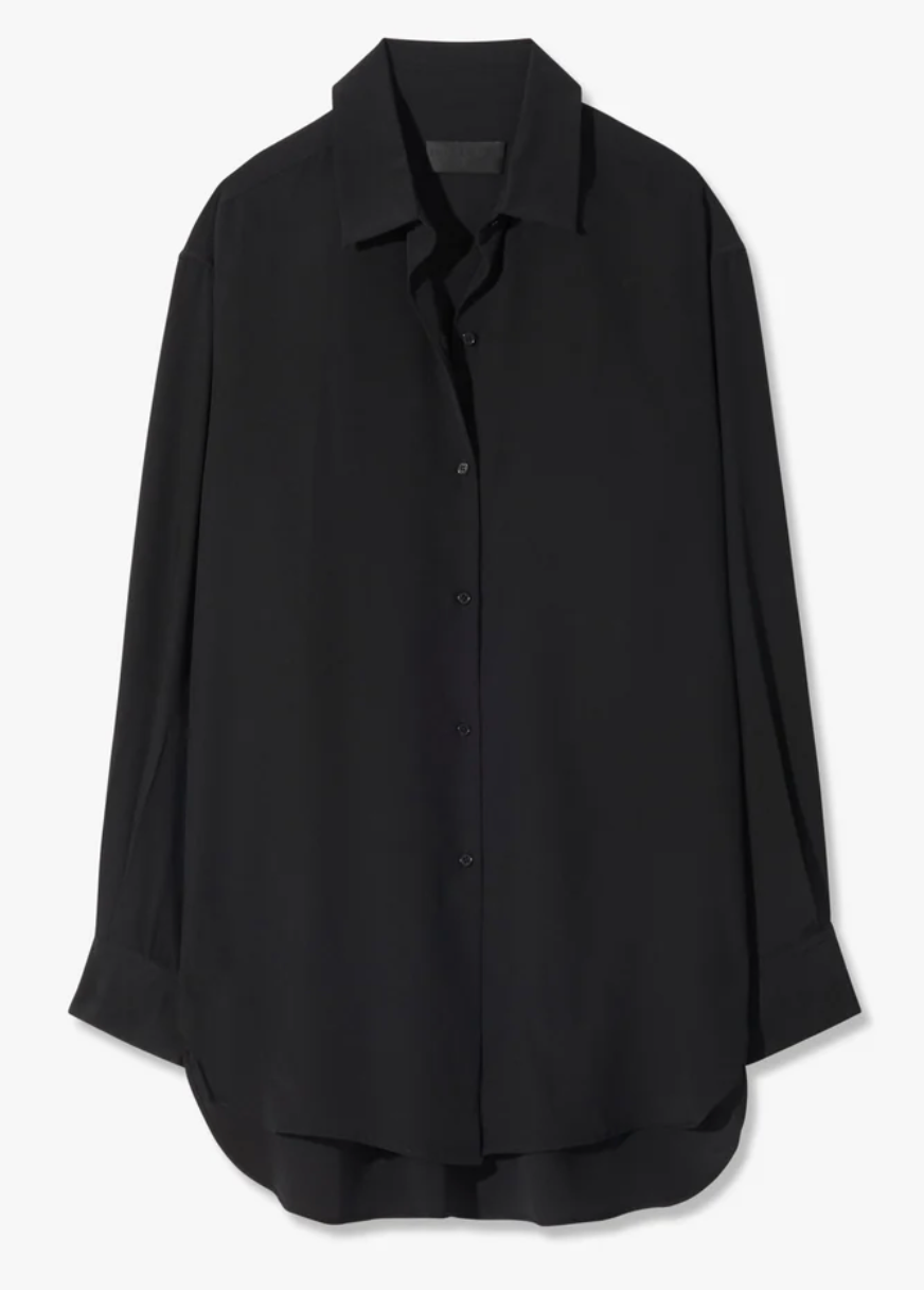 Oversized long-sleeved button-front shirt in fluid silk crepe de chine. Dropped shoulder. Spread collar. Shirred back yoke. Curved shirttail hem. Minimally styled with clean front and tonal buttons.