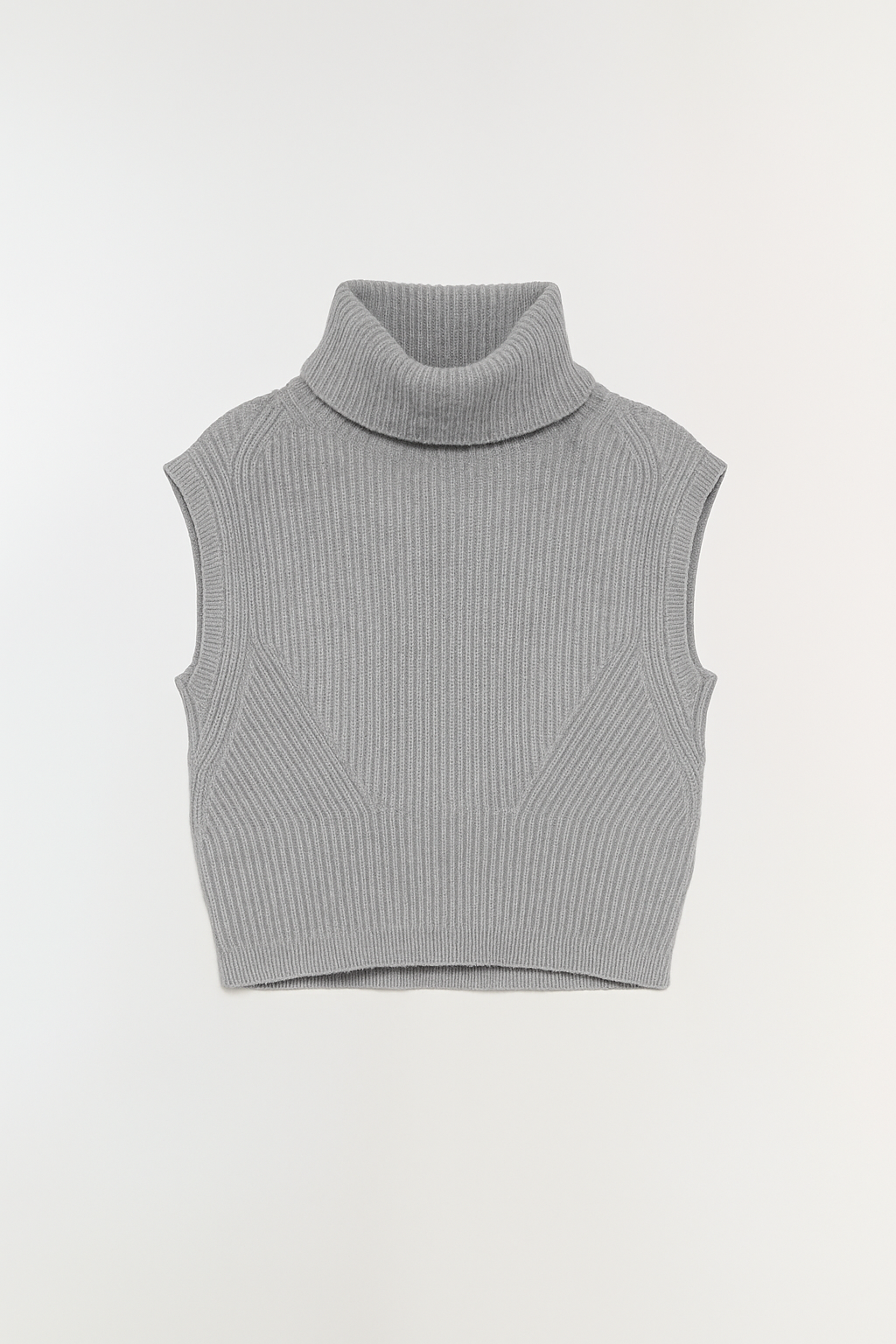 A wool cashmere blend sleeveless top that features a turtleneck and barely grazed shoulders.