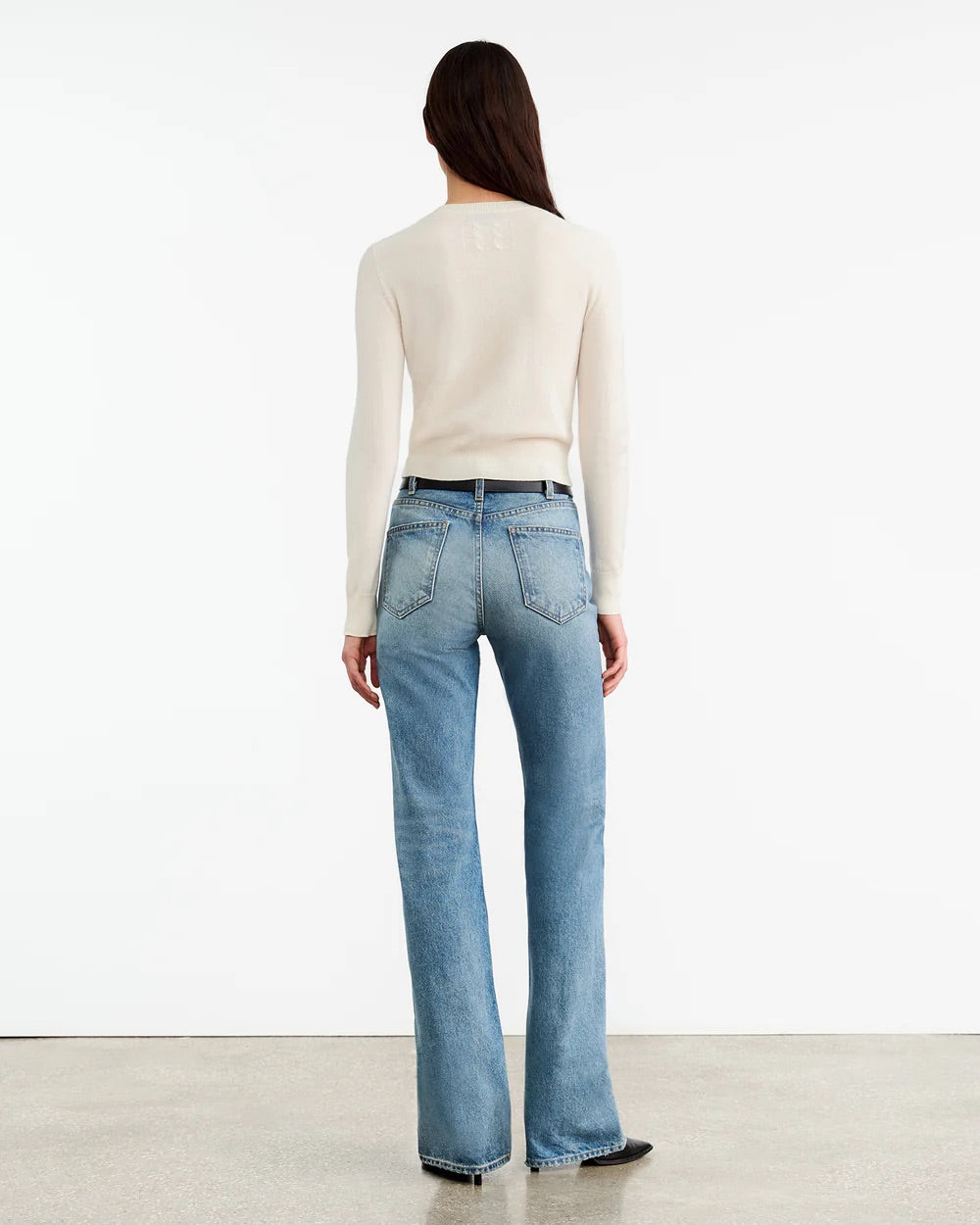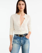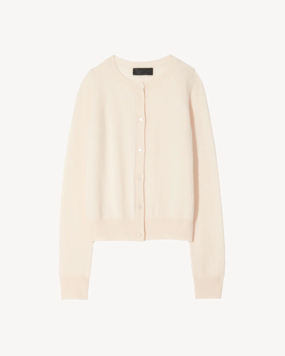 Light to medium weight cardigan. Six button center front closure. Fully fashioned along neck, sleeve and arm hole. Center back signature cable knit detail.