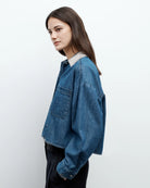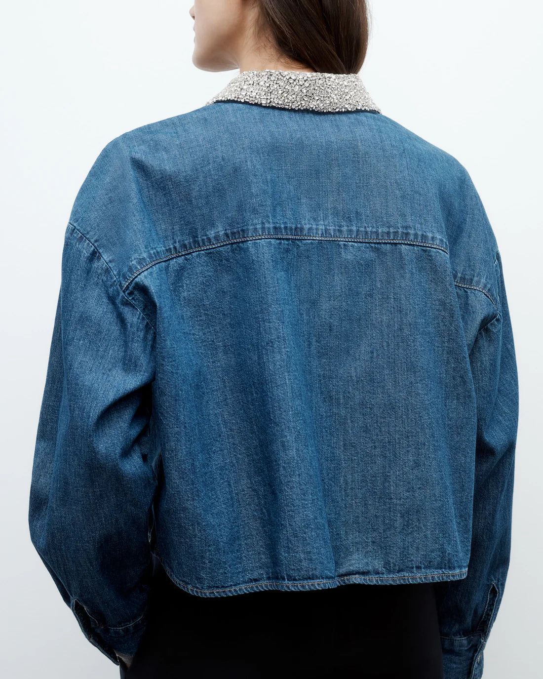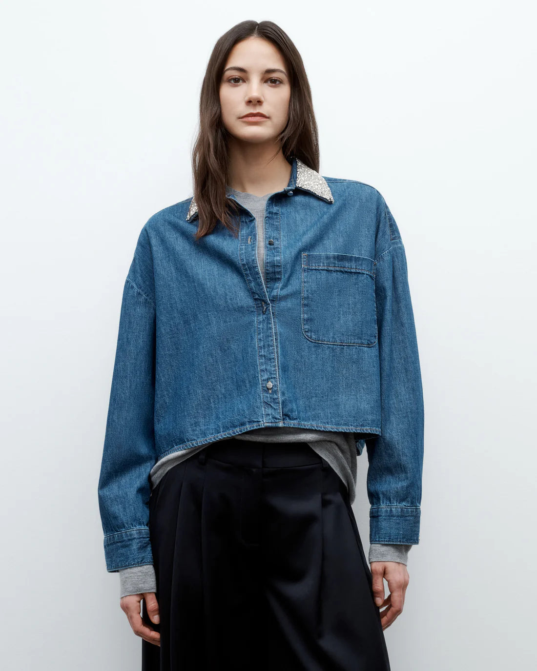 Cropped long sleeve work shirt in denim shirting, embellished with a prong-set crystal collar. My Ex’s Denim is a boxy silhouette. Complete with a button up placket, chest patch pocket, single button cuffs and custom rivet hardware.