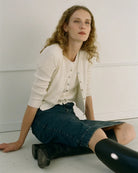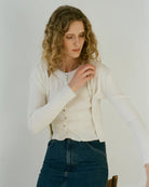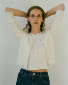 Designed for versatility and ease of wear, our Nolita Cardigan features a V neck with button up front in a soft rib knit. The Nolita Cardigan goes with the curve of the body and can be worn alone as a top or layered as a light transitional sweater. Salt is a classic warm white.