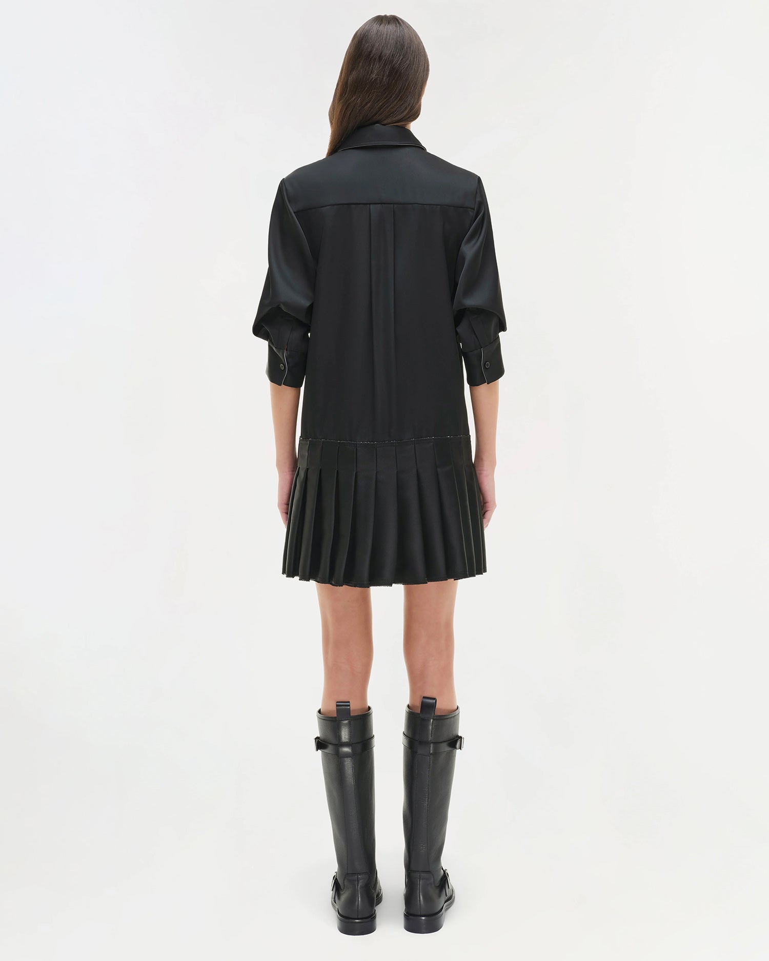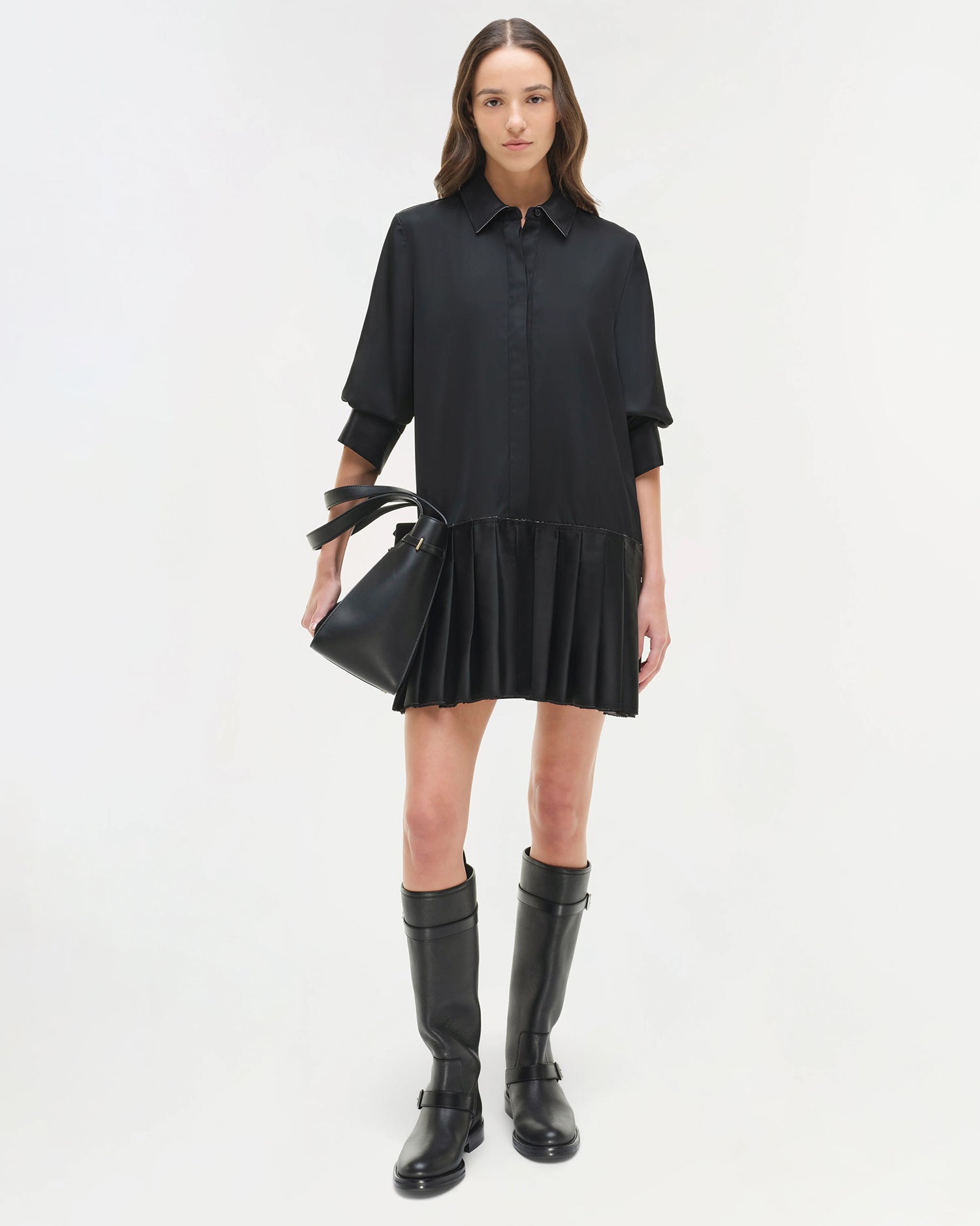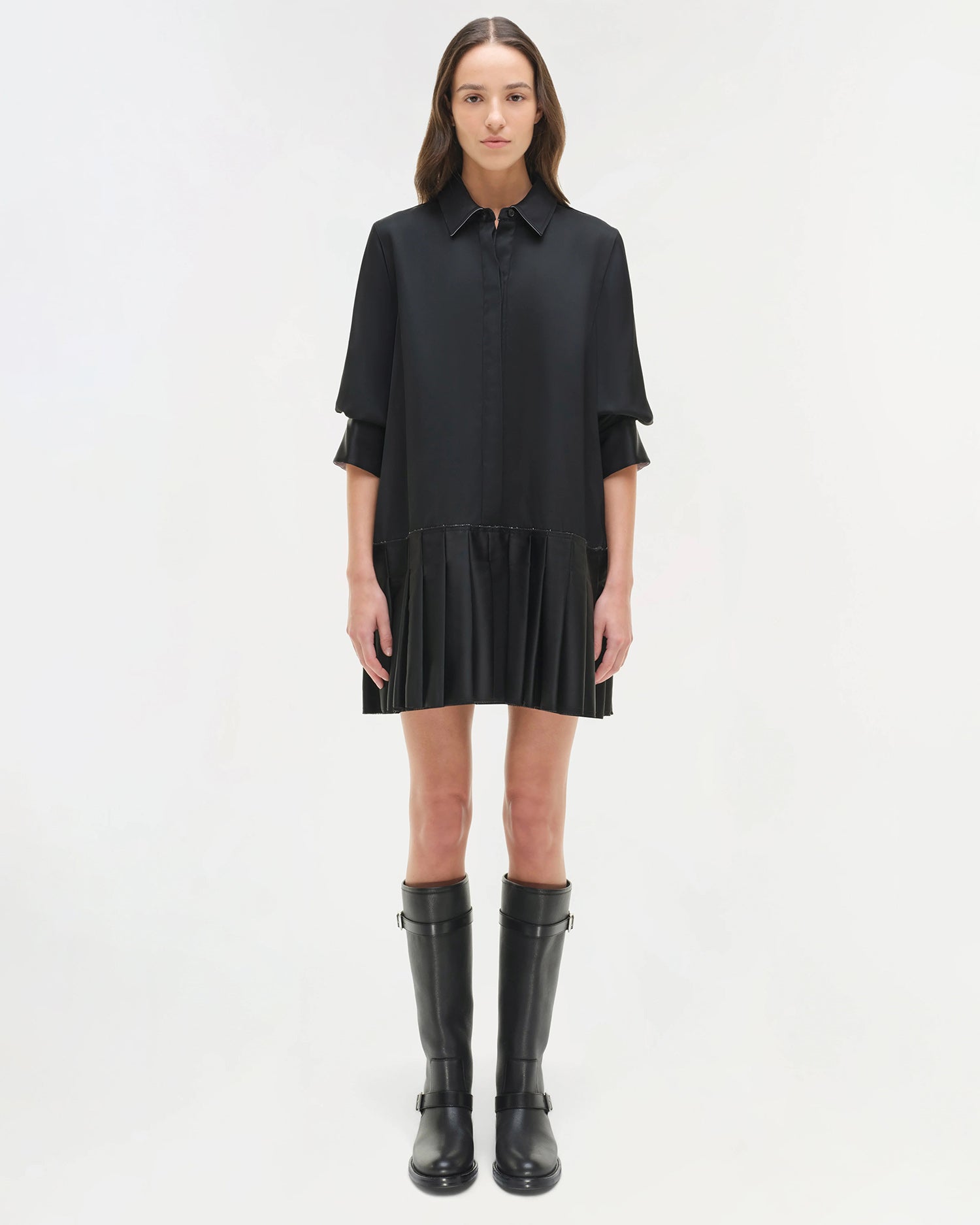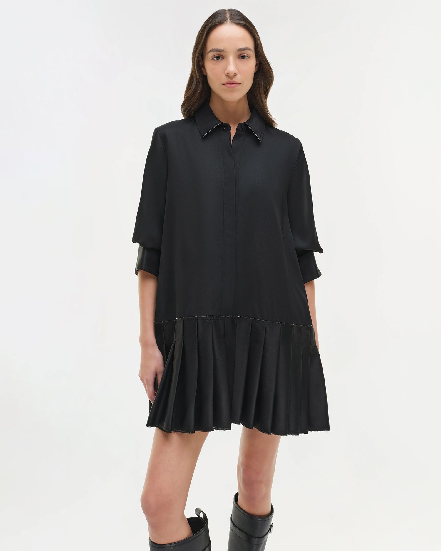 A mini shirt dress that combines a classic spread collar and hidden button front closure with an updated drop waist and pleated skirt in twill for structure.