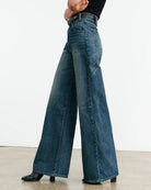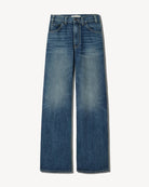 High-waist jean in Japanese non-stretch denim. Five pocket detail. Straight wide leg. Zip fly. Shank closure. Belt loops at waistband.