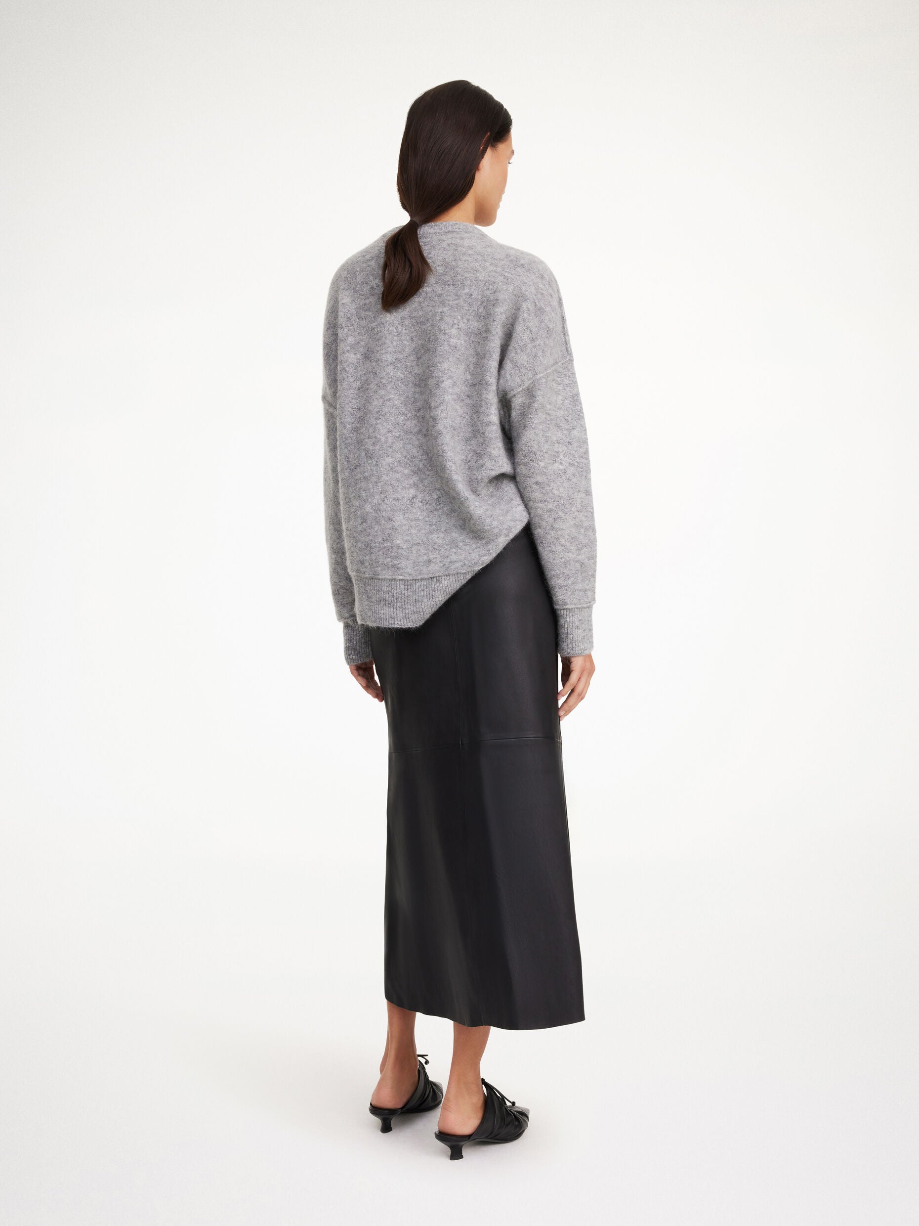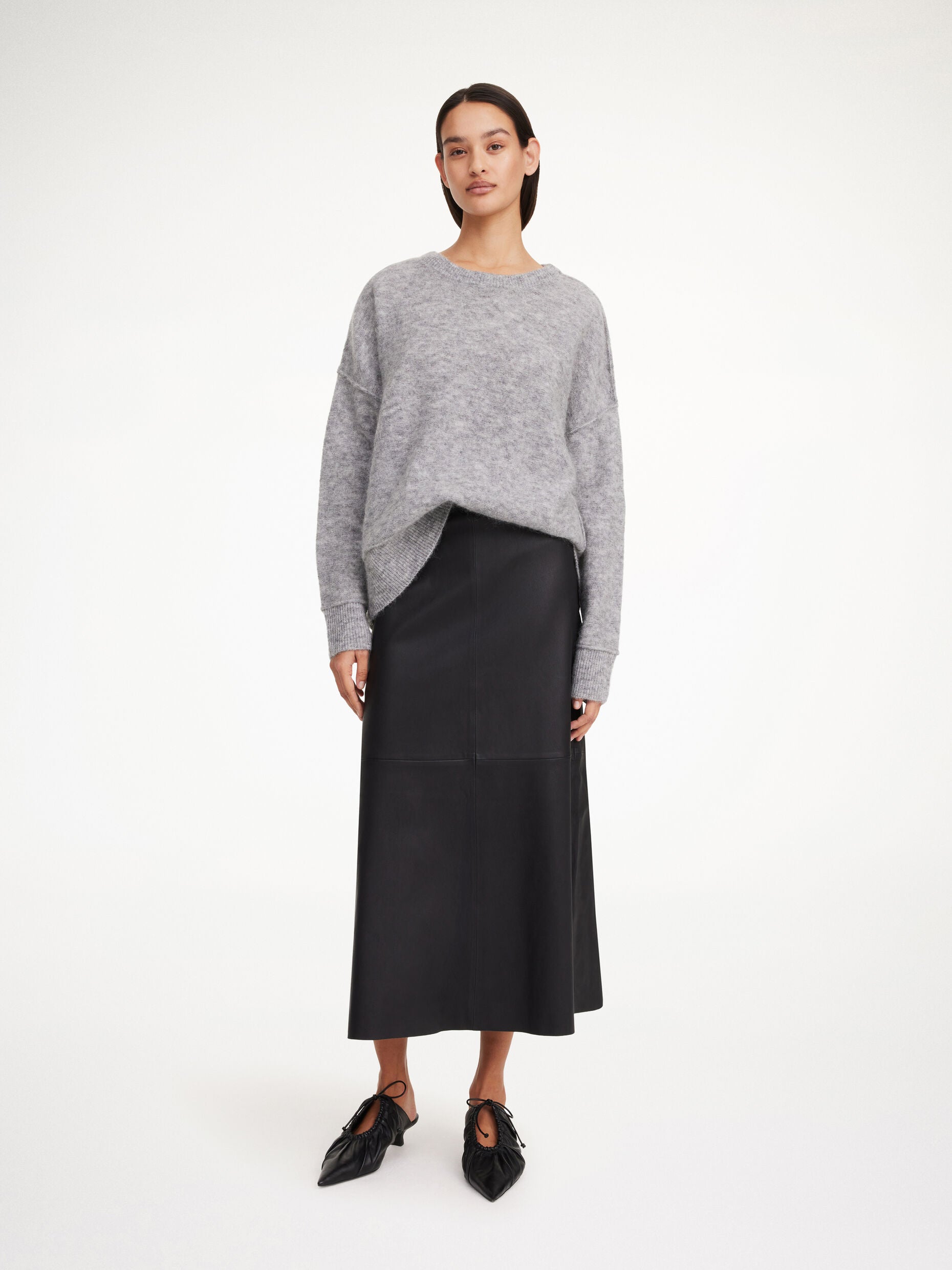 By Malene Birger Simoas skirt crafted from soft lamb leather. It features an elastic waist and a slim fit before falling to a subtly flared mid-length hemline. Add a boxy blazer for an afternoon appointment.