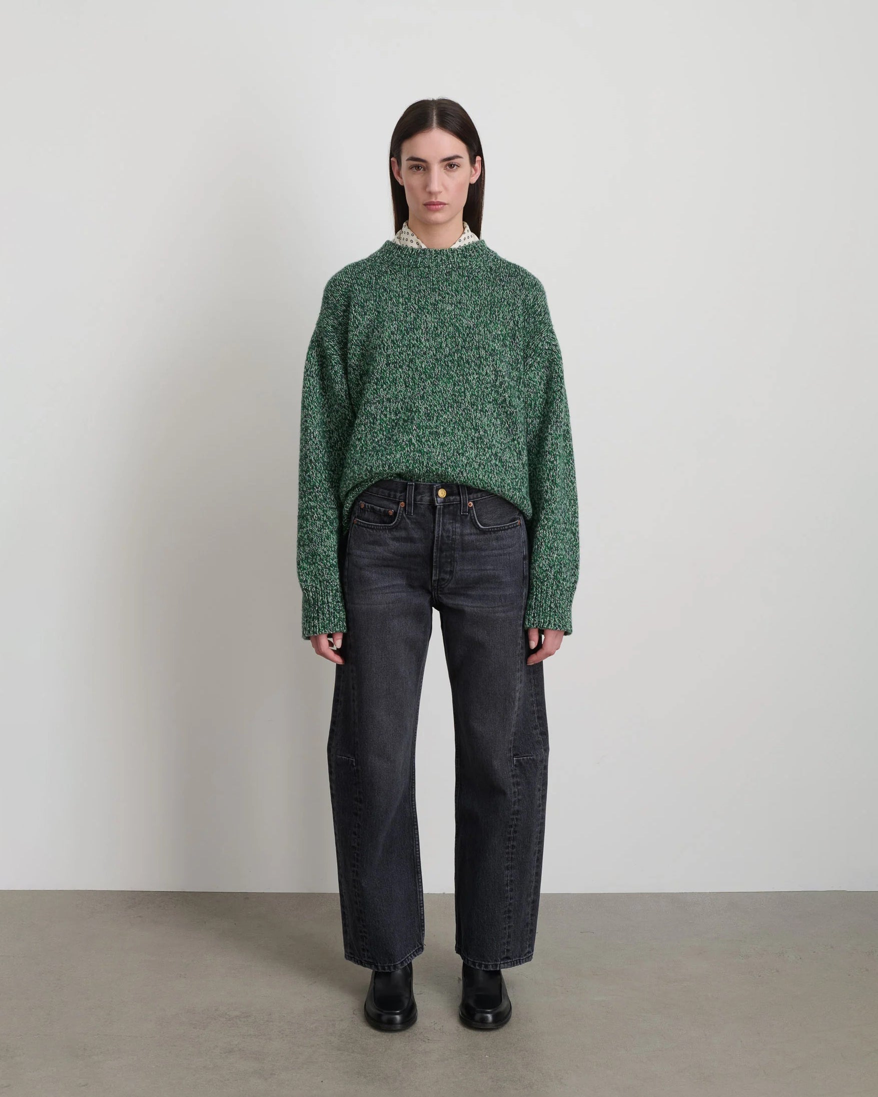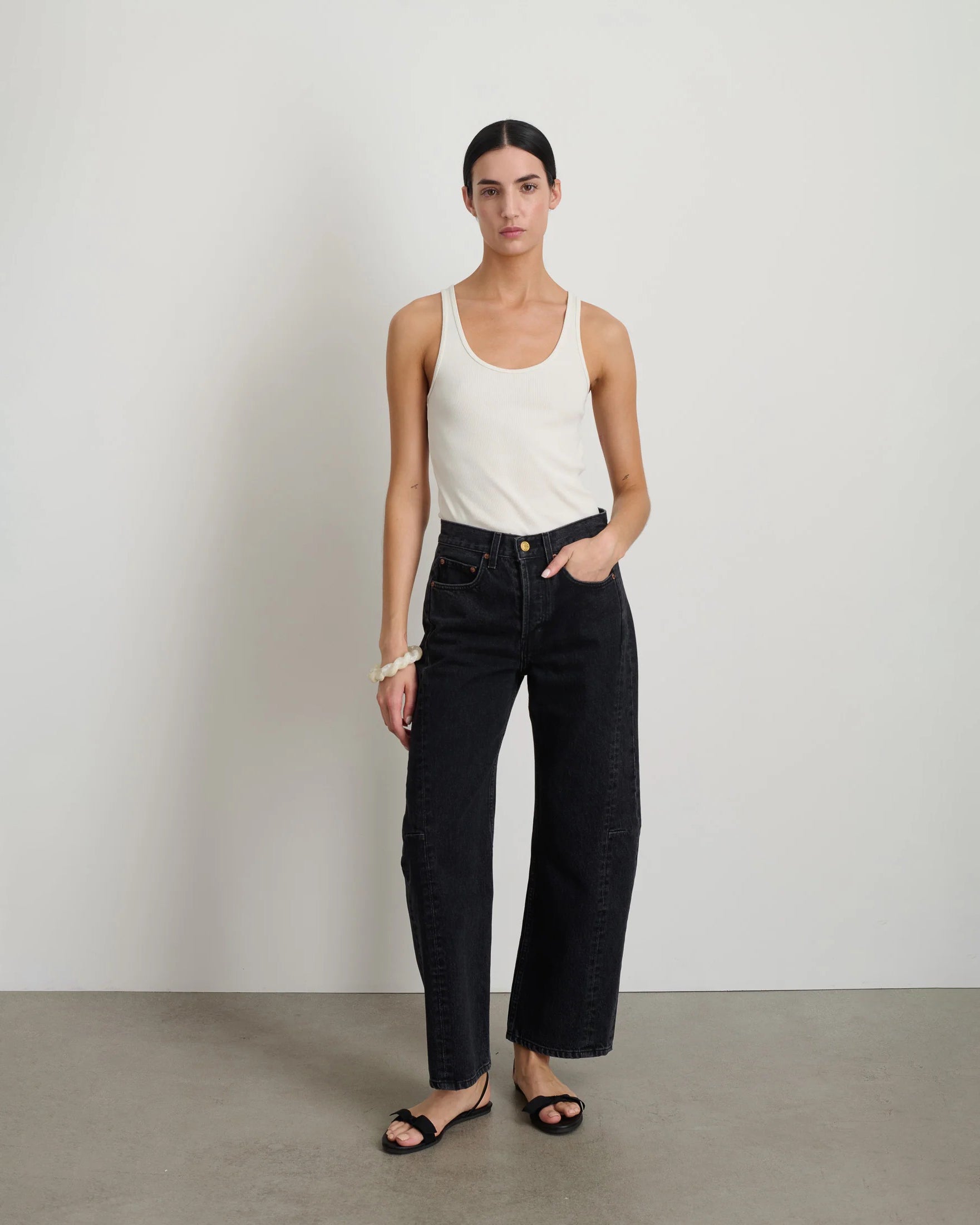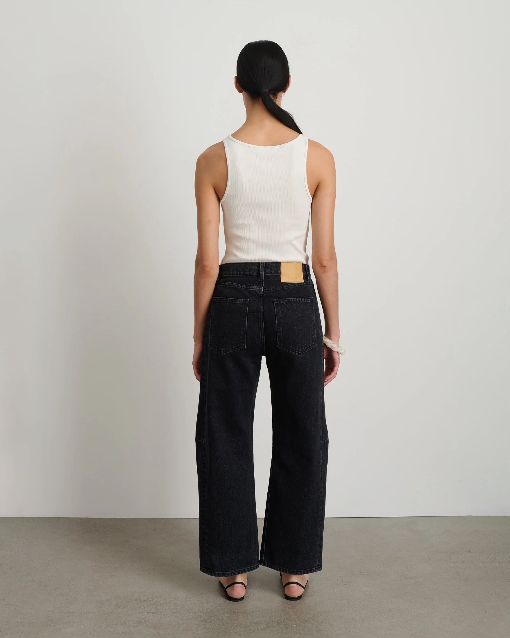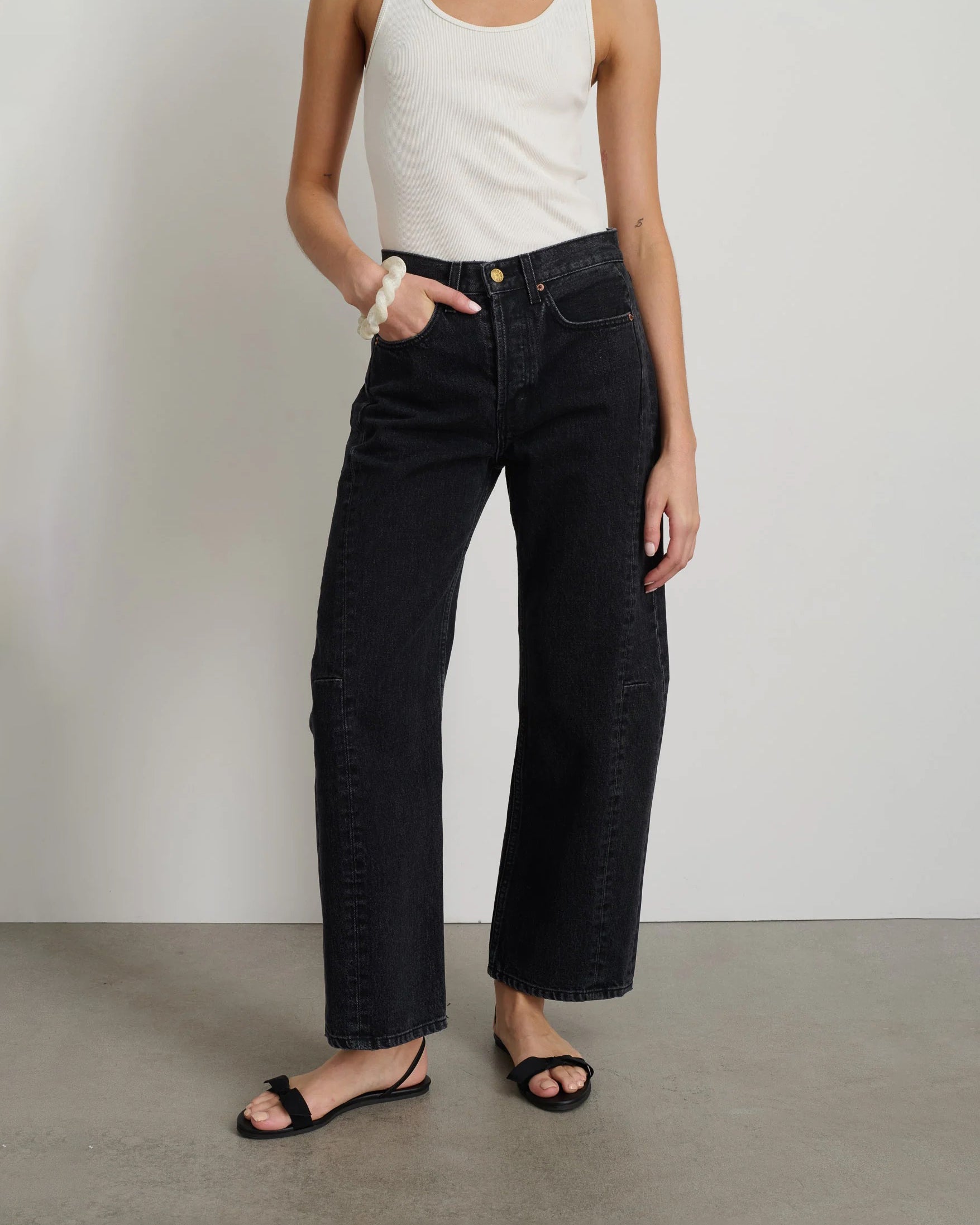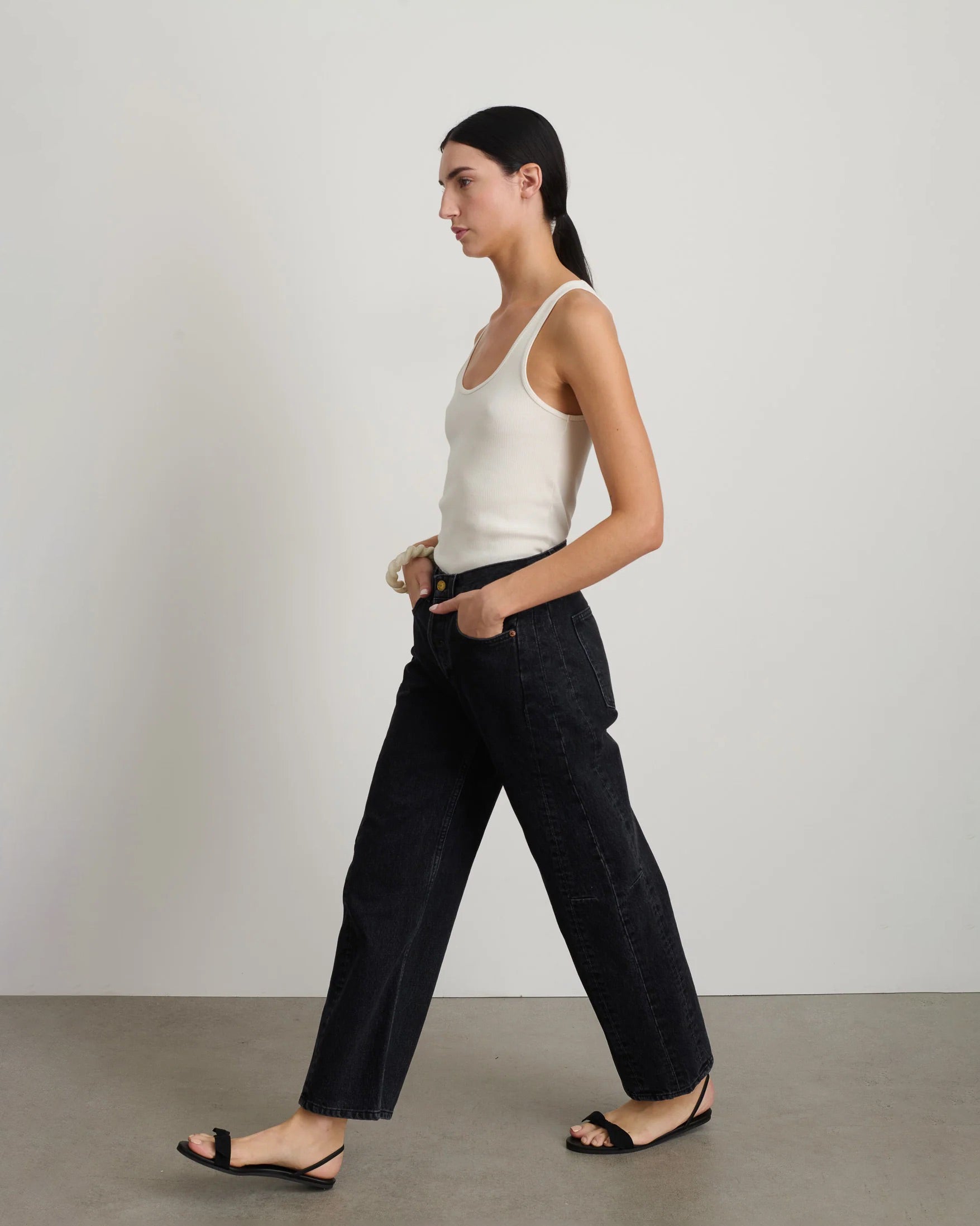 Original Lasso Jean cut from heavy cotton rich denim, that has been washed way down to a matte black with a peached handfeel-- then finished for a relaxed structured look. Designed to sit at the natural waist with a pieced outseam, kinked leg shape and finished hem.