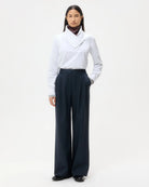 High-rise, wide-leg trousers in stretch wool. Fabric is viscose/wool blend with a touch of stretch for comfort. Relaxed through the hip and leg with front pleats for added volume. Complete with belt loops, side pockets, and a concealed zip-fly with hook-and-eye closure.