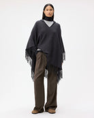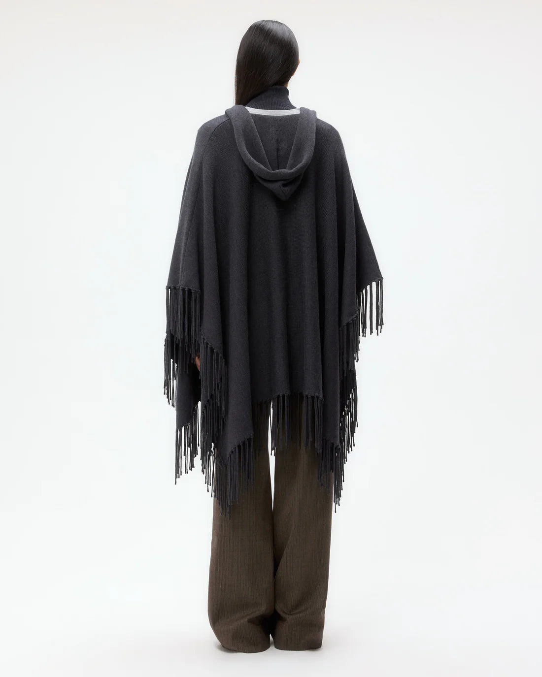 Oversized, V-neck poncho in merino wool. Take Me Home is an asymmetrical silhouette. Complete with a hood and tasselled hem.