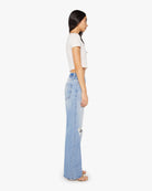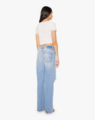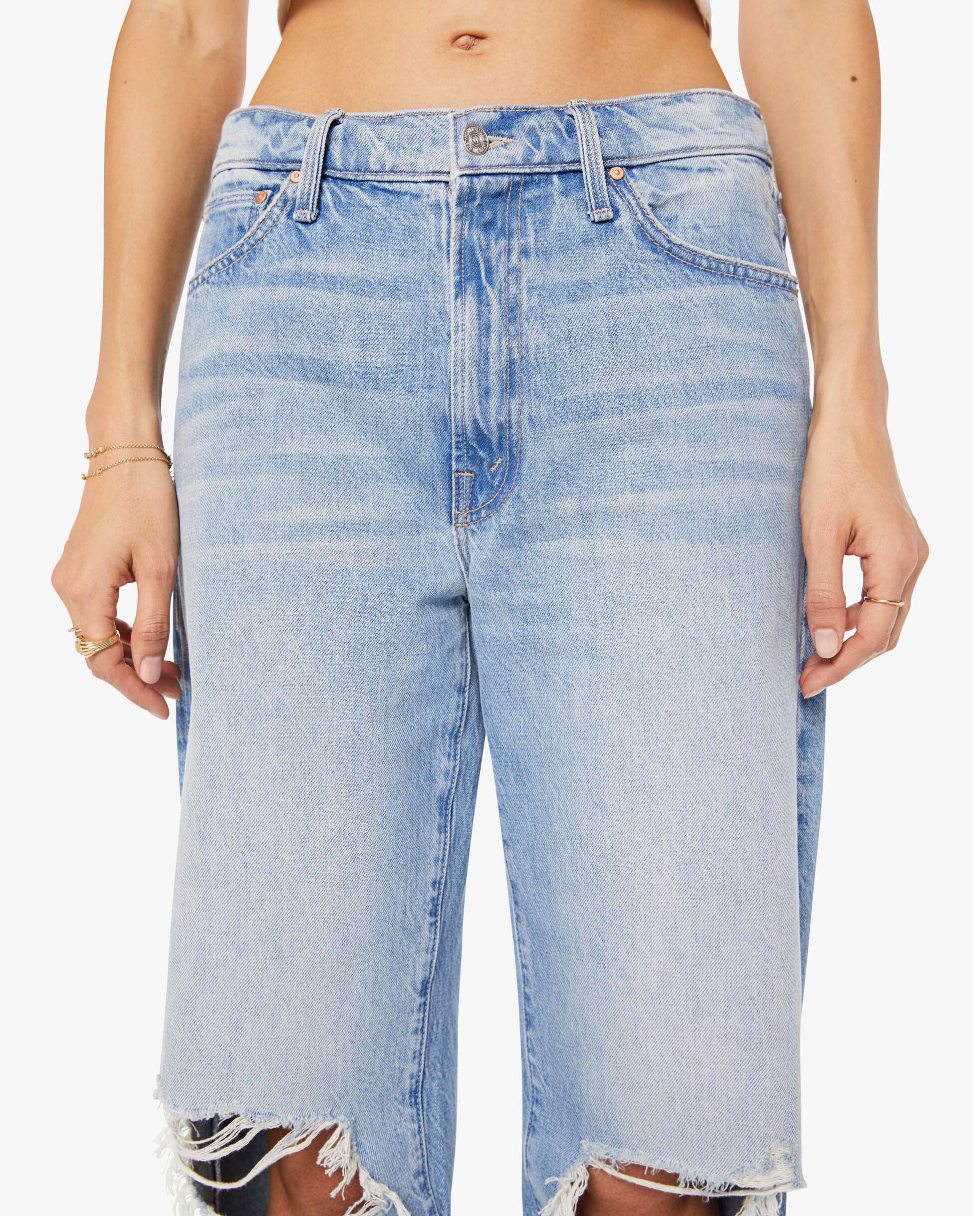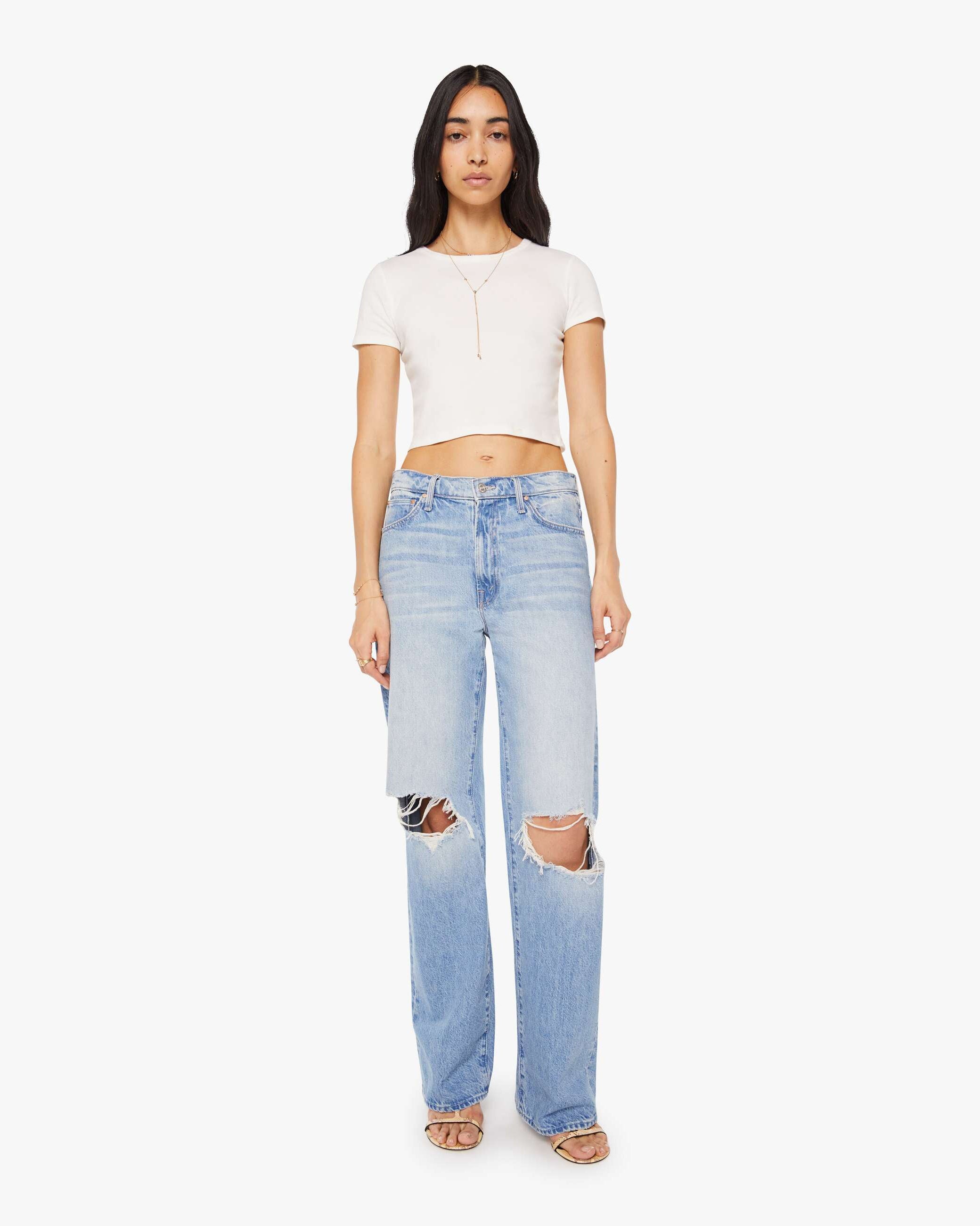 Field research. Jeans designed to sit on the hips with a zip fly, slouchy fit, loose straight leg and a 32-inch inseam with a clean hem. Made from rigid SUPERIOR denim, Floral Frenzy is a light blue with whiskering, fading and tears at the knees.