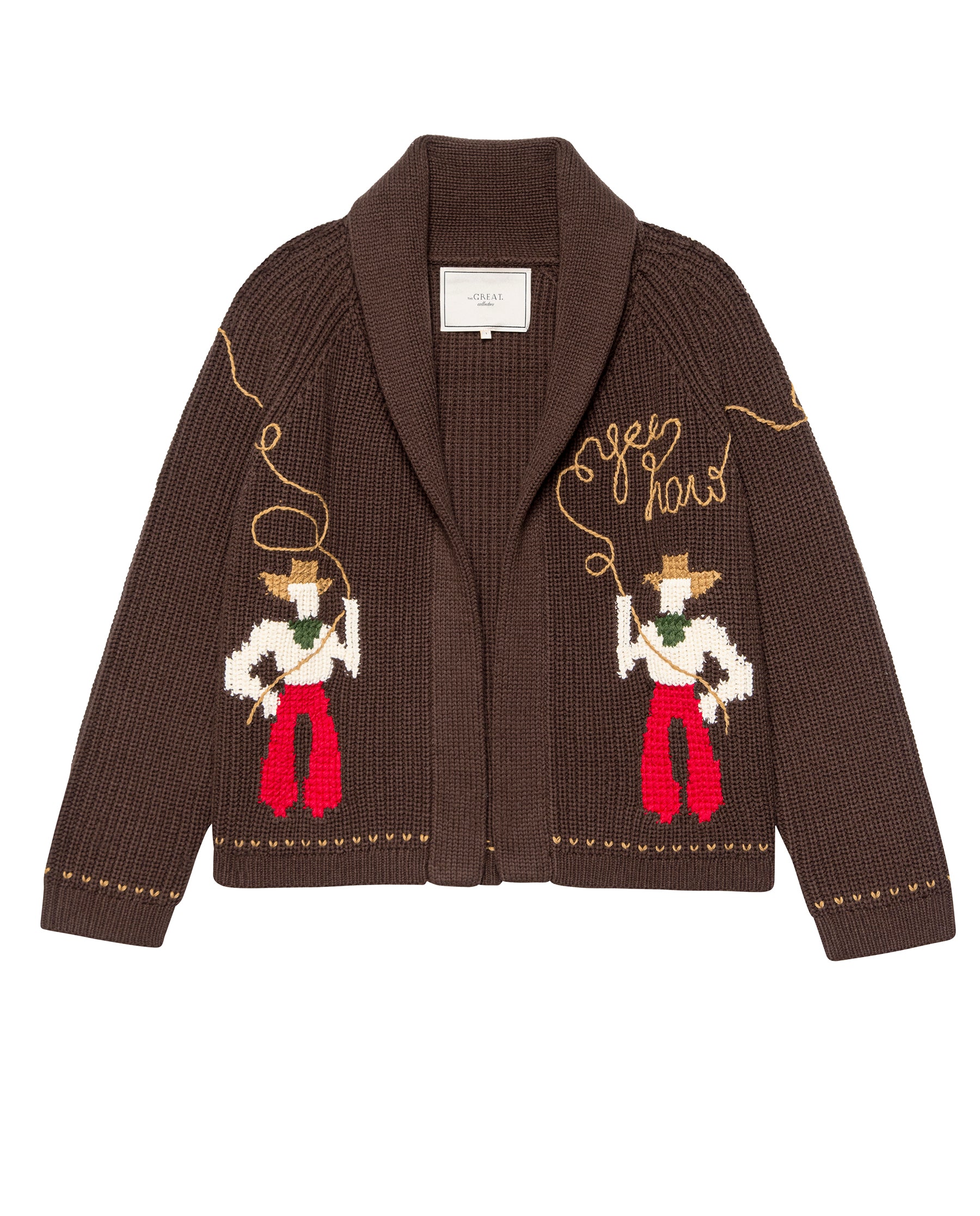 A reimagined version of our signature Lodge Cardigan, this piece features a hand-embroidered cowboy and lasso spelling out “yeehaw”—a playful detail inspired by a 1960s children’s sweater. Spun from a soft cotton blend yarn, it’s cozy, comfortable, and full of character. Designed with ease throughout the body. For a closer fit, we recommend sizing down.