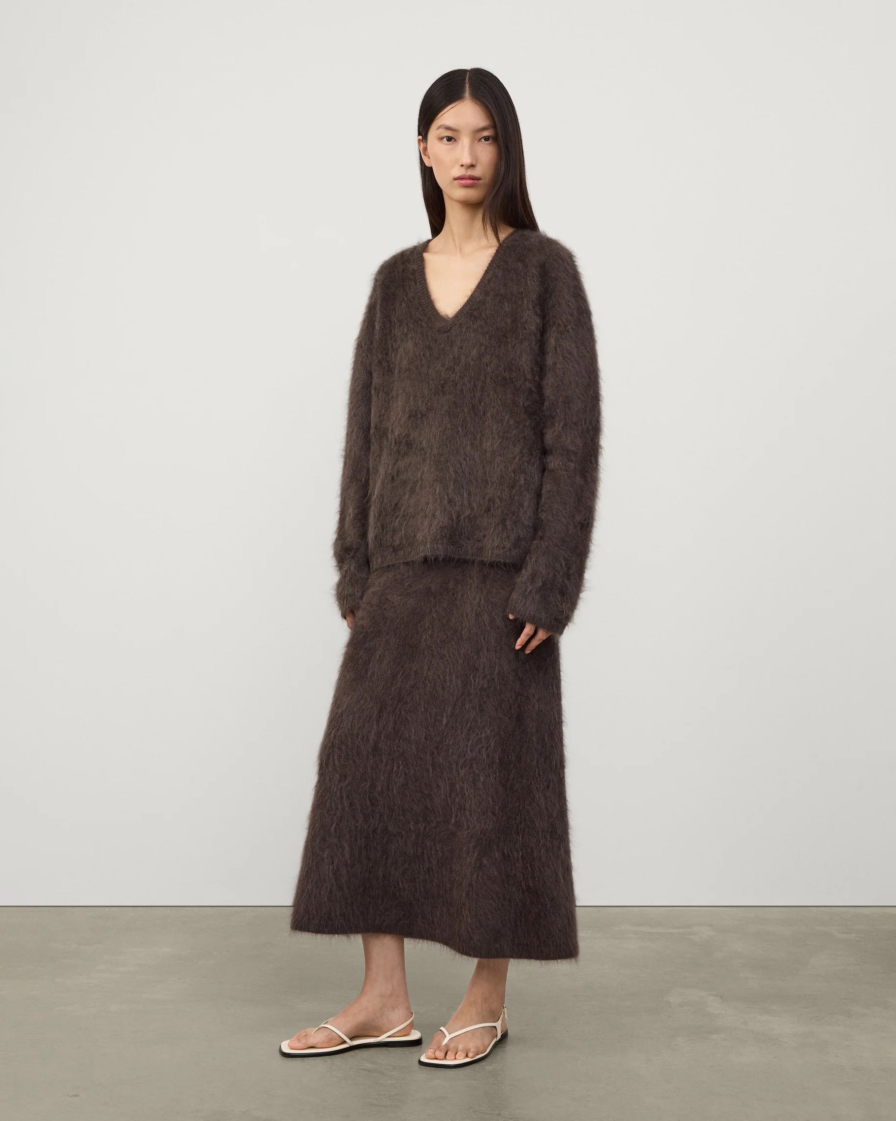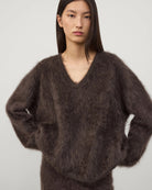 The Margareta sweater has an elegant v-neckline that's framed by a relaxed silhouette and full, long sleeves. Detailed by slim trims, the brushed cashmere makes this a subtle, standalone piece for Autumn and Winter.