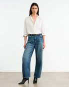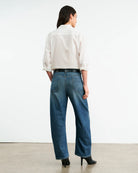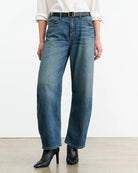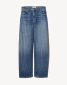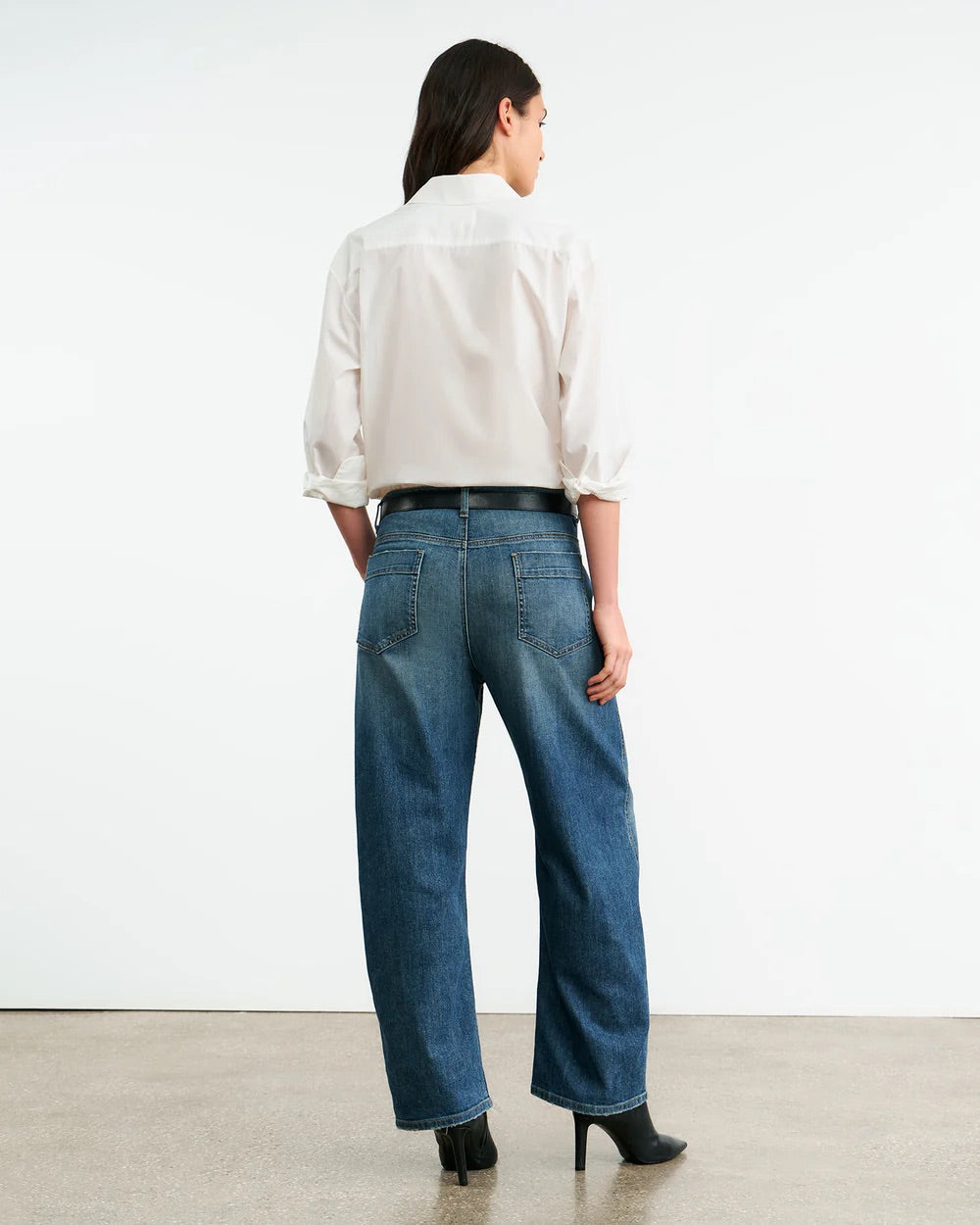 Mid-rise jean. Curved silhouette. Belt loops. Front slant pockets. Coin pocket detail. Zip fly. Shank closure. Back patch pockets with topstitching.