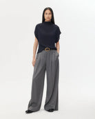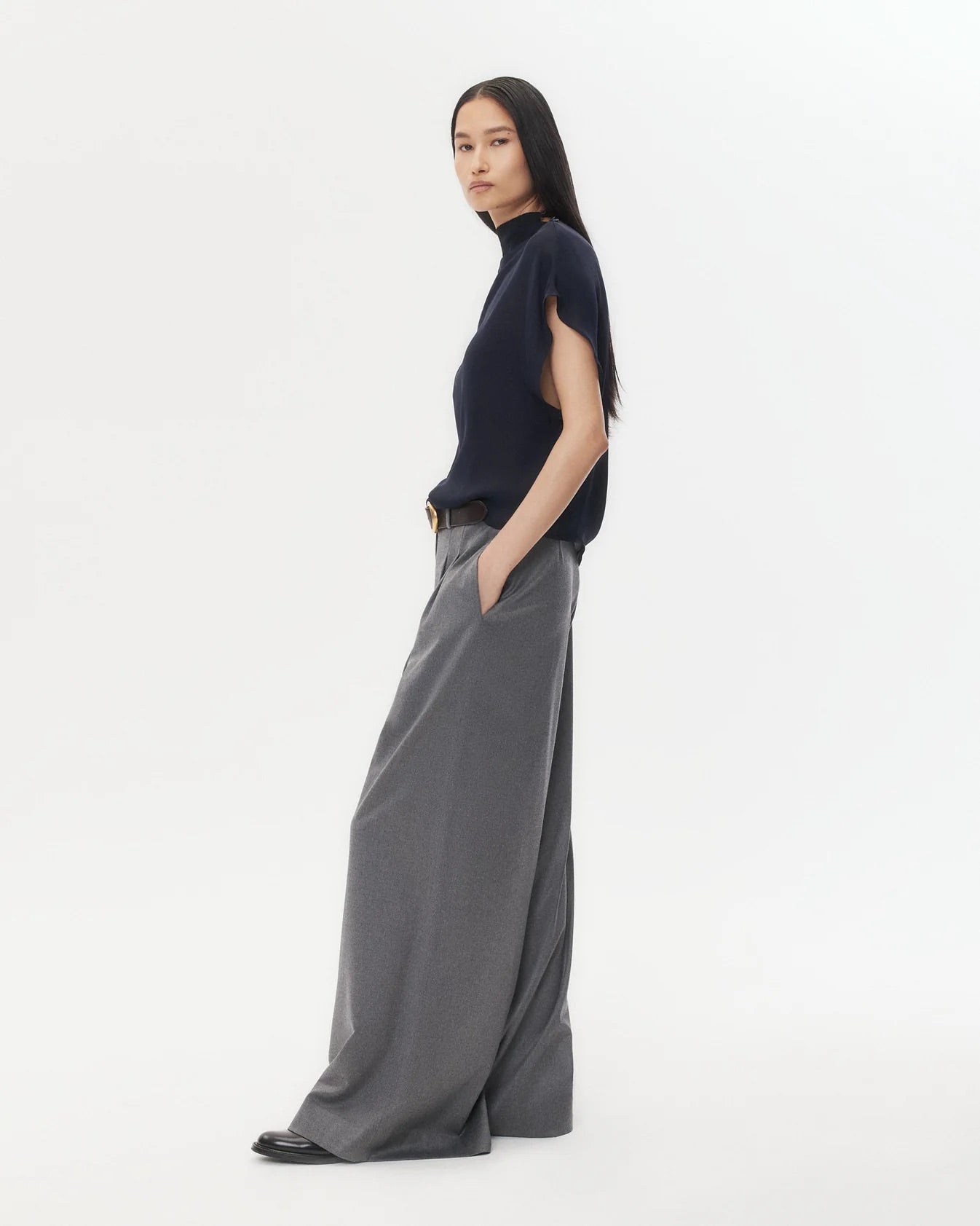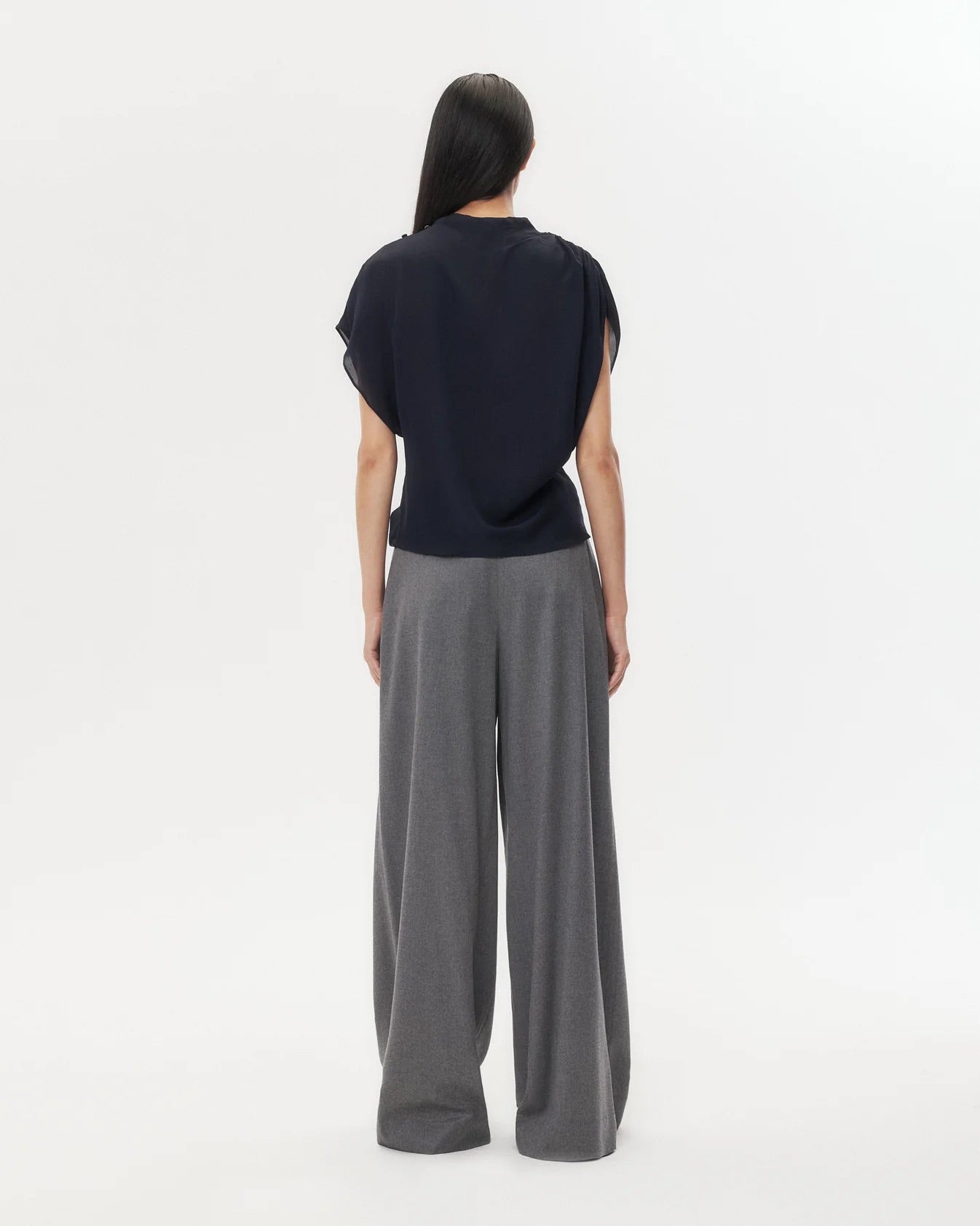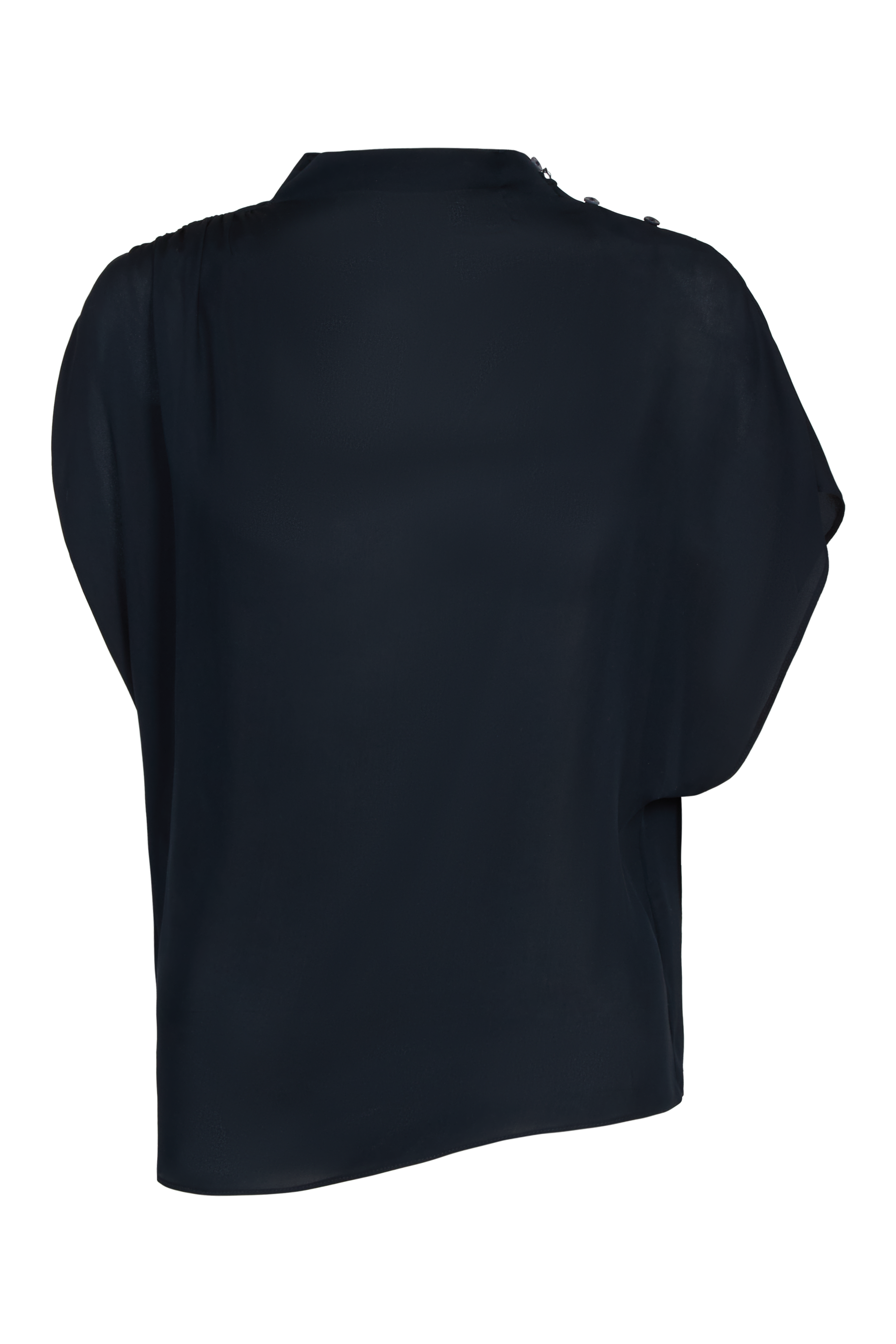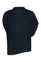 Mock neck, cap sleeved blouse draped in medium weight silk stretch georgette. Wish you would top a loose fit, with a soft drape that skims the body. Complete with a placket trim on one shoulder and pleats on the other shoulder.