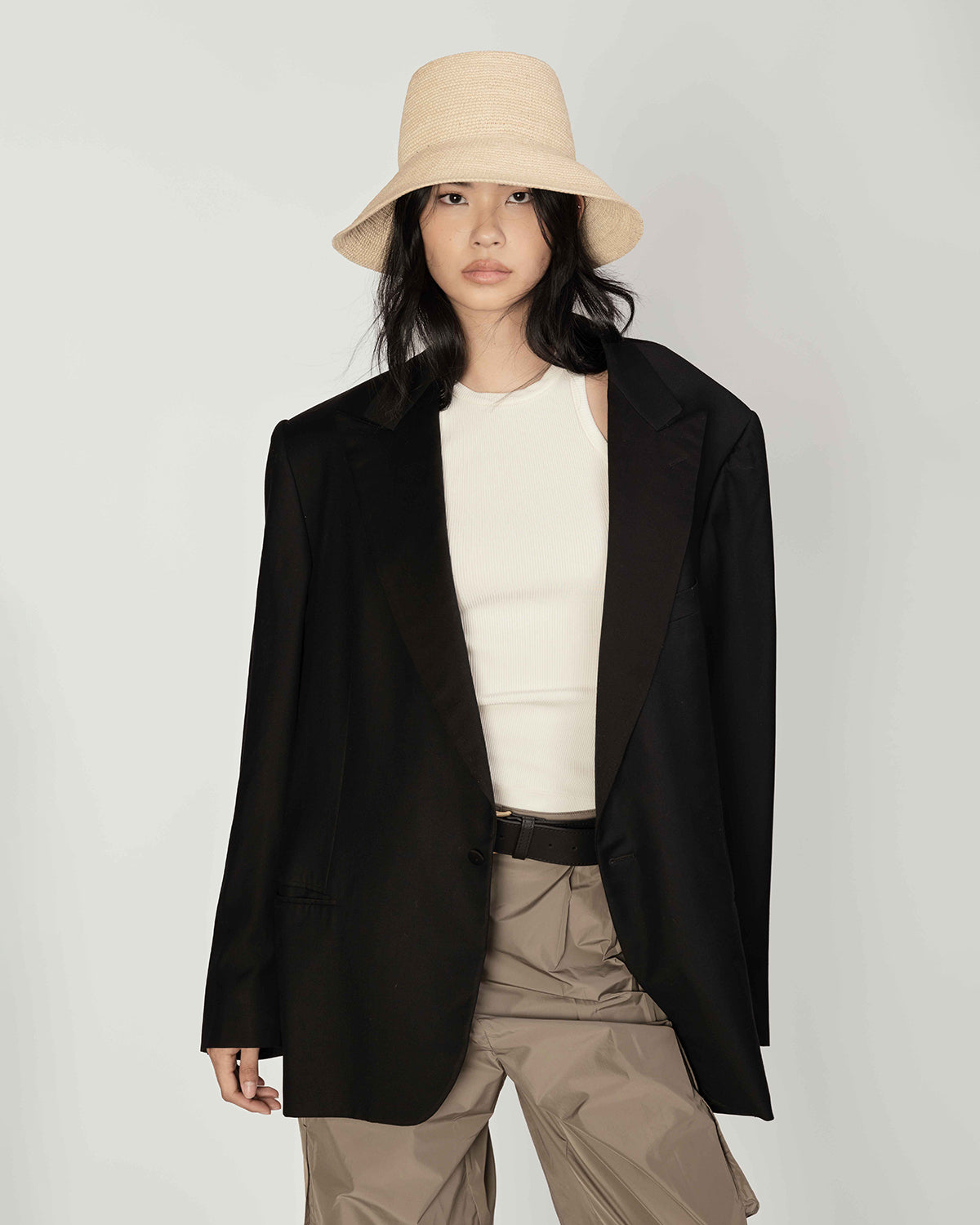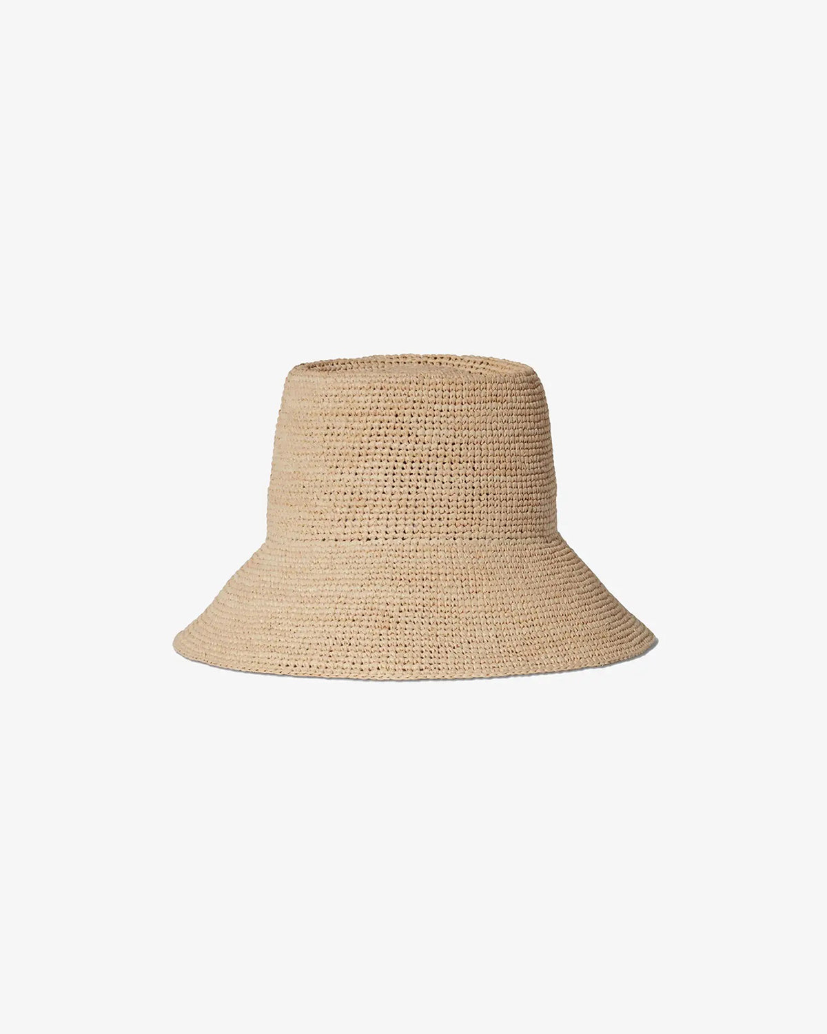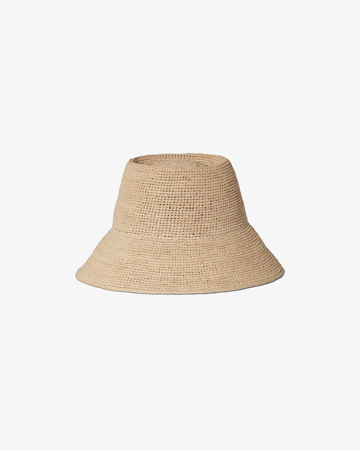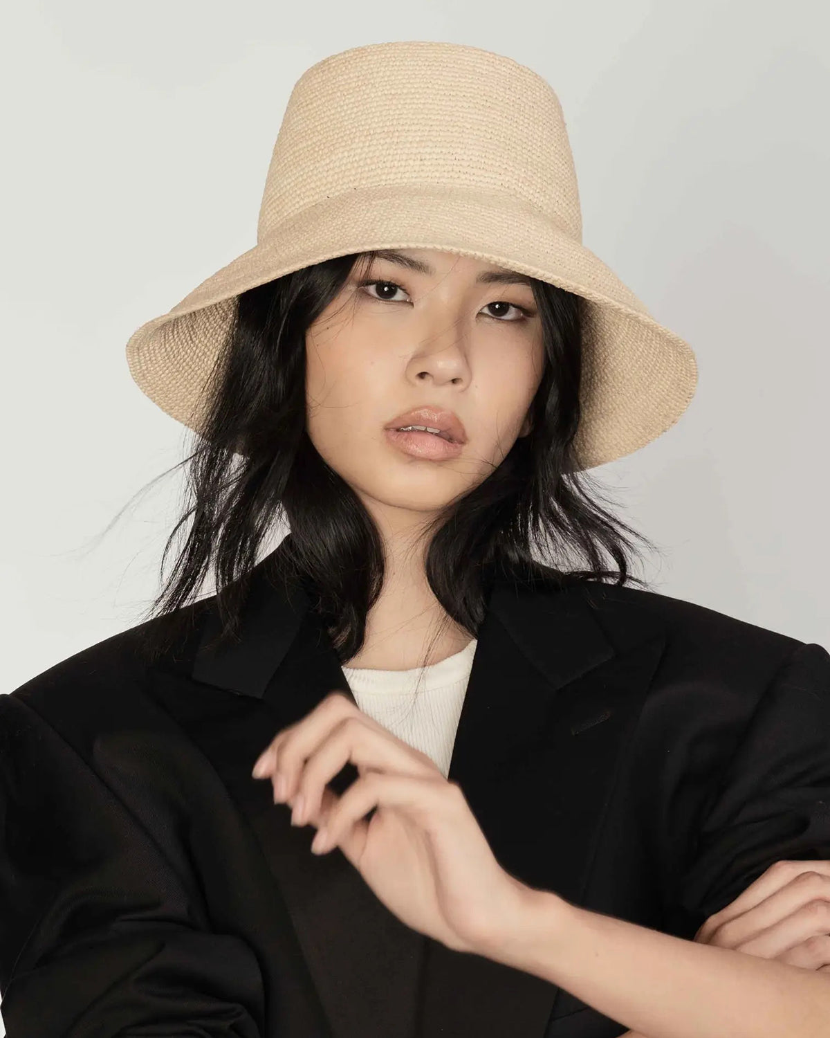 A raffia straw bucket hat made for summer. This short-brimmed crochet bucket hat was intricately crocheted to create a flexible and structured design. This effortless bucket hat can easily be worn year-round and is meant for traveling with you wherever you go whether in a suitcase, a purse or a beach bag.