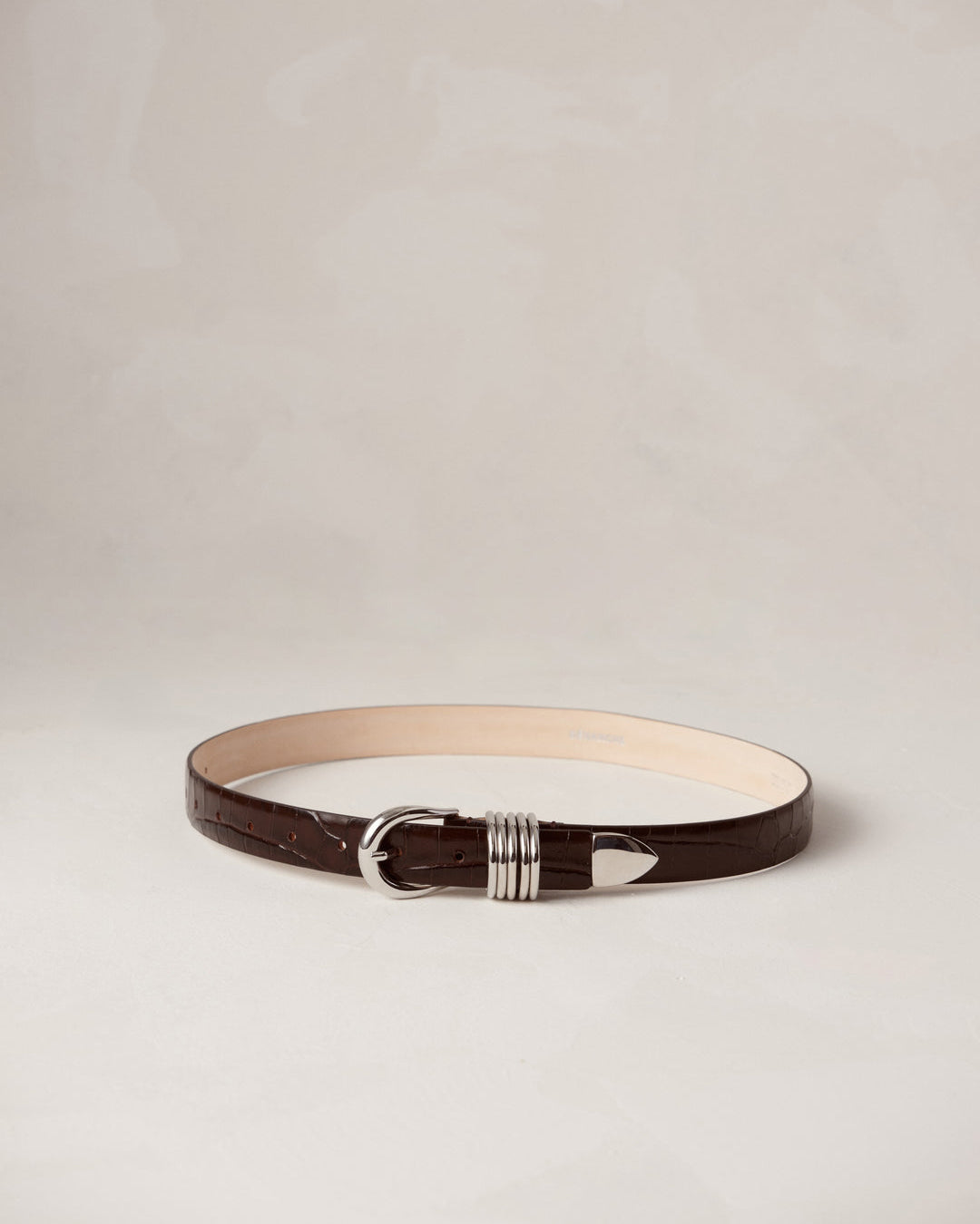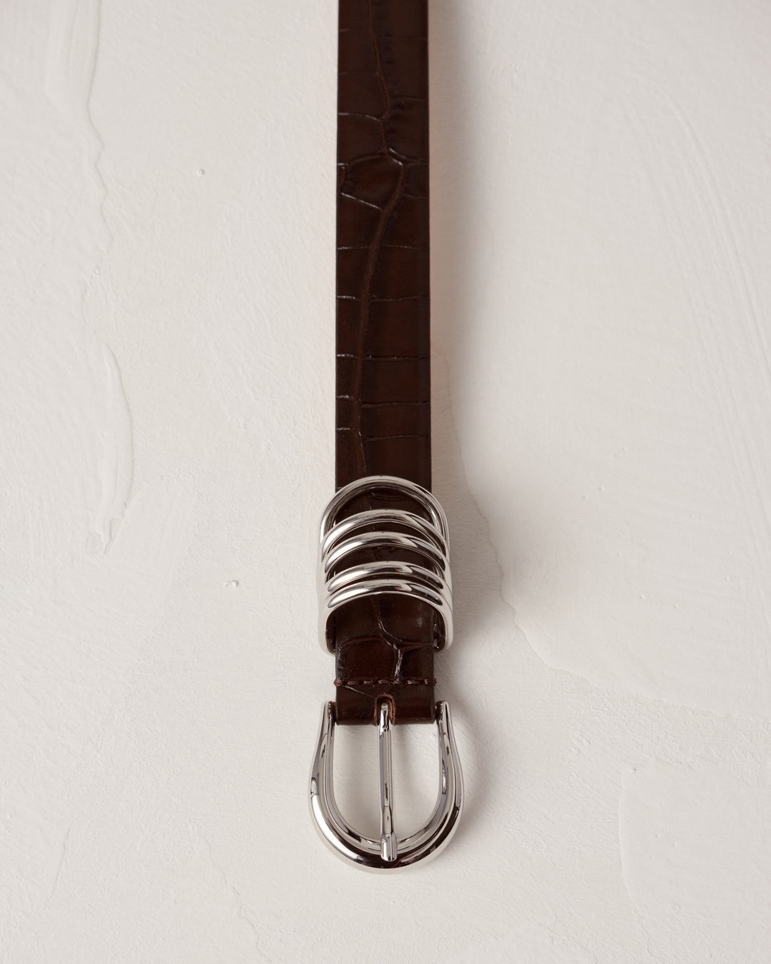 The debut style of Déhanche, now in a luxurious embossed croco, radiates a subtle yet sophisticated aesthetic that encapsulates the essence of polished dressing. The 3-ring belt is handcrafted in Italy from rich, croco embossed leather and signature beige suede lining. The shining silver hardware buckle, rings and belt-tip add polish to any look.