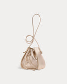 small slouchy bucket bag evoking a metropolitan mood. crafted from shimmering lamé calfskin, it fastens with a leather drawstring and ties and will hold all your personal belongings and valuables. the small bucket bag can be tossed over the shoulder or pulled across the body with the matching strap.