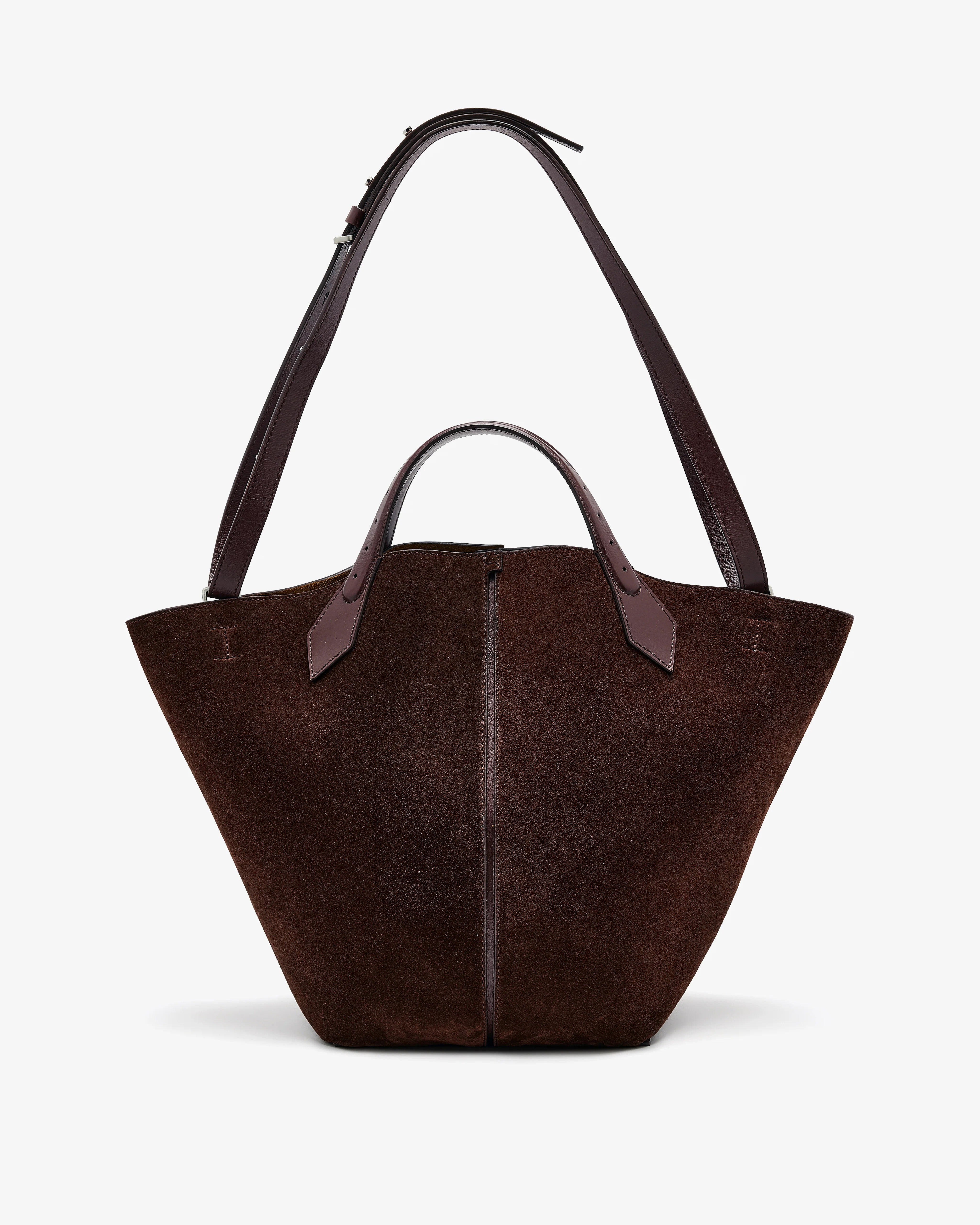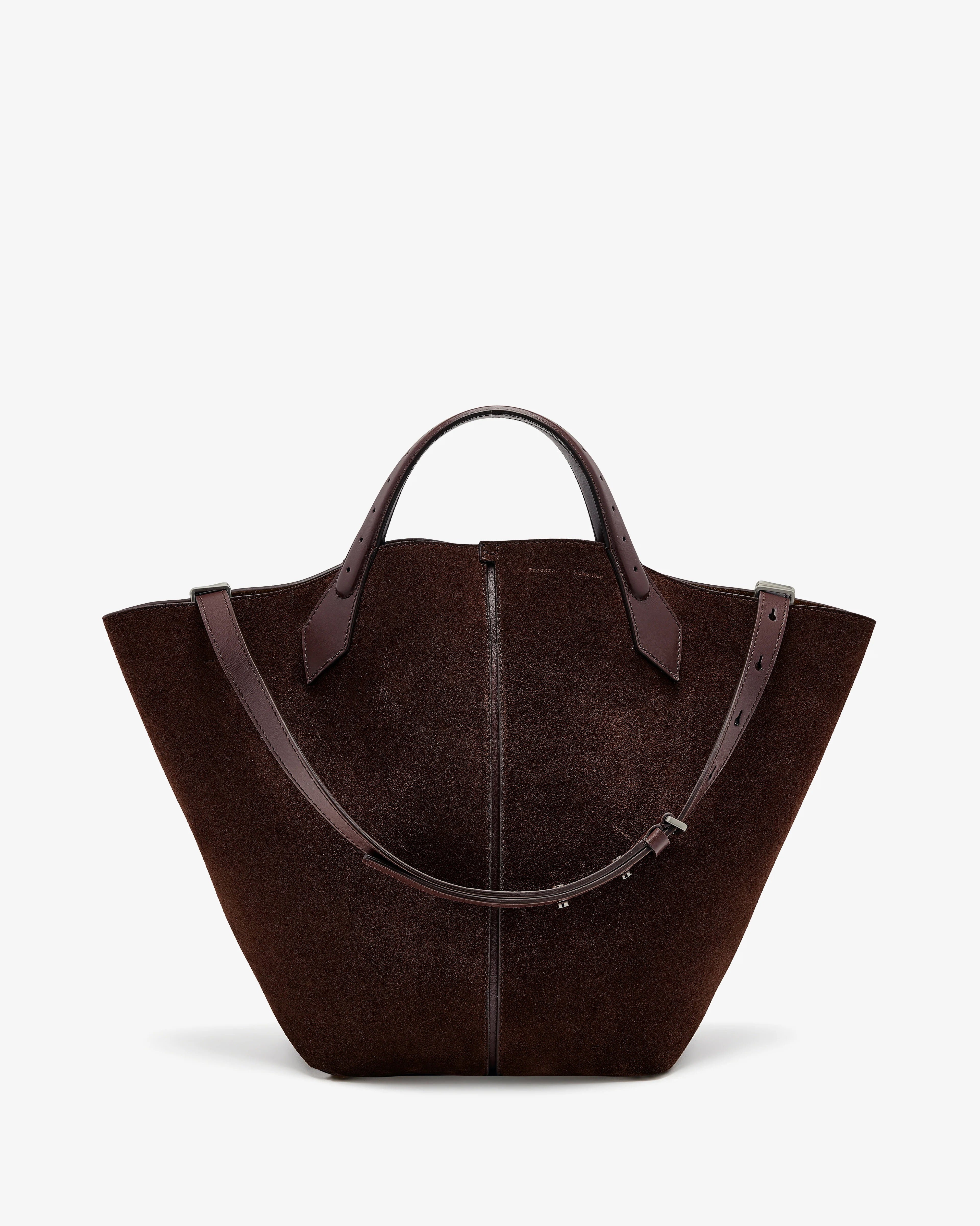 The Large Chelsea Tote is crafted in suede to a soft, unstructured silhouette. Detailed with two top handles, a detachable, adjustable shoulder strap and open top with a magnet tab closure.