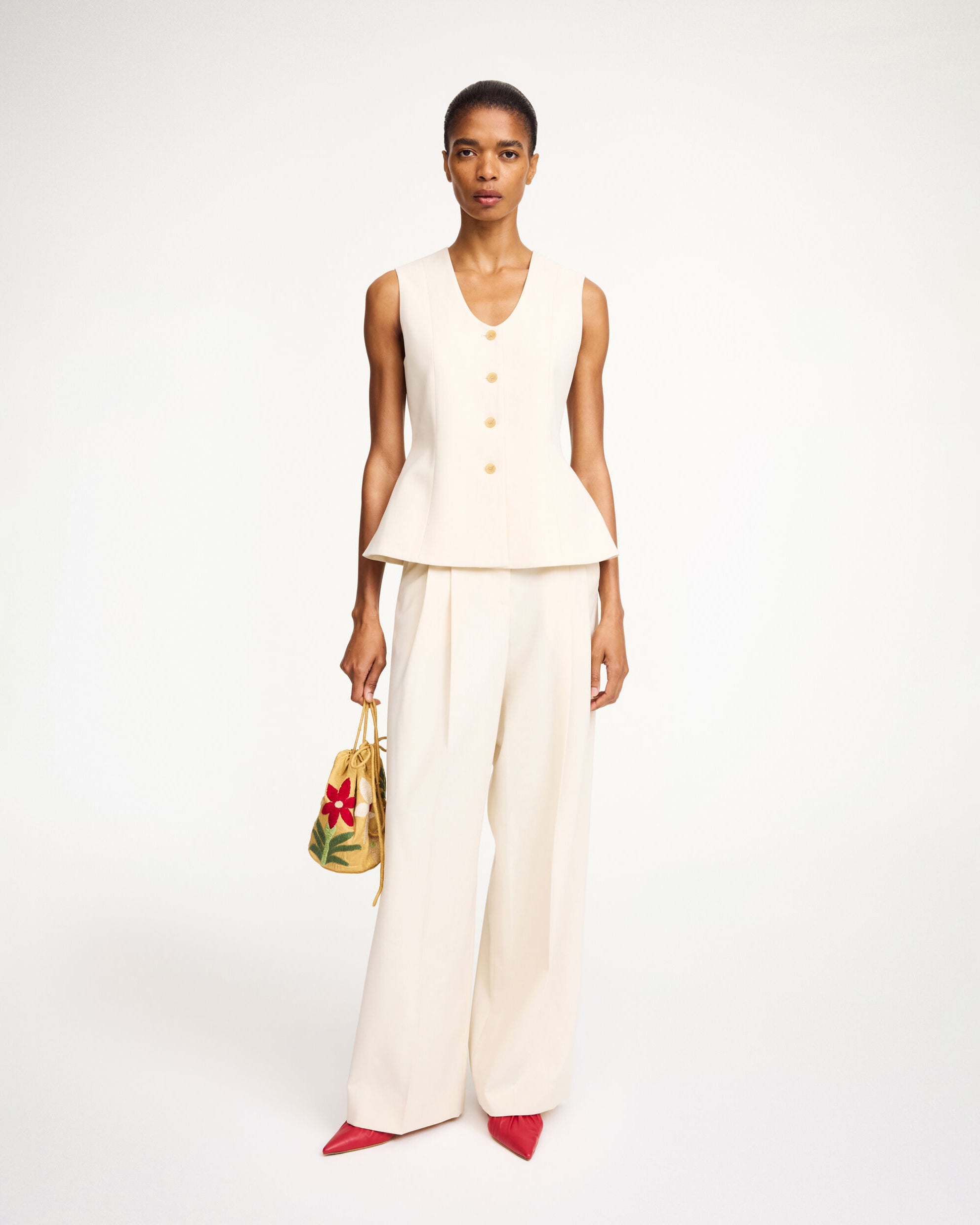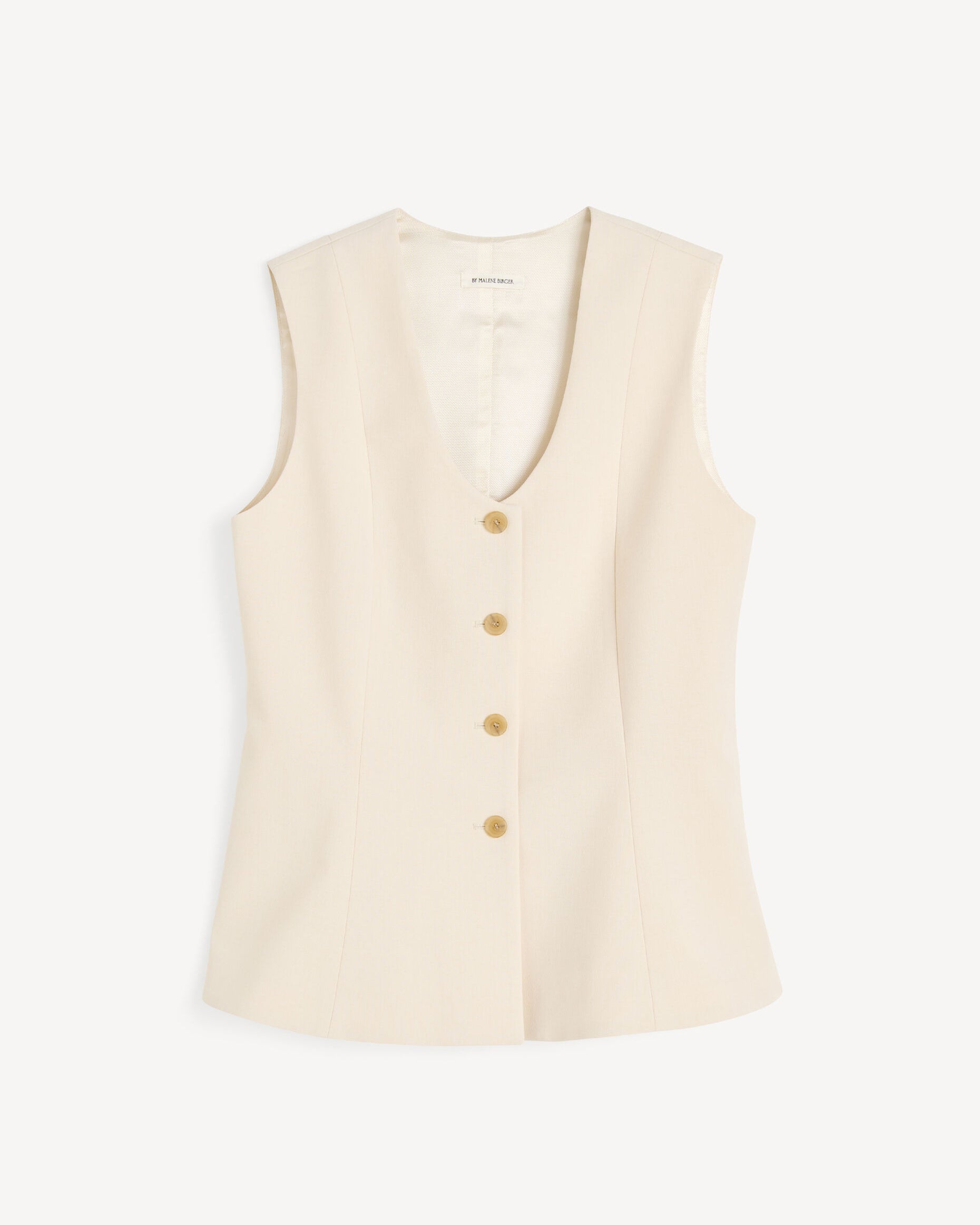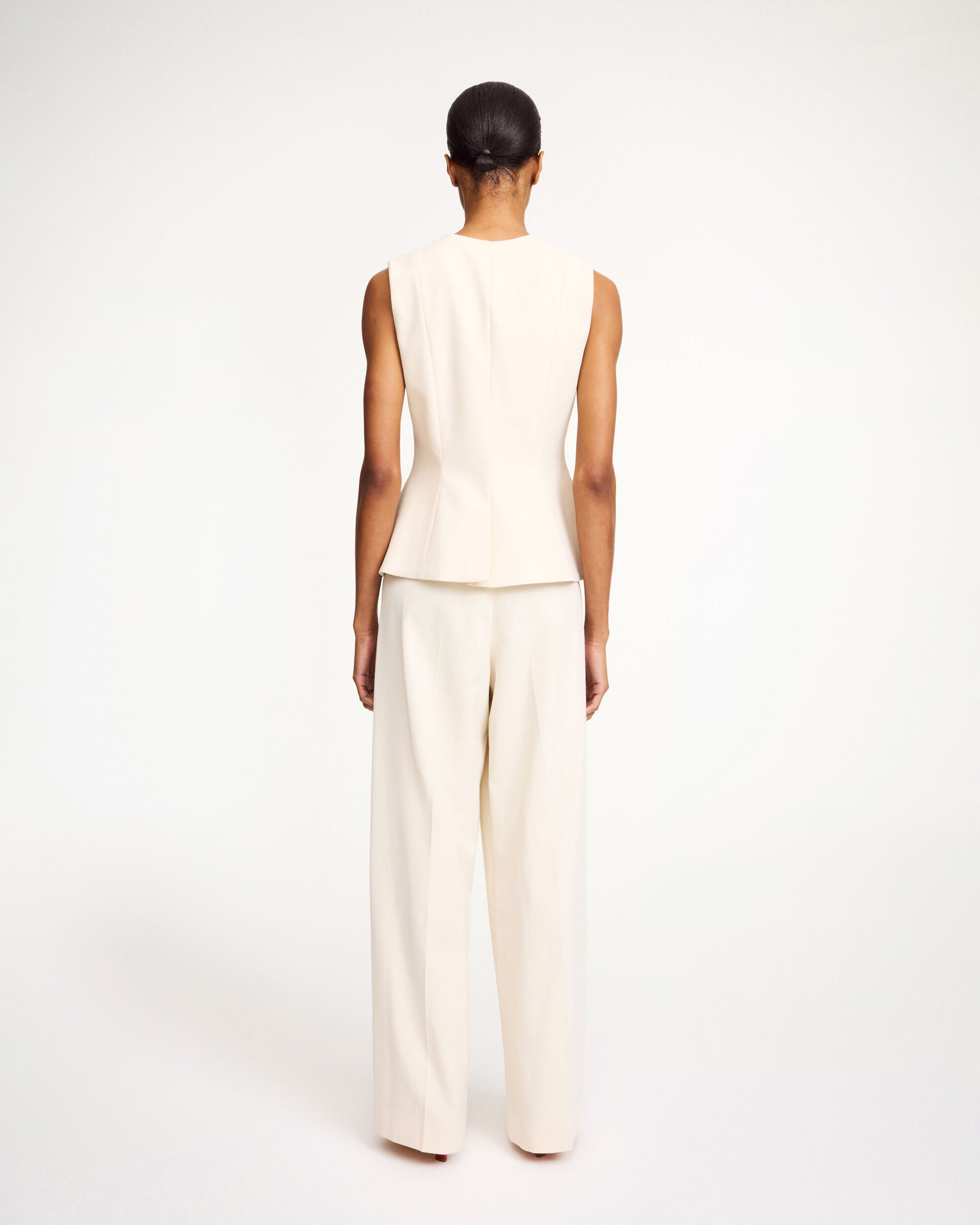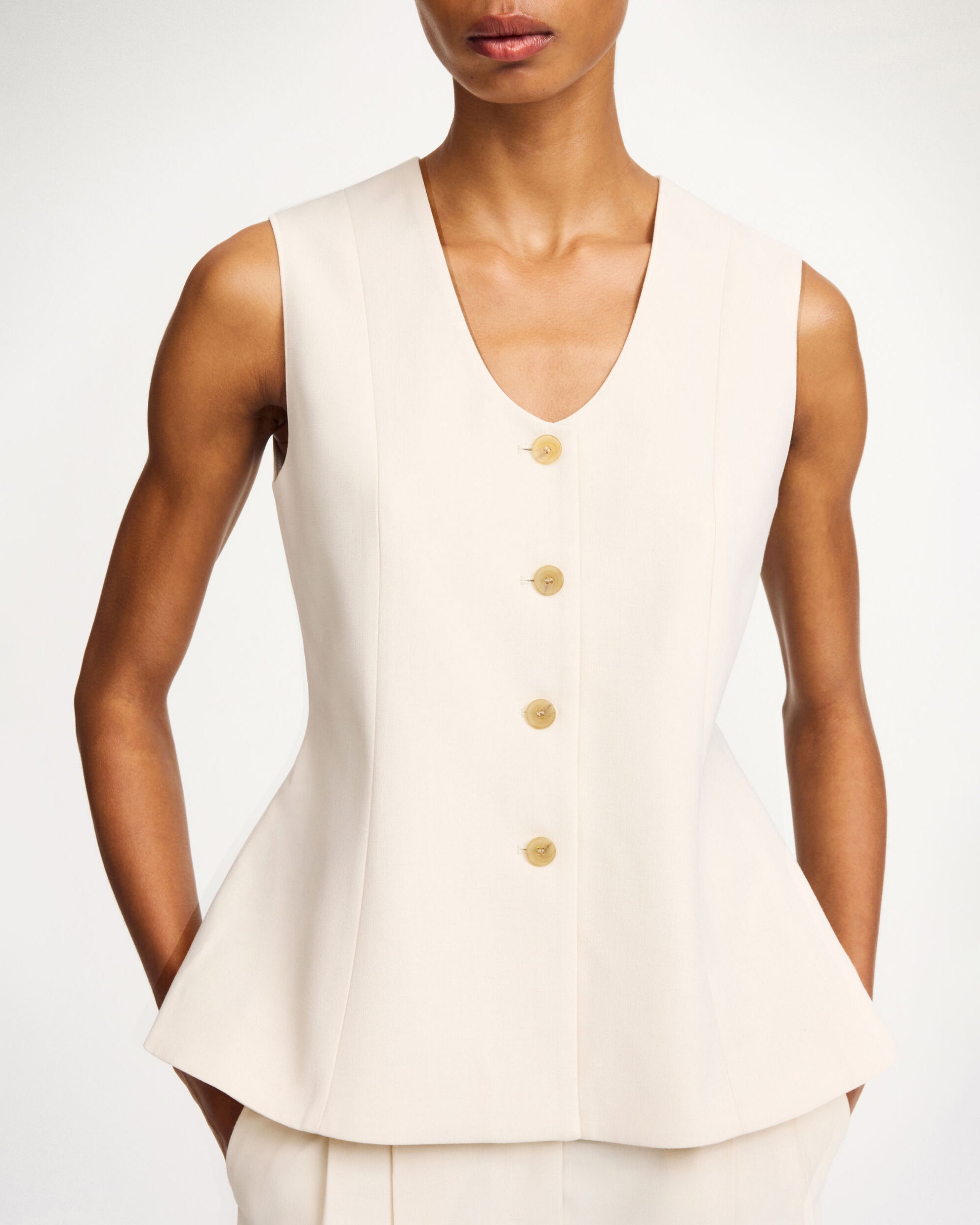 Made to add depth and detail to your daily edit, the Merlin design is a feminine version on the classic waistcoat. The single-breasted silhouette that accentuates the waist, closes with buttons down the front, has a deep neckline and a single back vent. Wear with your tailored separates.