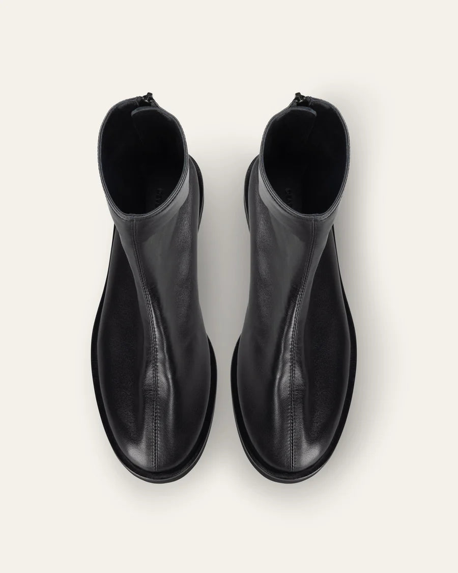 A modern minimalist ankle boot, crafted in supple Italian nappa leather. Leather wrapped and padded insole, zip closure and a durable rubber outsole with low stacked heel.