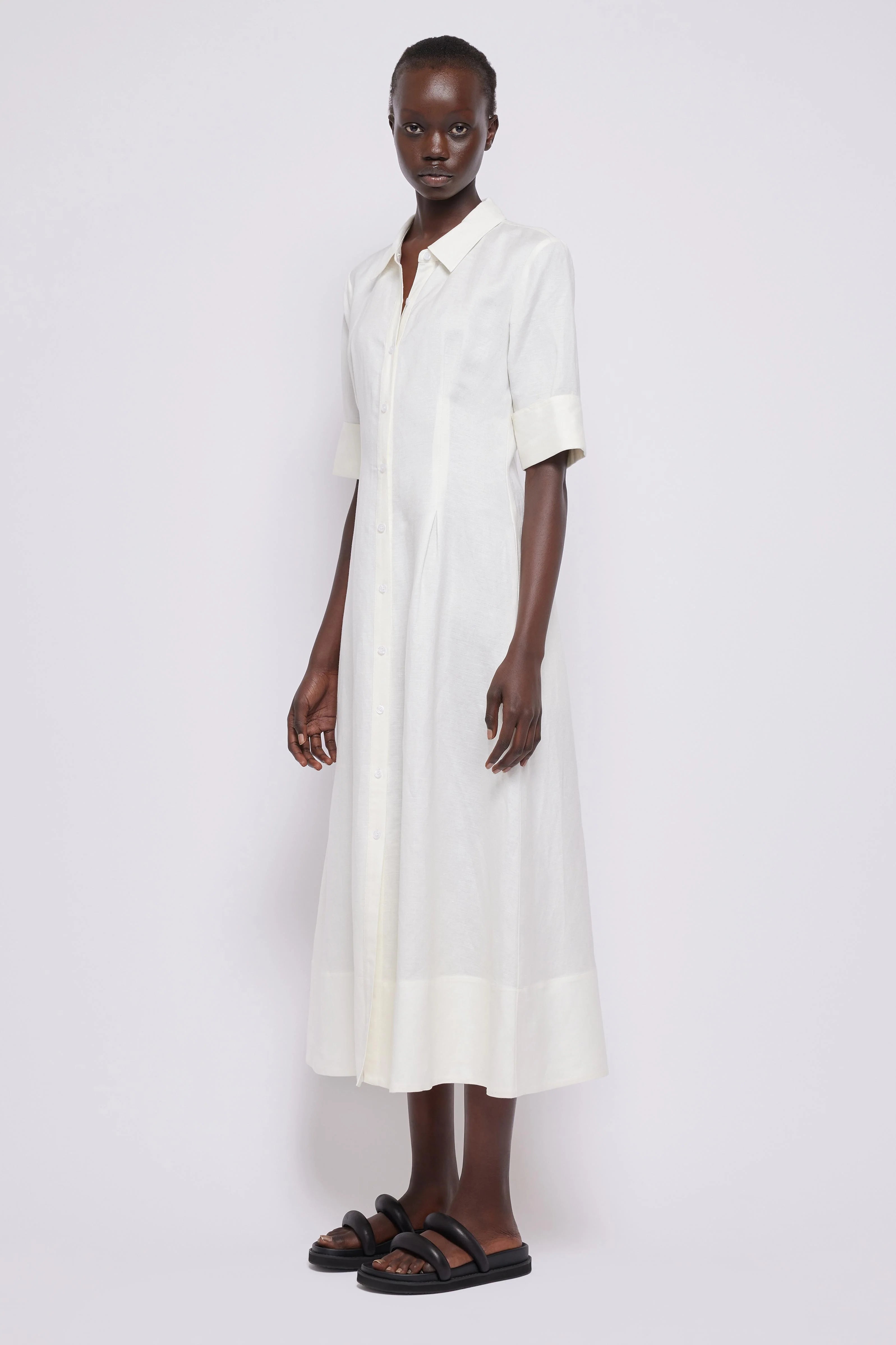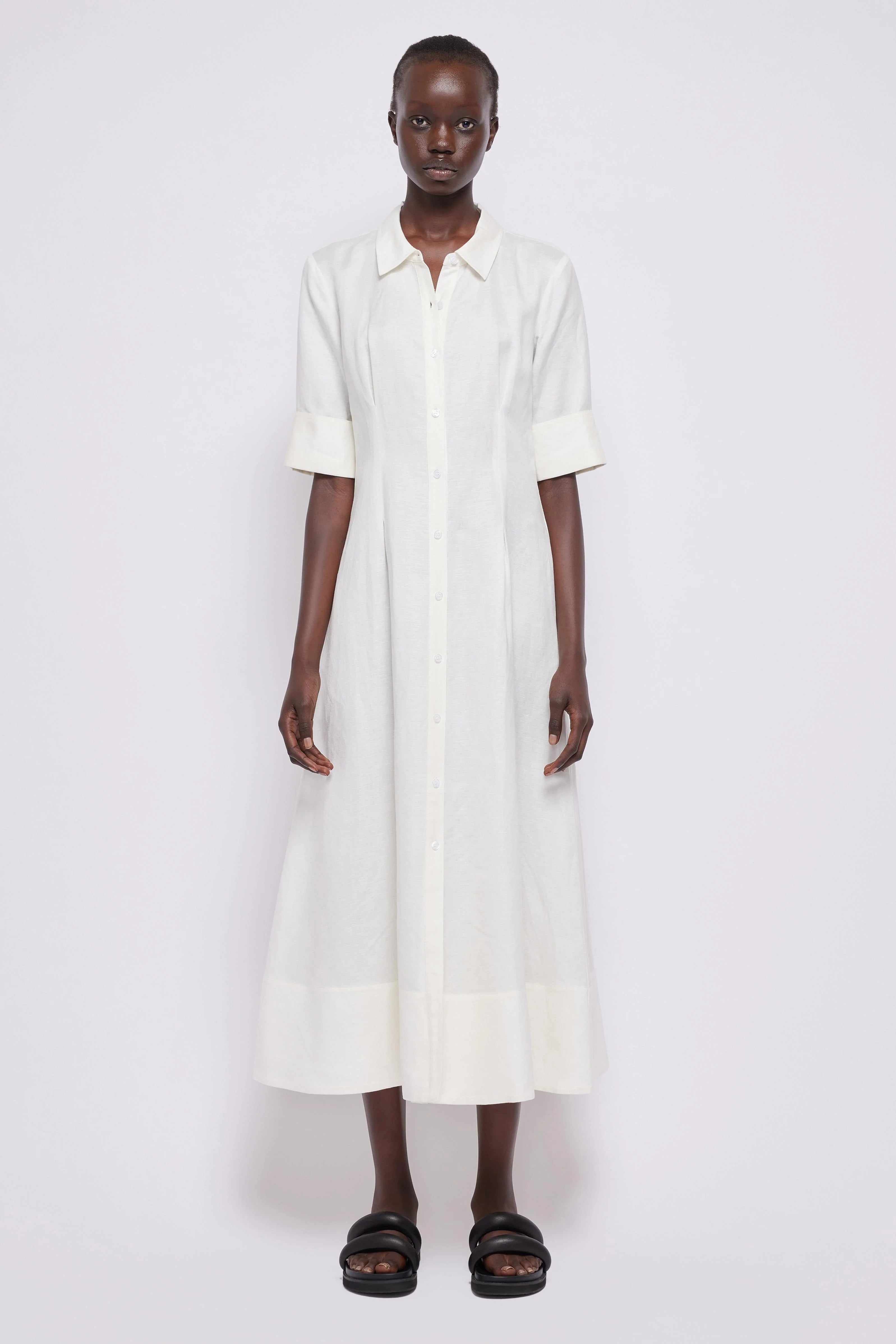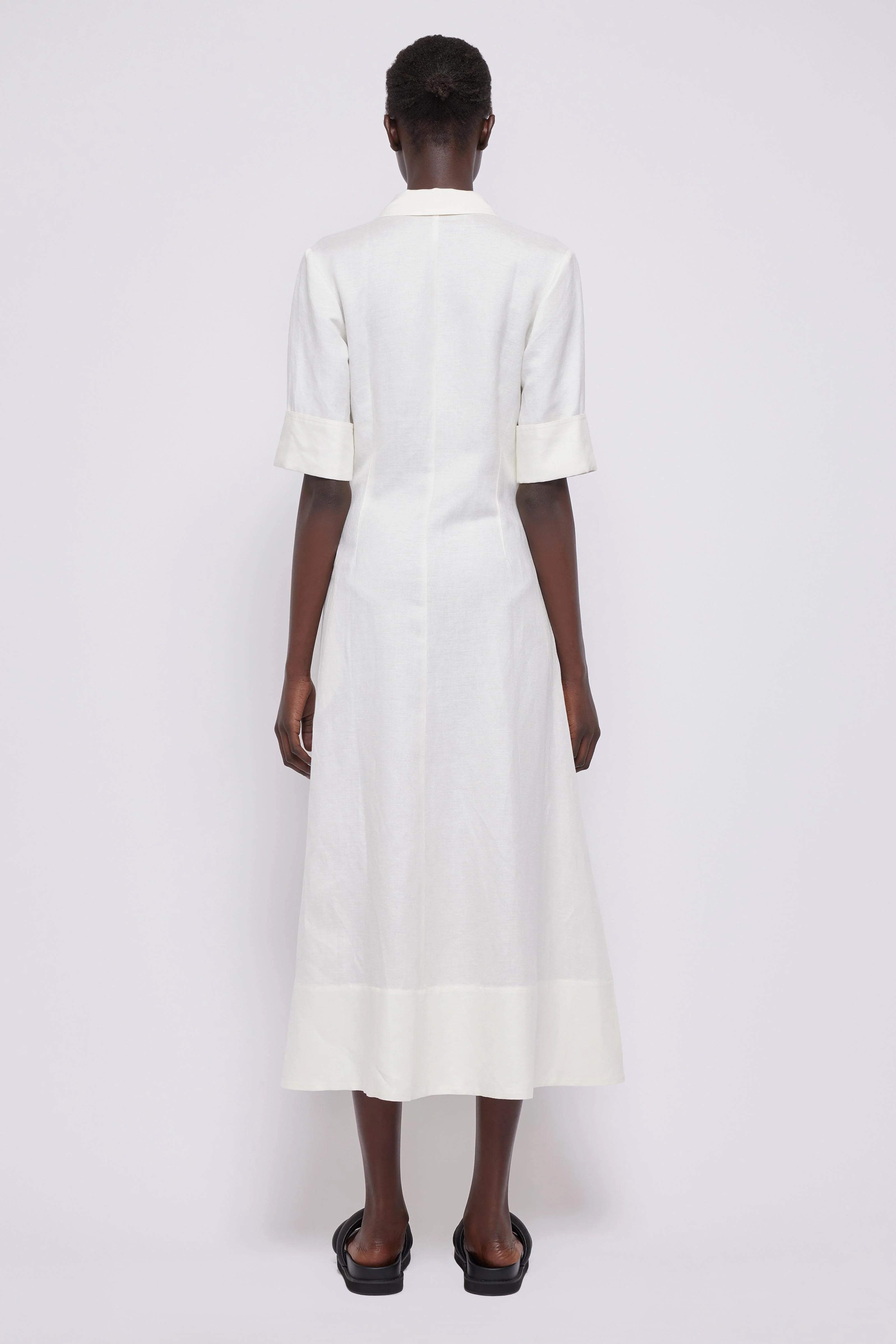 The SIMKHAI Claudine midi dress is crafted from mid-weight, non-stretch linen weave. This shirt dress features pleated details at the front, a collared neck, and a button placket. It also features short sleeves with fixed cuffs and on-seam hip pockets