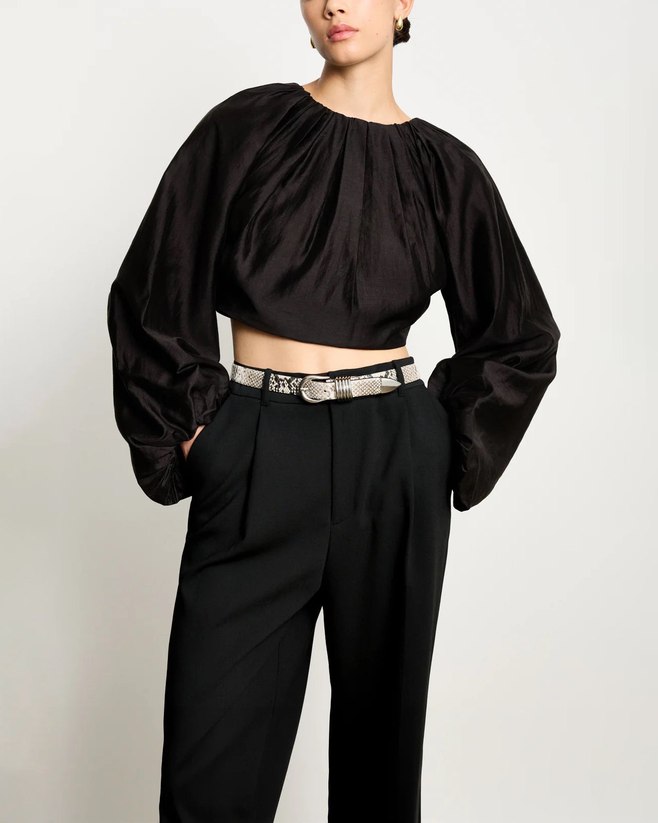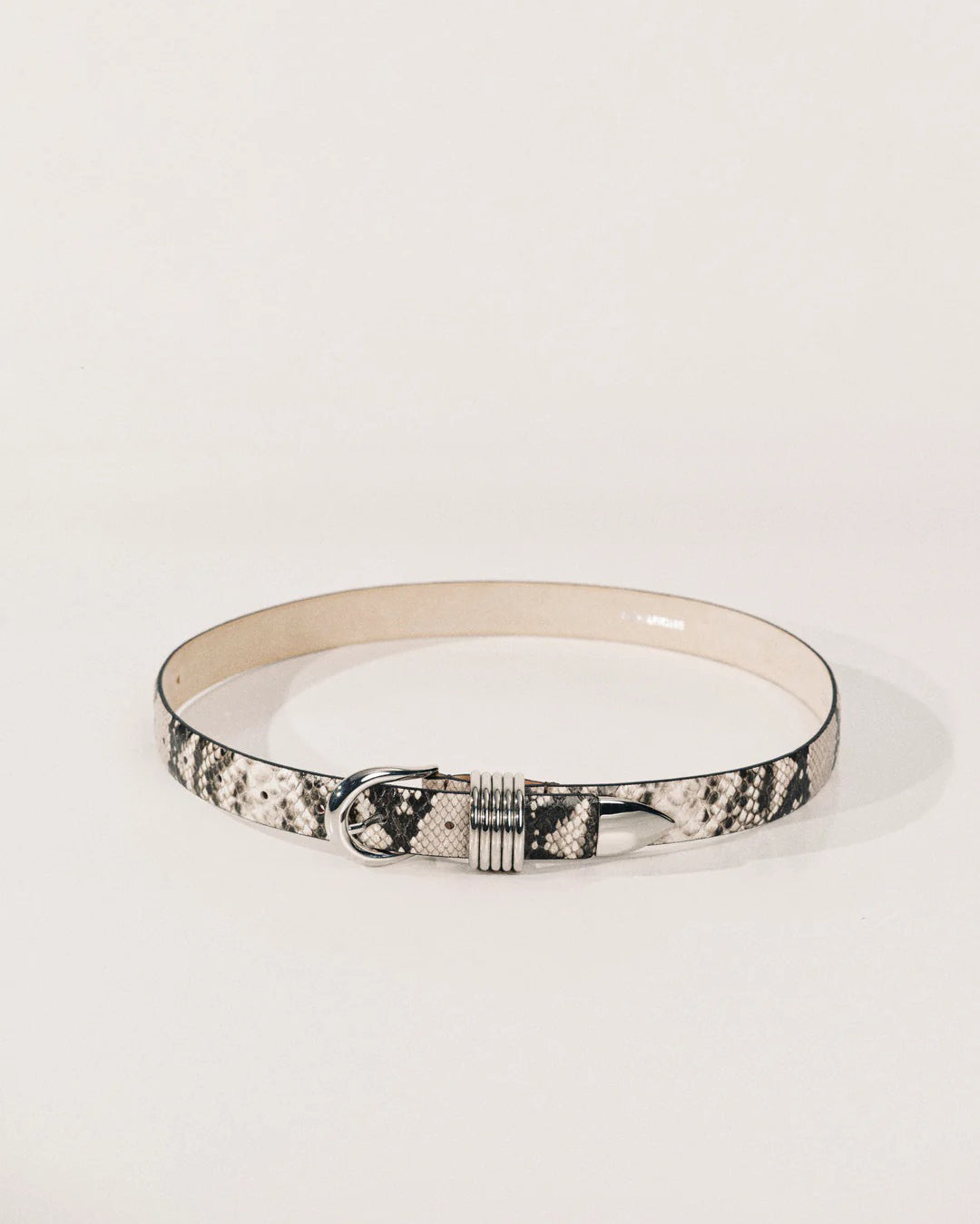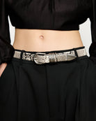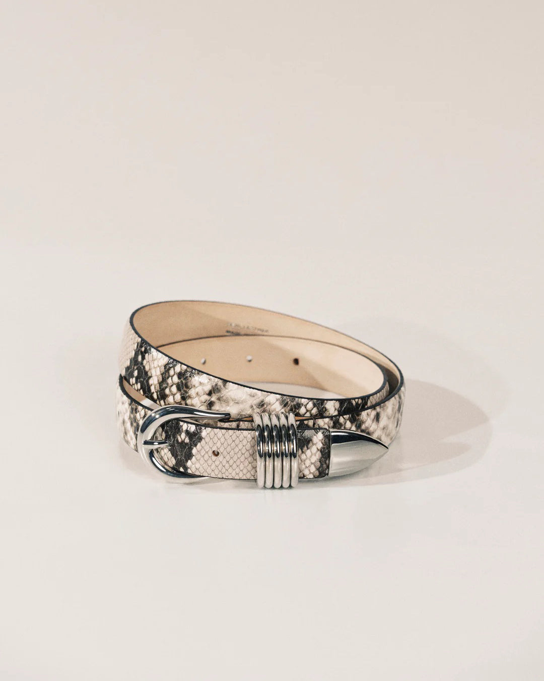 The debut style of Déhanche, now in a luxurious embossed snake, radiates a subtle yet sophisticated aesthetic that encapsulates the essence of polished dressing. The 5-ring belt is handcrafted in Italy from smooth, luxurious snake embossed leather and signature beige suede lining. The shining silver hardware buckle, rings and belt-tip add polish to any look.