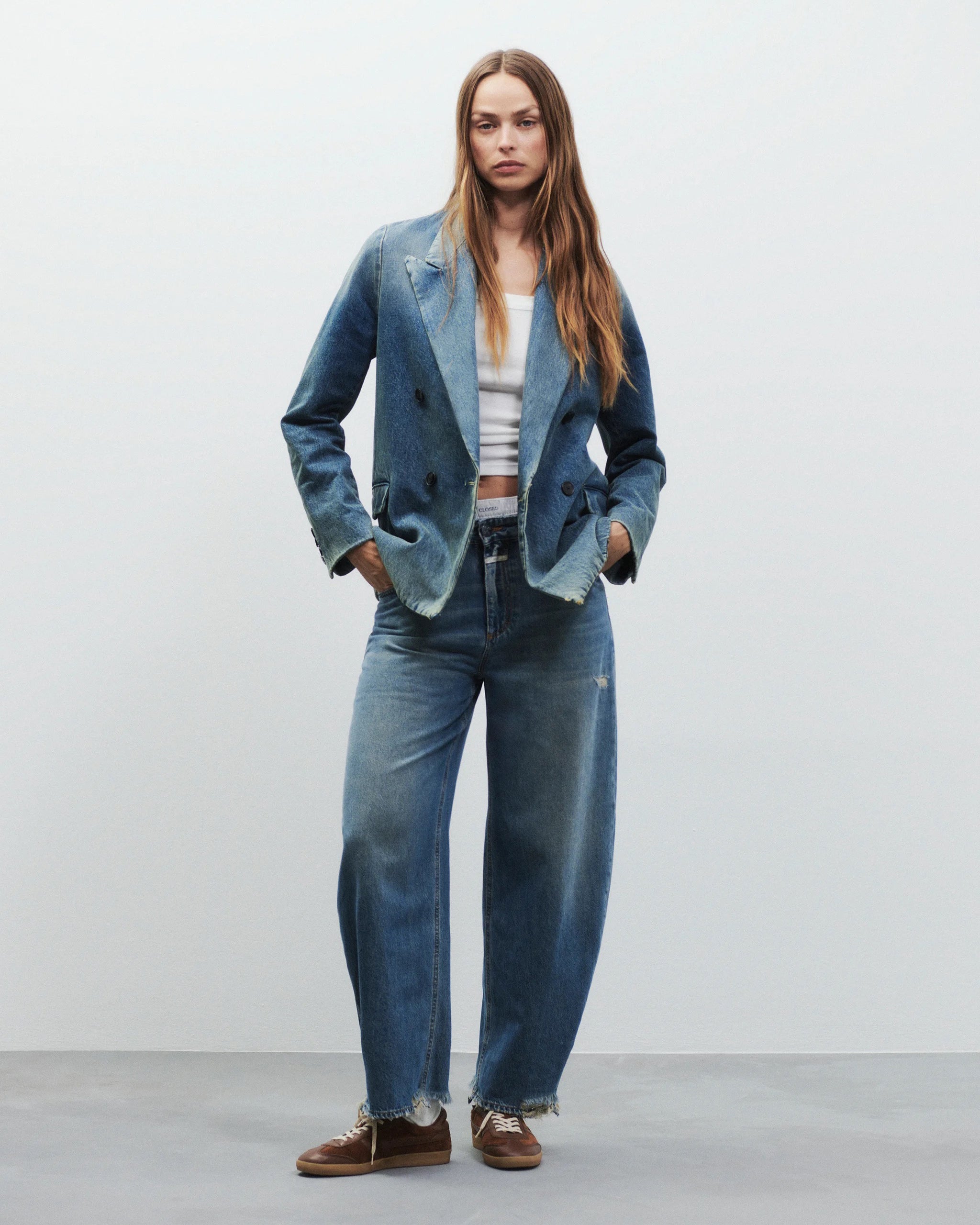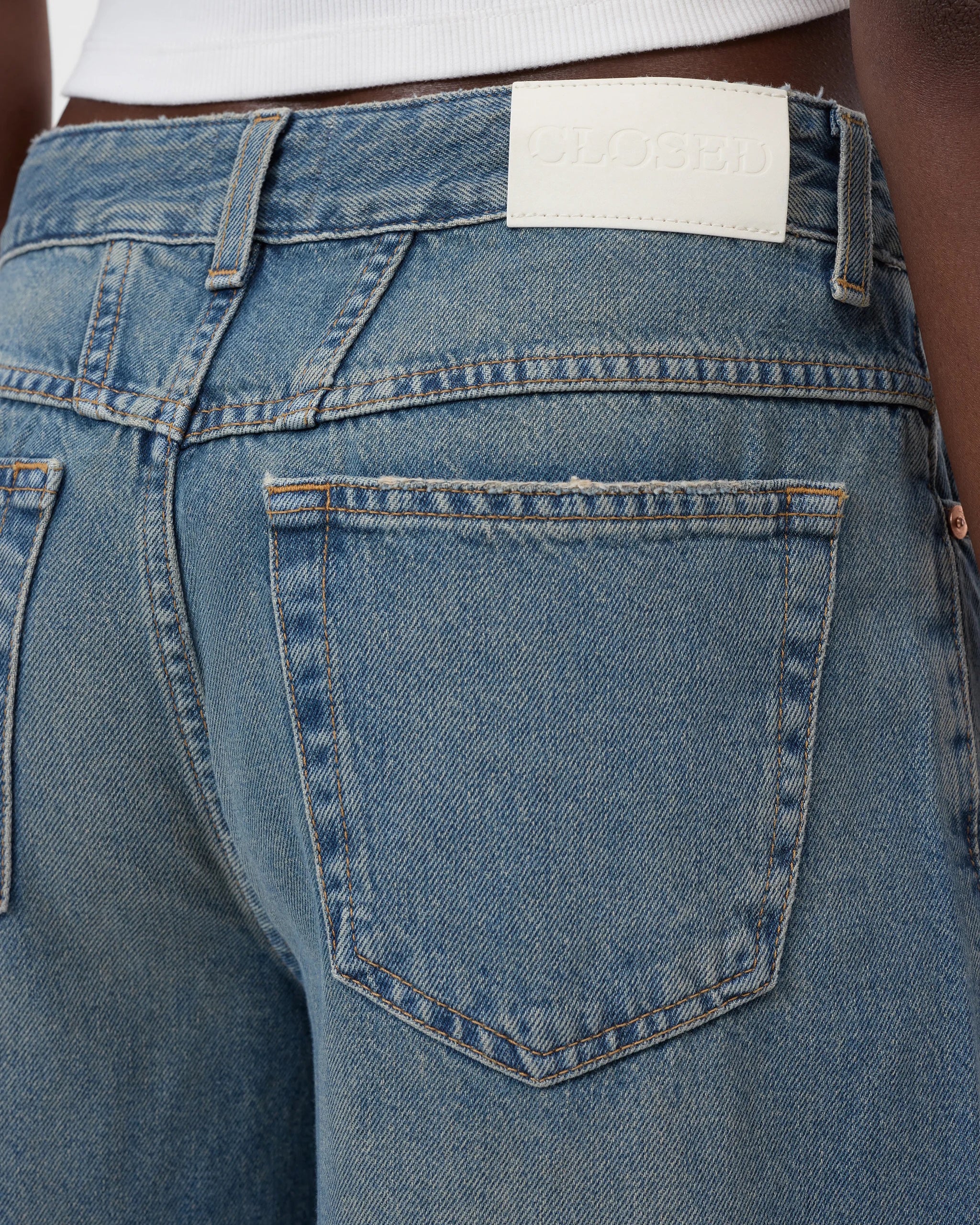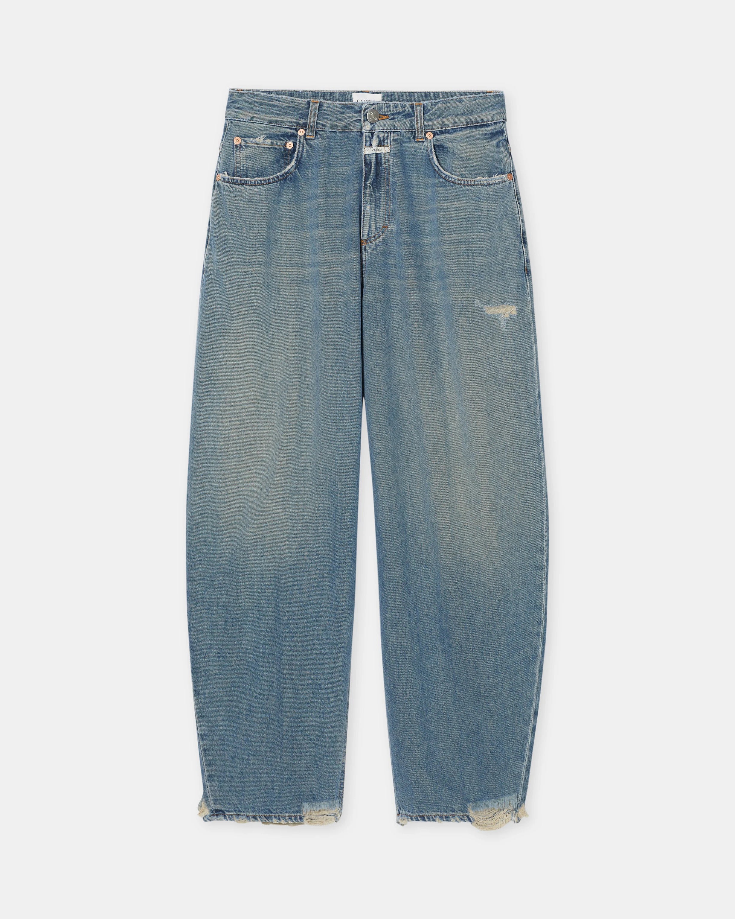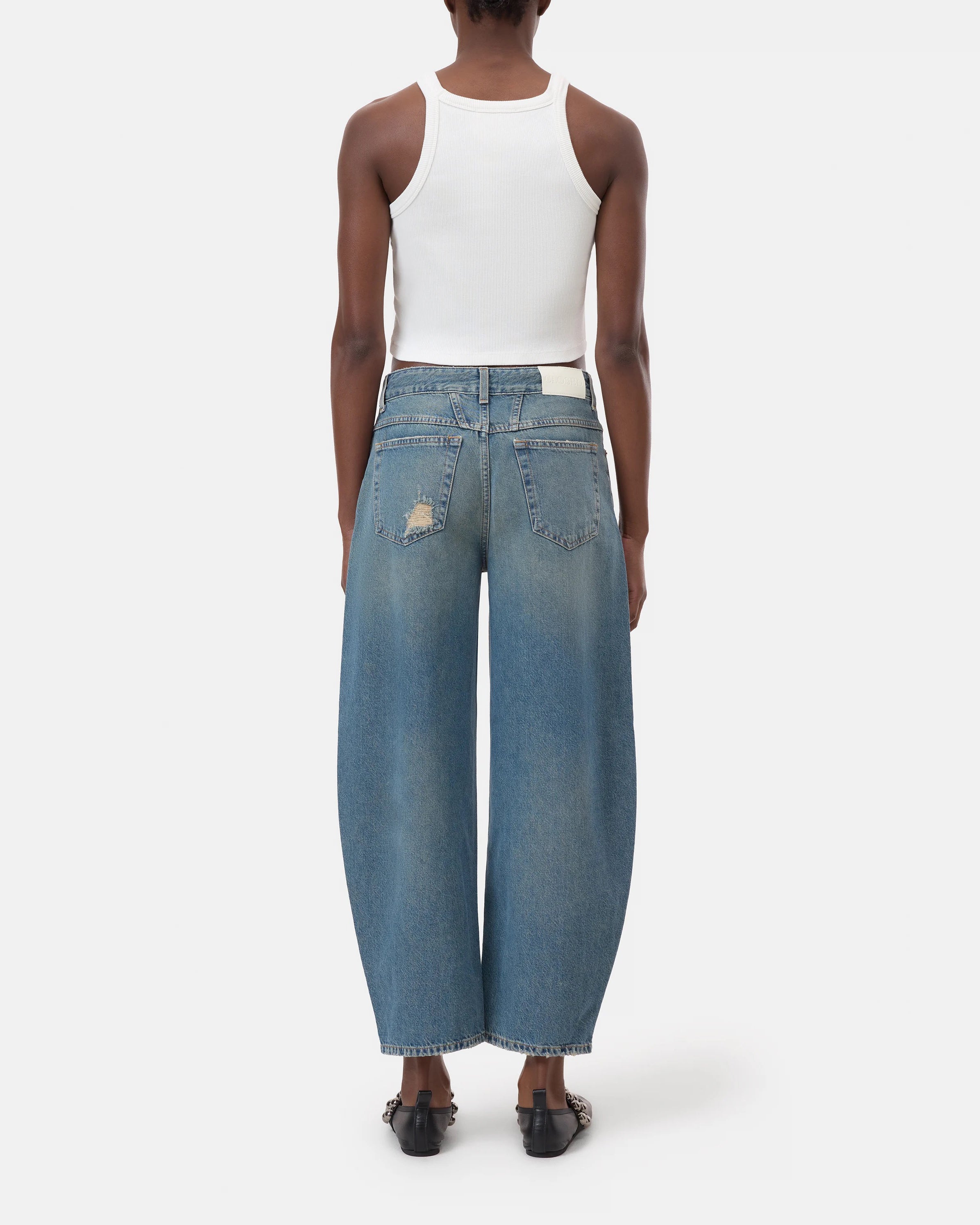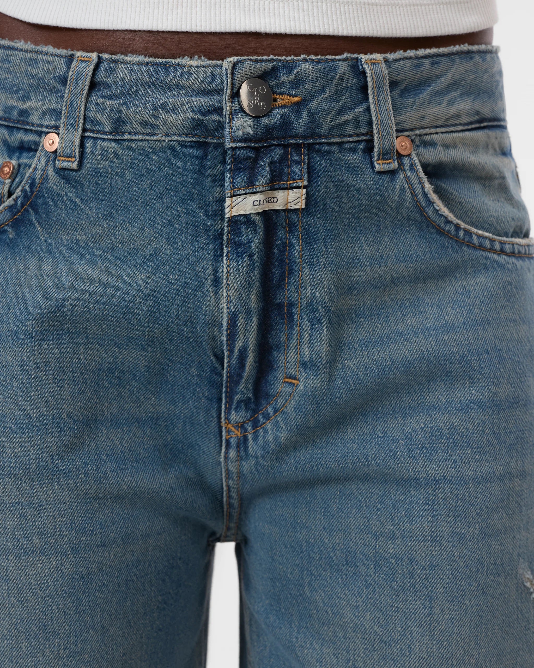 The Jazzie barrel jeans feature a mid-waist cut and cropped legs. Distressed details and patched holes create a vintage look. With classic Five pockets and salt 'n pepper wash, these denim jeans (12 oz.) use BCI and recycled cotton, plus eco-friendly dyes for sustainable style.