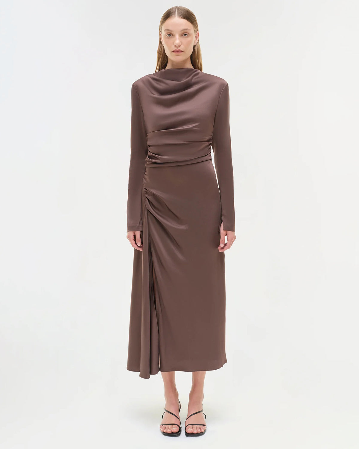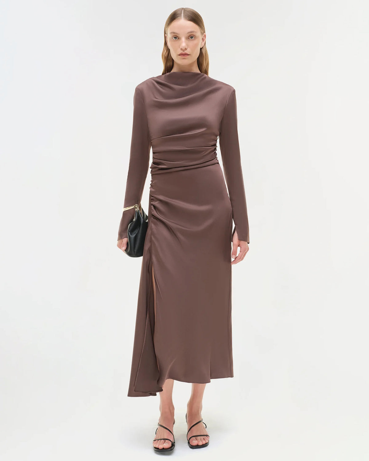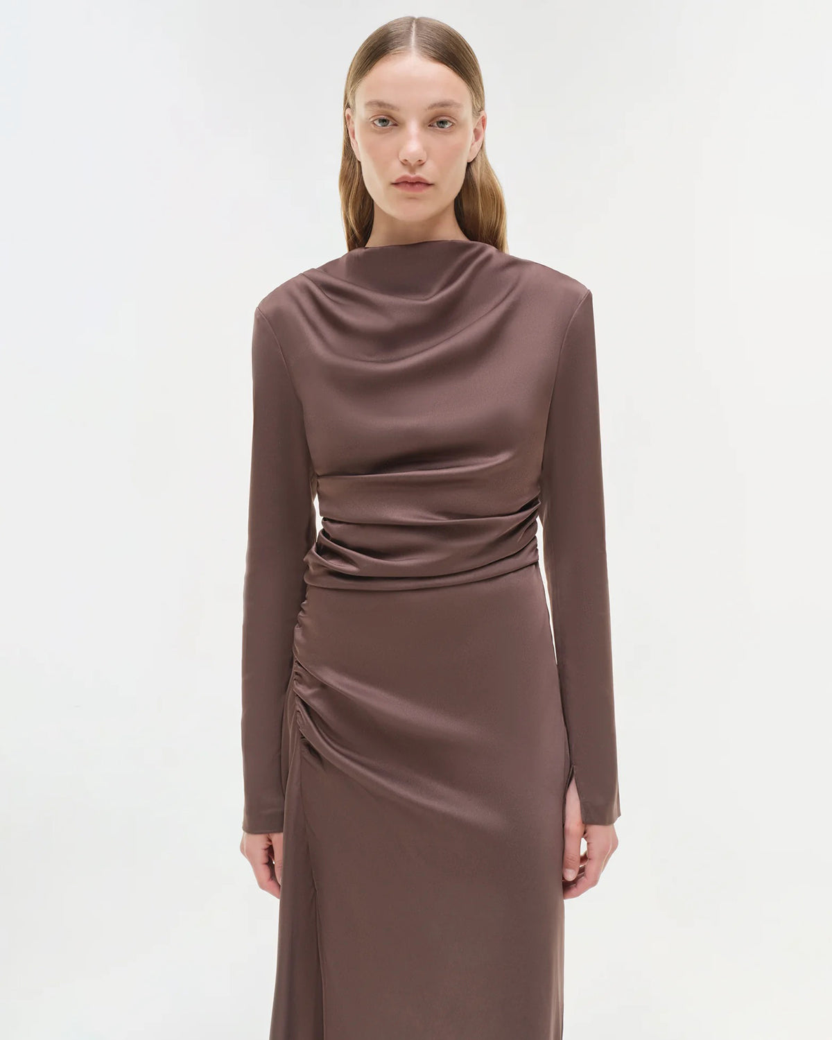 An artfully gathered midi dress with a high neckline in satin for a fluid drape.