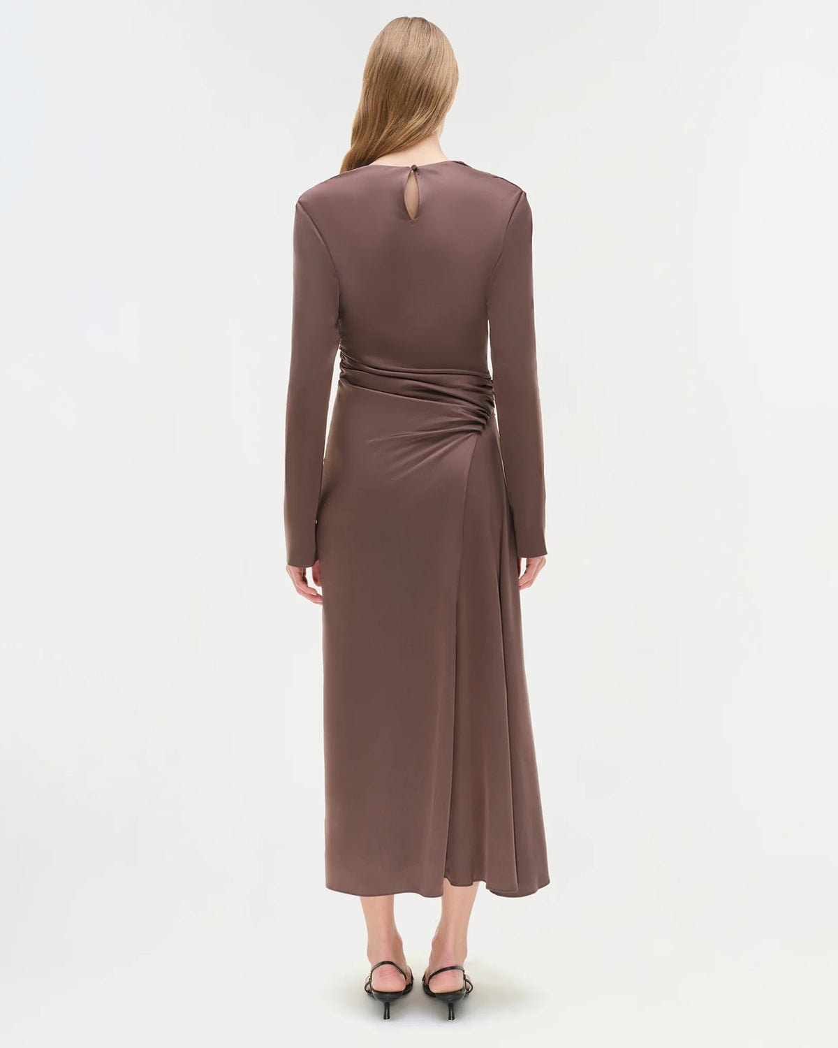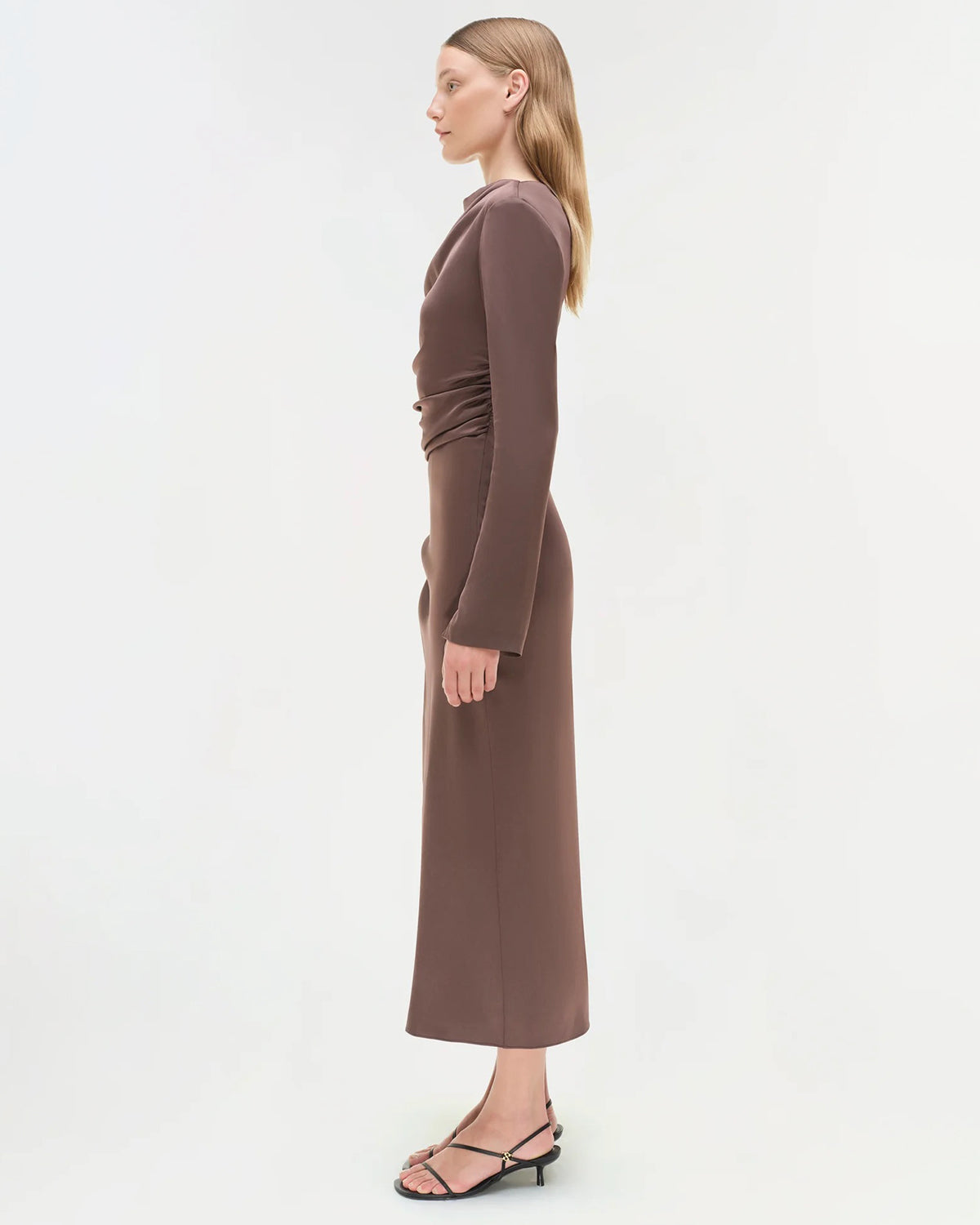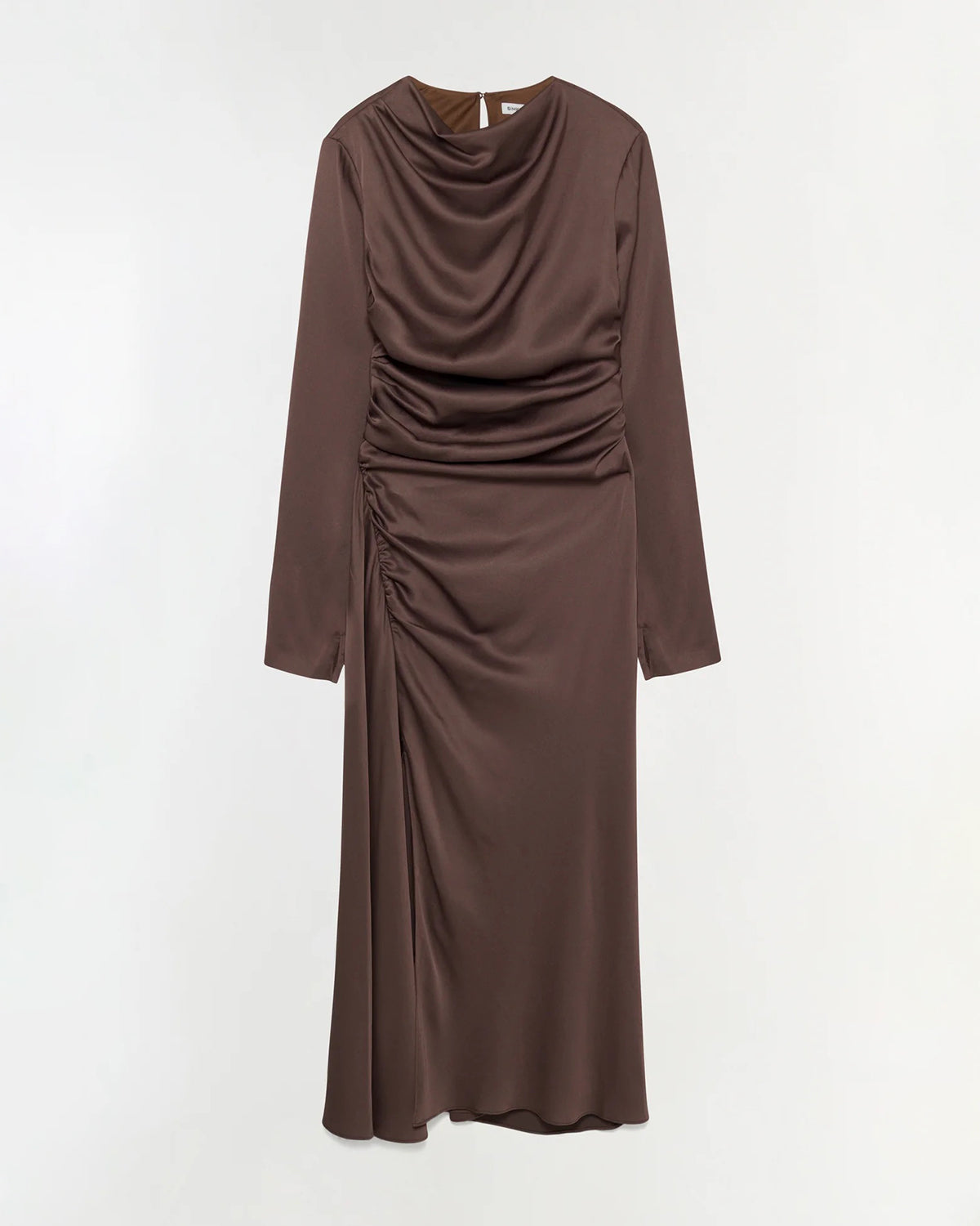 An artfully gathered midi dress with a high neckline in satin for a fluid drape.