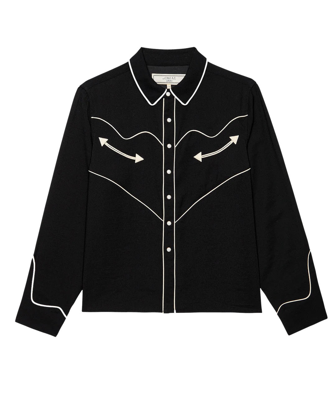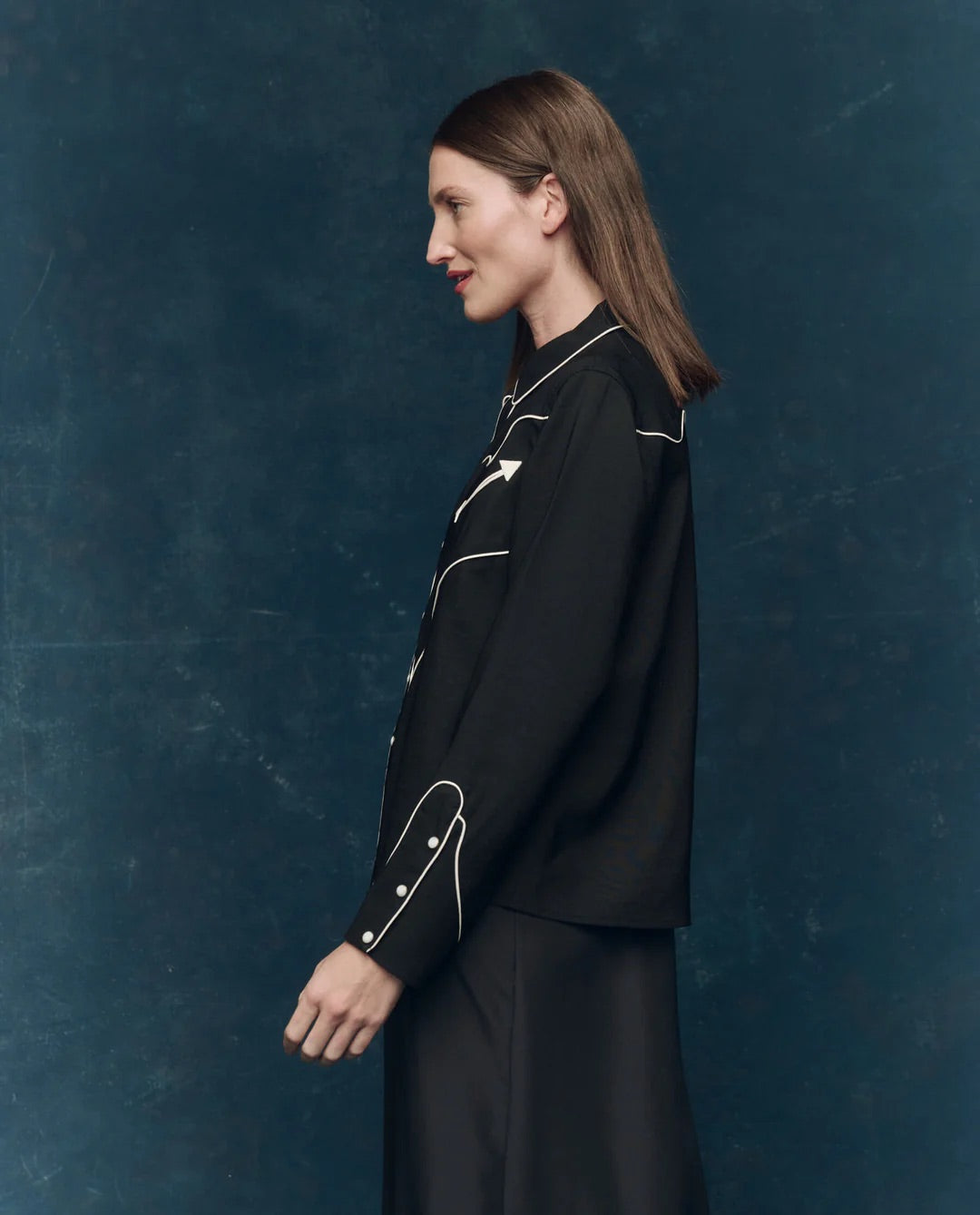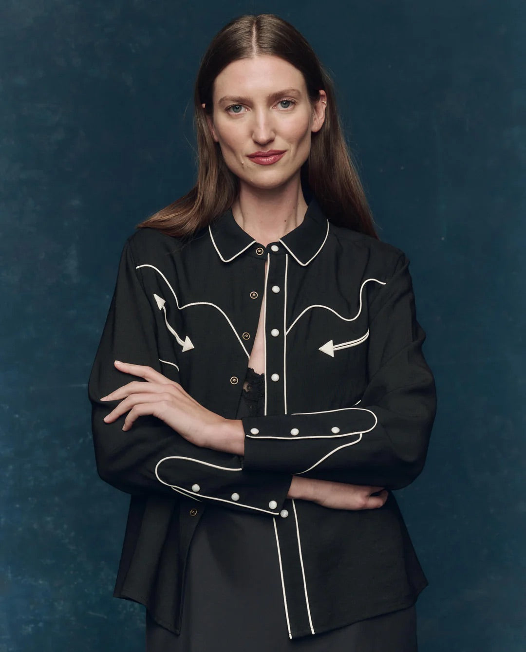 Rooted in classic rodeo style and reimagined with feminine charm, The Western Shirt is our ode to the iconic silhouettes of the American West. Cut from a sleek, drapey rayon twill, it moves with ease and carries just the right amount of shine. The details make it special—think curved western yoke, piped seaming, tall cuffs, and authentic pearl snaps that lend a vintage authenticity. The boxy fit and tapered cuffs create a flattering shape, while the tailored collar brings a polished touch. A timeless staple with storytelling stitched into every seam—pair it with denim for an effortlessly cool look that rides between rugged and refined.