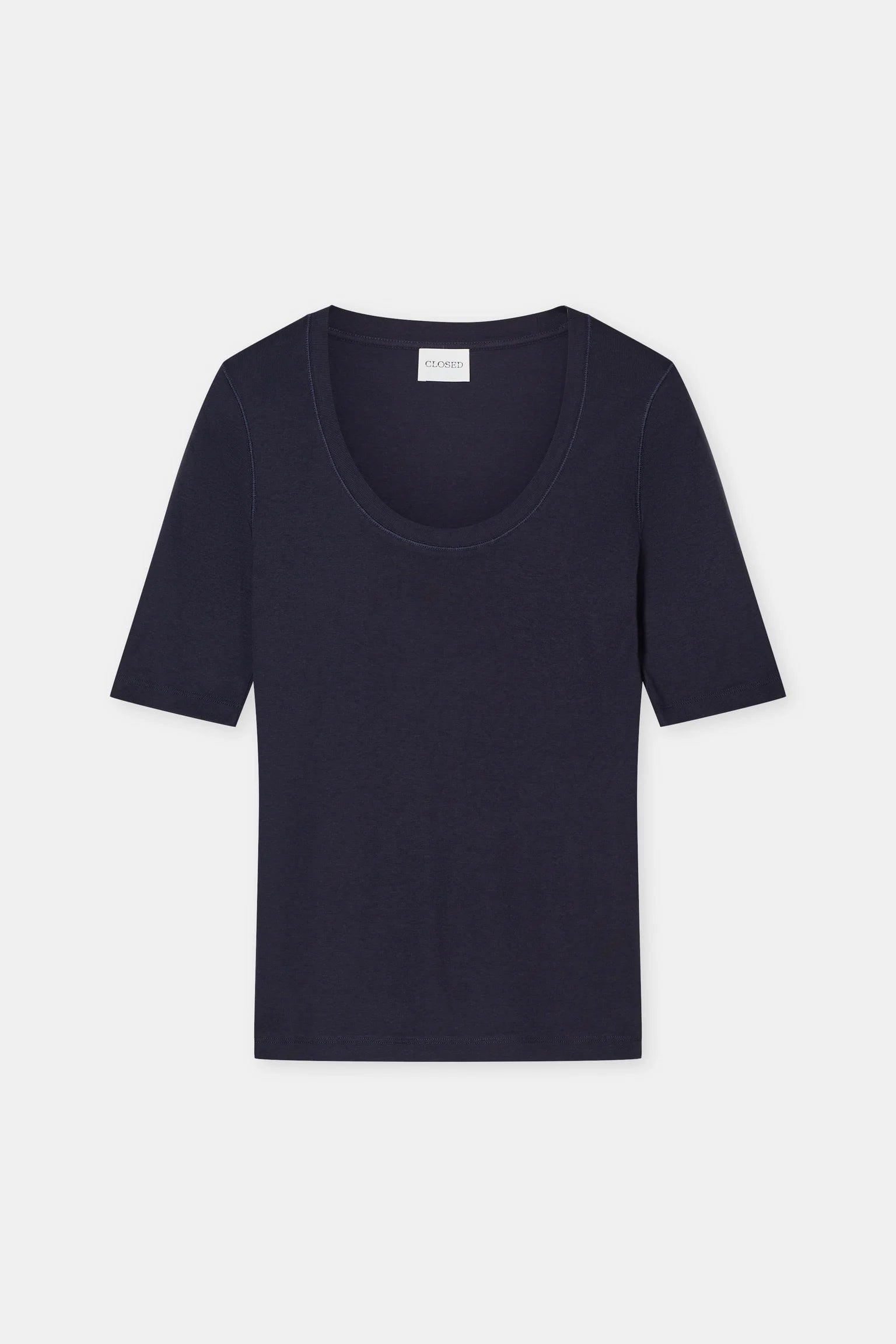 The wide neck short sleeve t-shirt presents a fitted silhouette with regular length. Crafted from fine rib-jersey cotton-modal blend, it offers an exceptionally soft feel against the skin. The distinctive wide u-neckline features refined ribbing, while the Closed monogram flag detail at the sideseam adds a subtle signature touch.