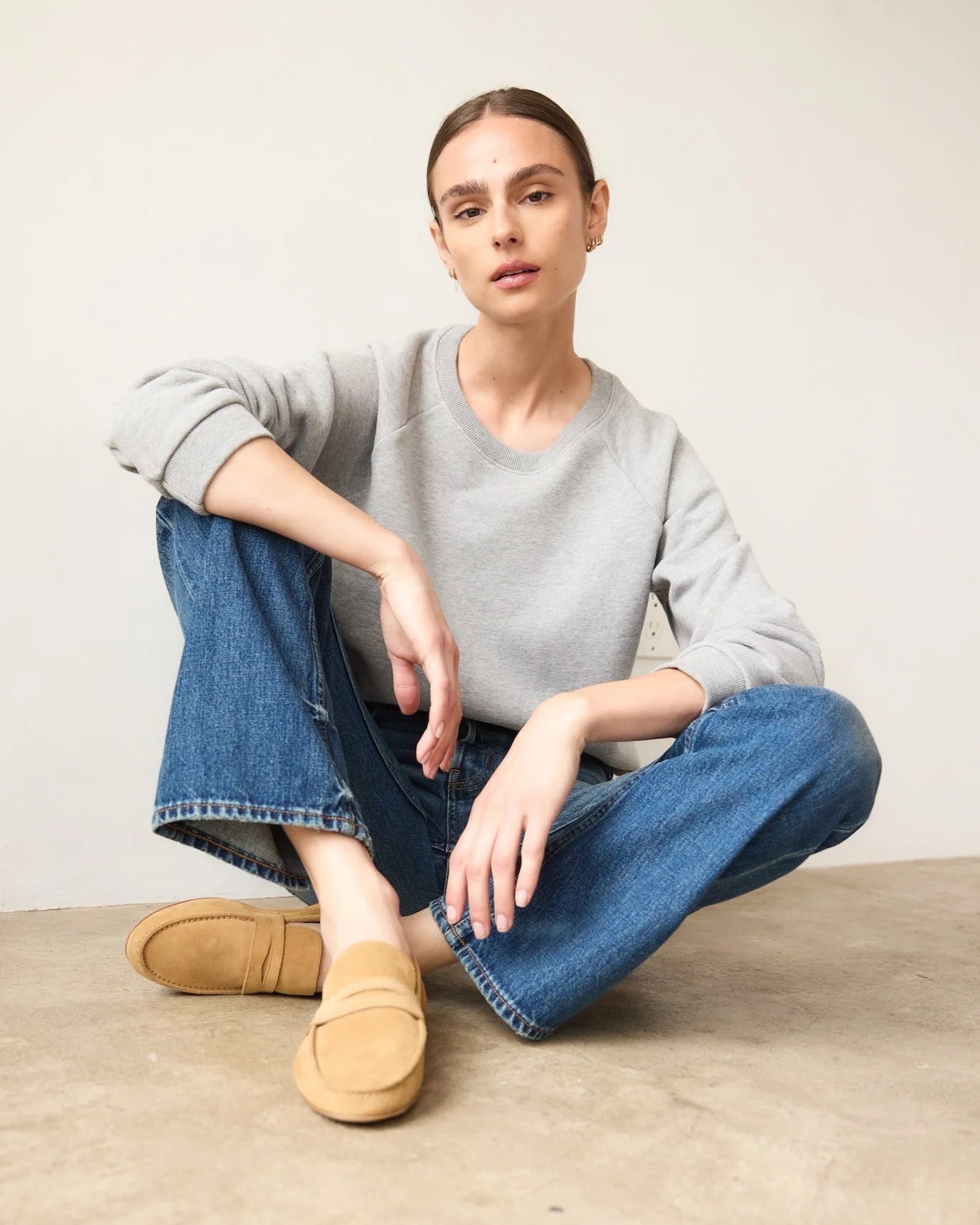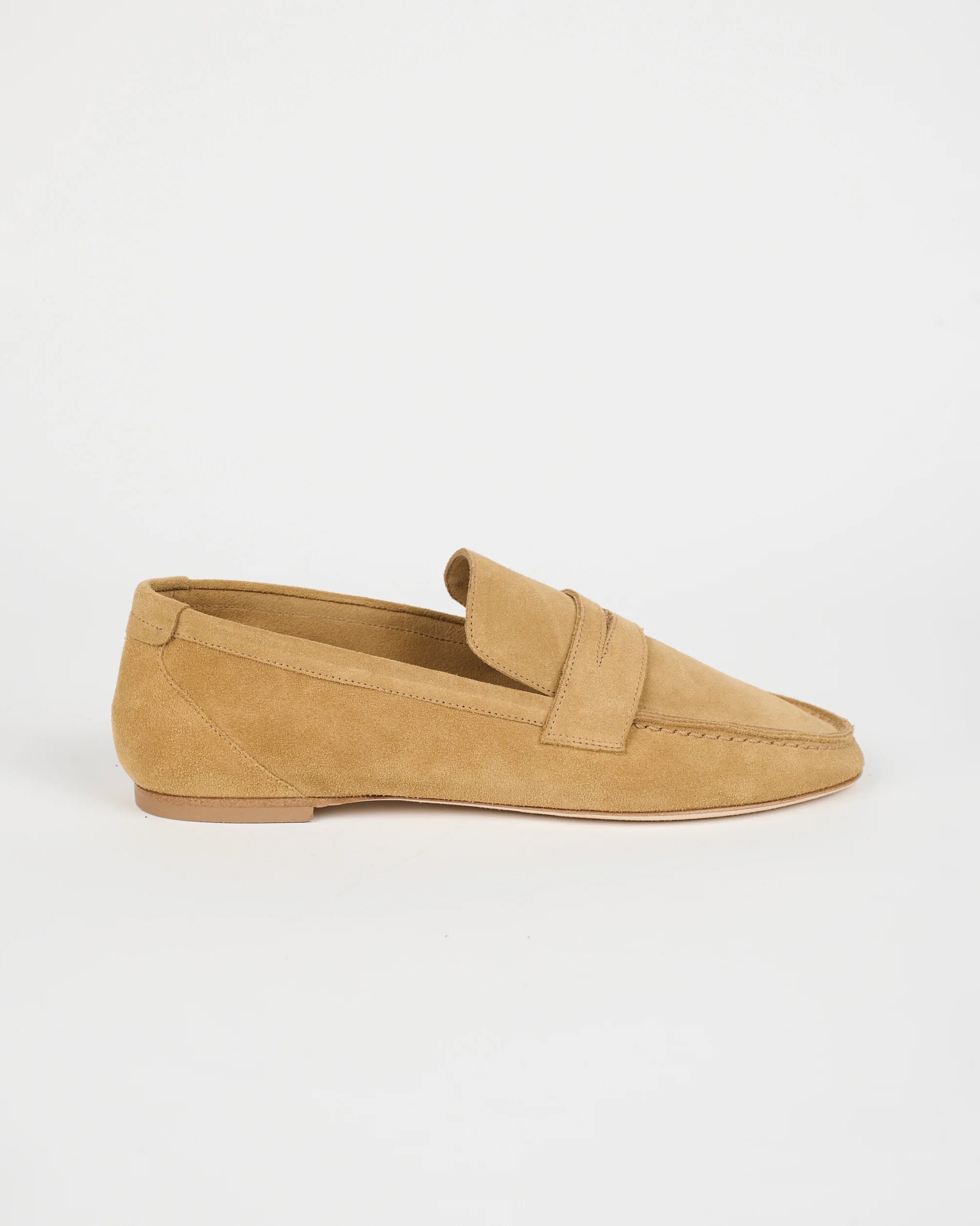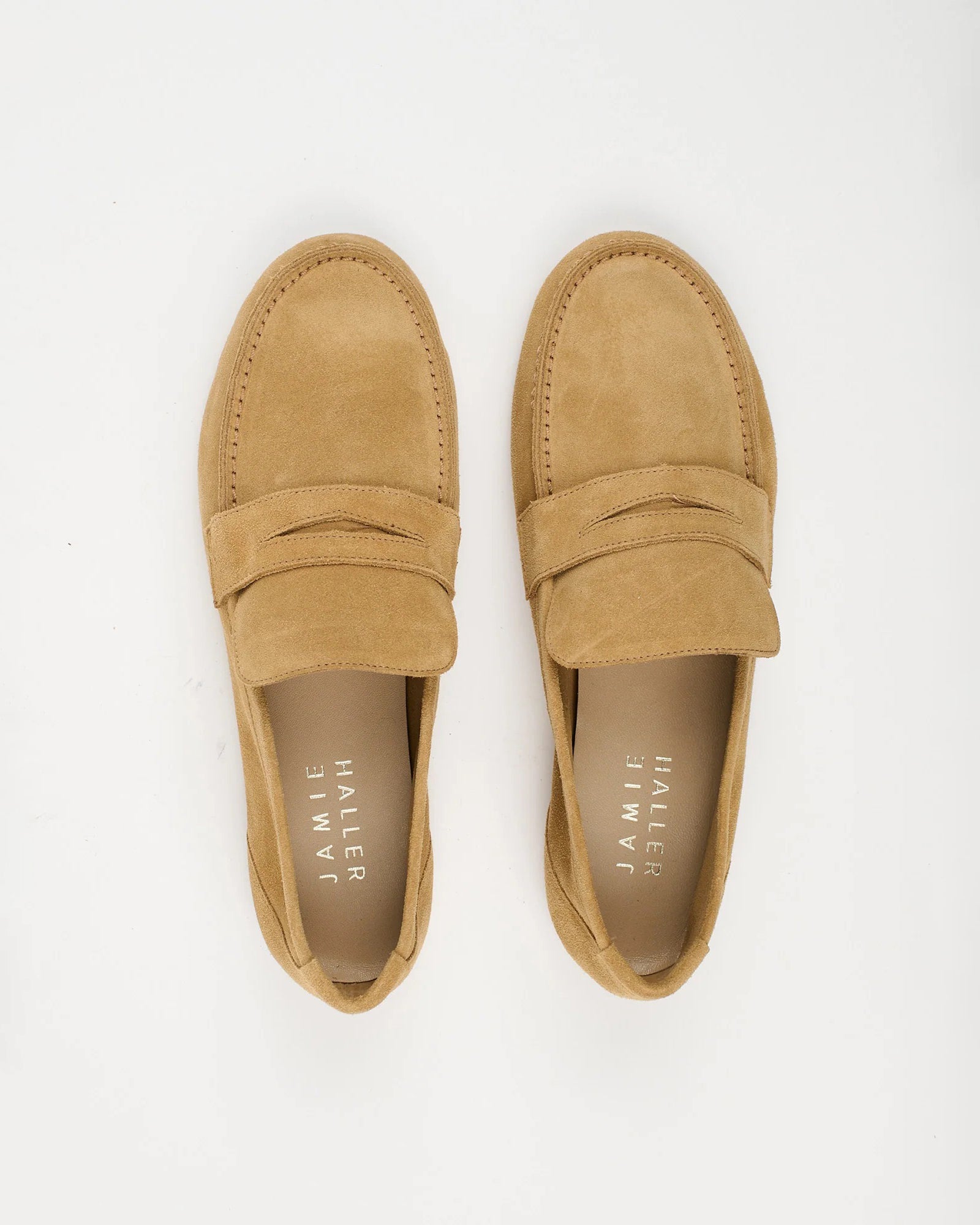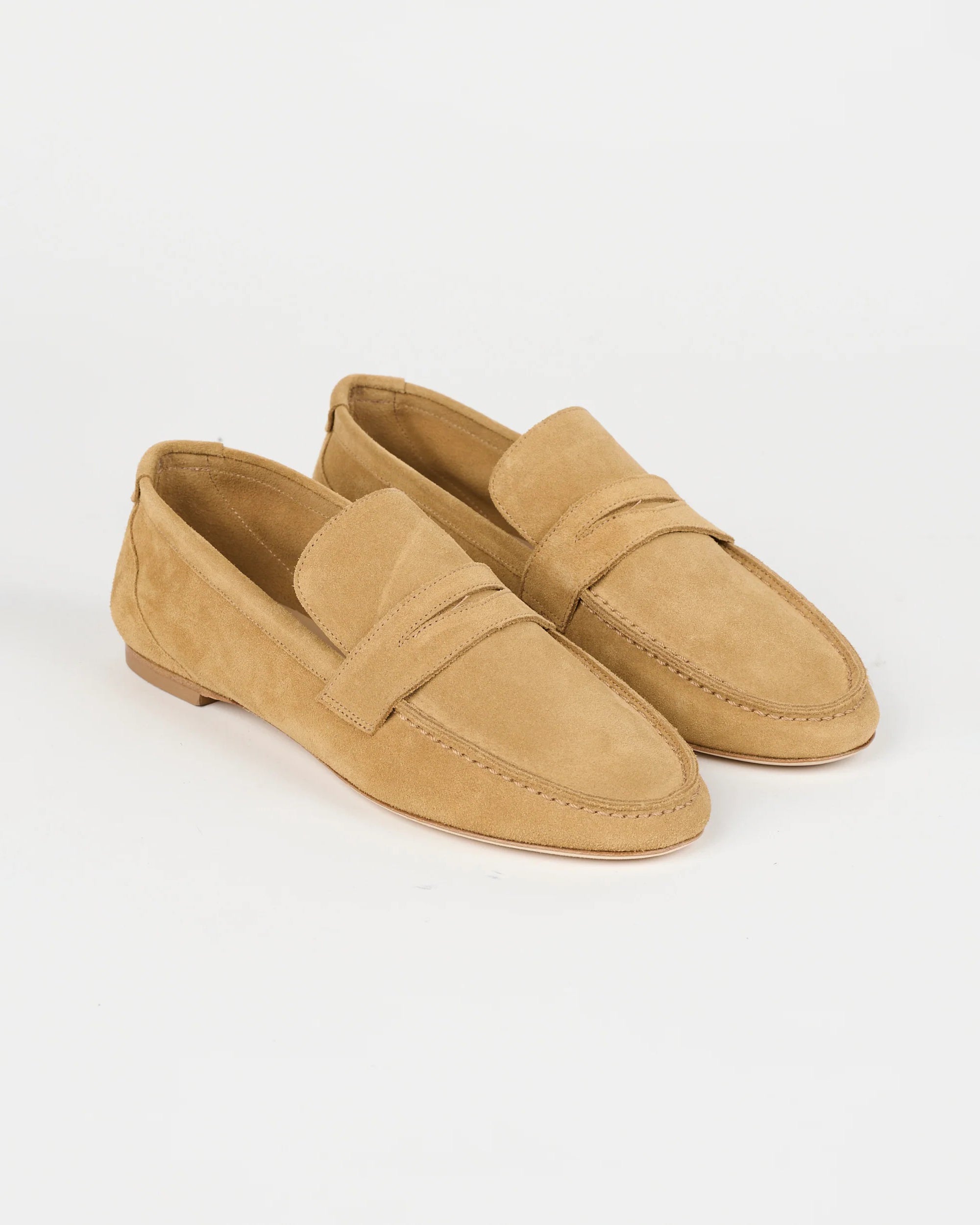 Jamie's signature Penny Loafer in Italian suede. Inspired by the handsome lines of a 70’s Italian mens loafer with the understated casual soul of a slipper. Old world Sacchetto construction for a glove like fit and buttery feel. Leather lined. Leather sole and insole. Rubber Injected Leather Sole.