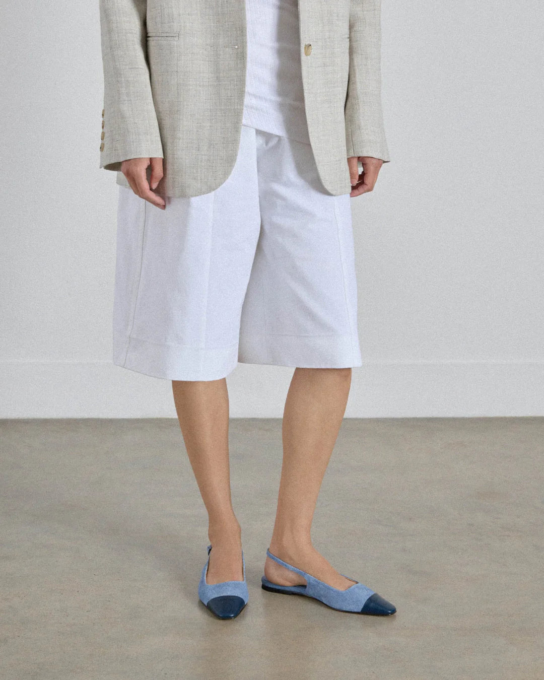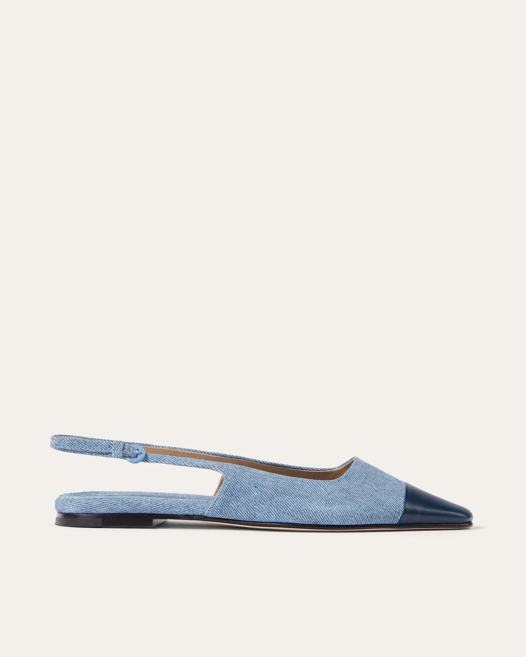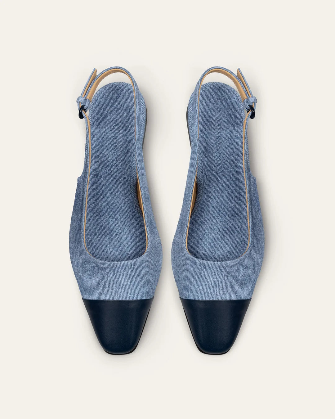 The minimal slingback silhouette, finished in our exclusive denim-effect leather and a lacquered resin buckle. Set upon a softly squared toe