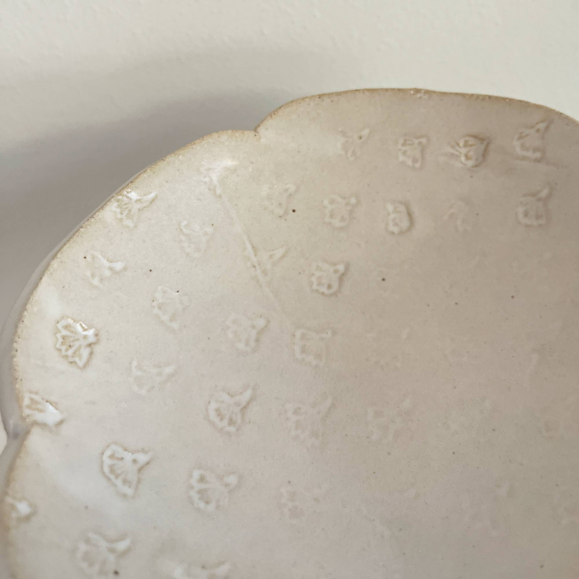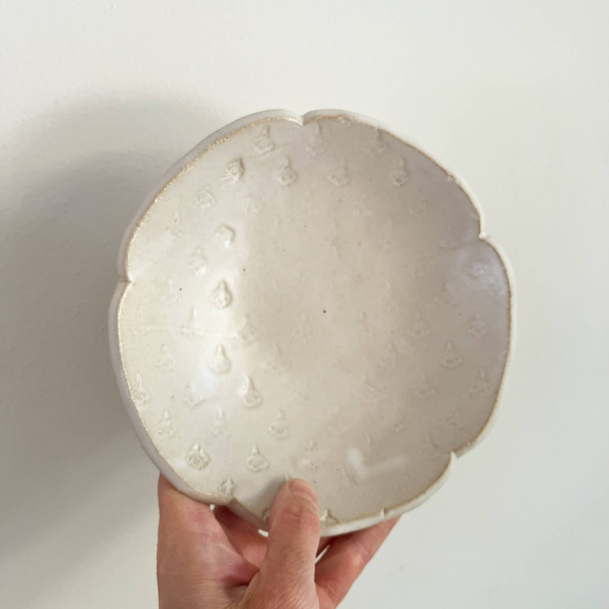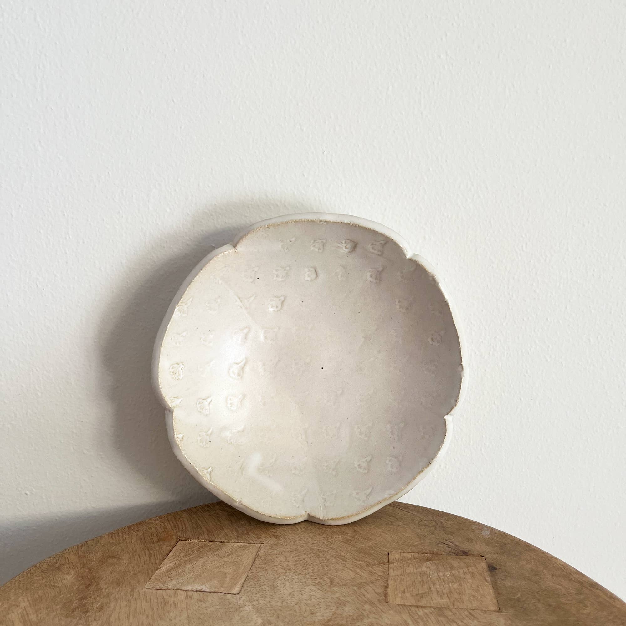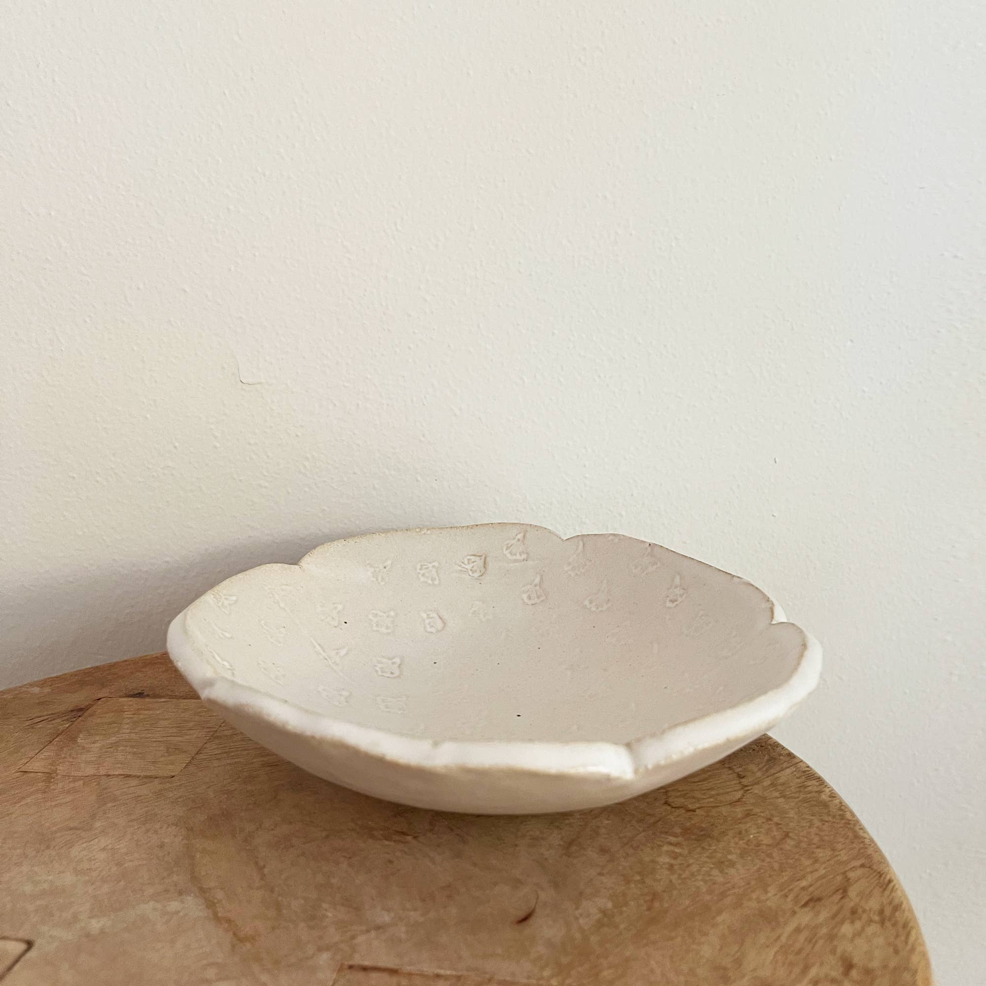 This feminine-shaped shallow bowl or catchall is debossed with a pattern of scattered blossoms. Hand-stamped to ensure each piece is a little random and irregular. glazed stoneware handwash recommended microwave safe 7" diameter x 1.75" height