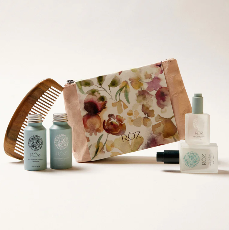 Includes our custom reusable and recyclable travel pouch gift wrapped in this years exclusive watercolor gift print, with our custom RŌZ Sandalwood Comb as an added treat.