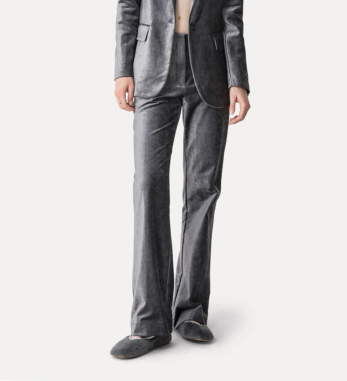 flared trousers in stretch velvet doused in a rich colour palette with an invitingly plush nap. the high waist and internal placket contribute to its pristine aesthetic while the leg drapes softly and naturally to the ground in a gentle pool. this sleek separate achieves a balance between fluid elegance and tactile appeal.
