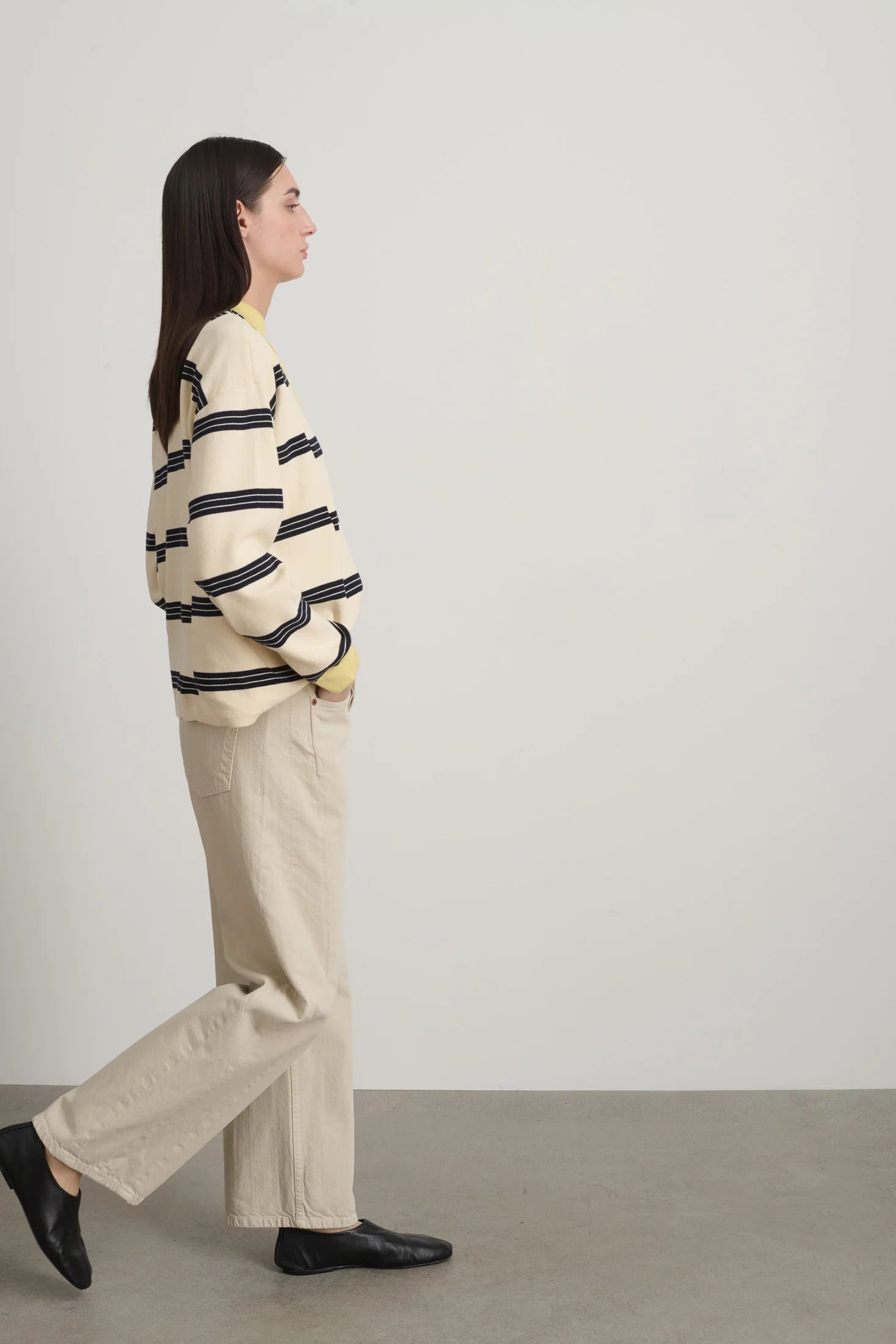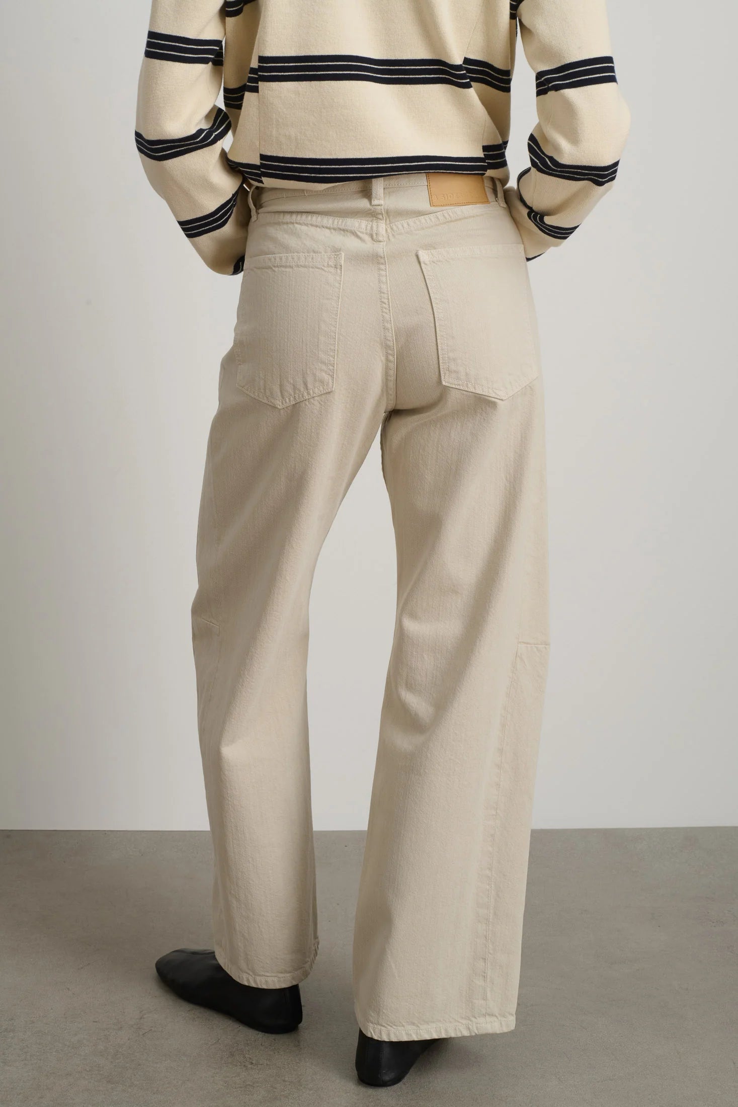 • High rise fit sitting at the natural waist with a cropped 29" inseam. Relaxed fit through the hips with an articulated slim bowed leg shape.