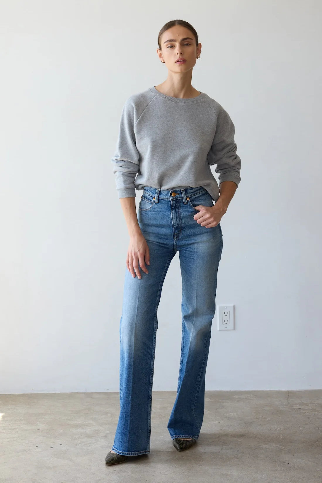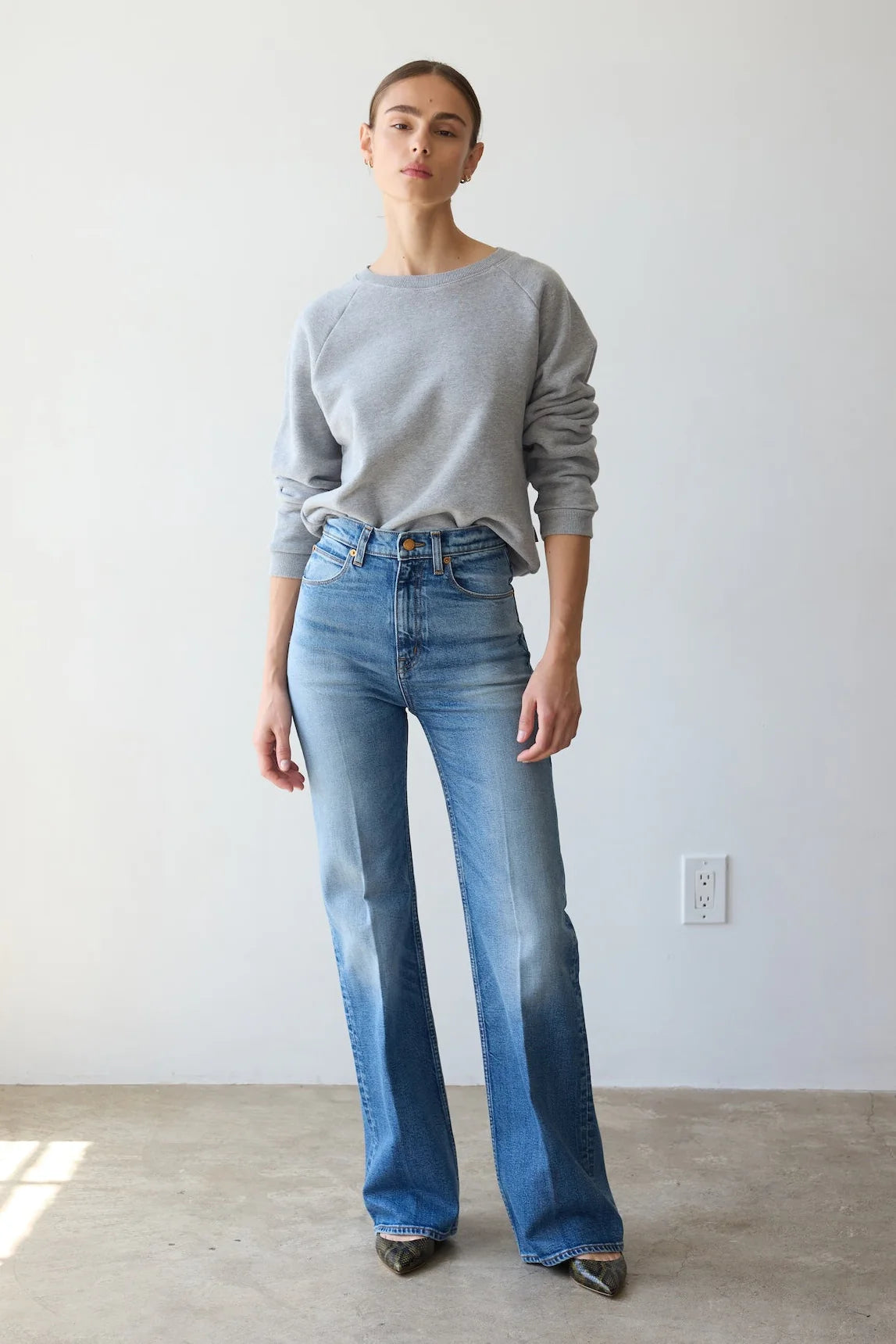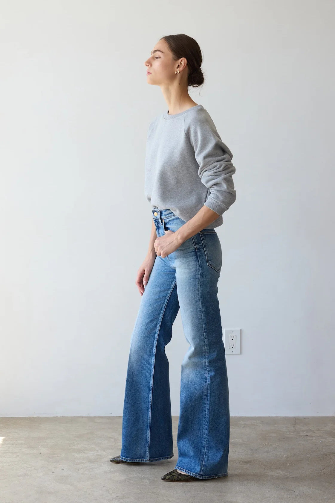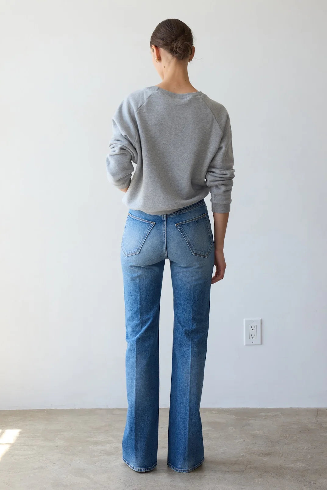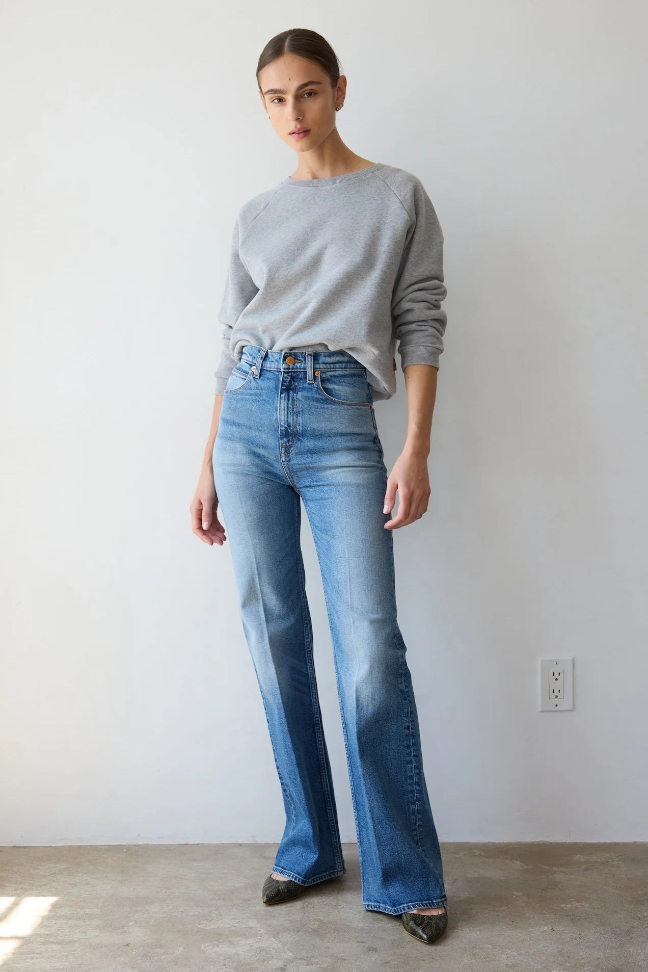 An elevated denim flare that does the long and lean look well. A leg shaped like a narrow A. A leg that elongates. The shape that leans. A 33 1/2” inseam that puddles with a flat and skims with a kitten. A 12.5” high mid rise that accentuates the natural waist. A silhouette that you fall in love with, and loves you back with it’s 2% stretch.