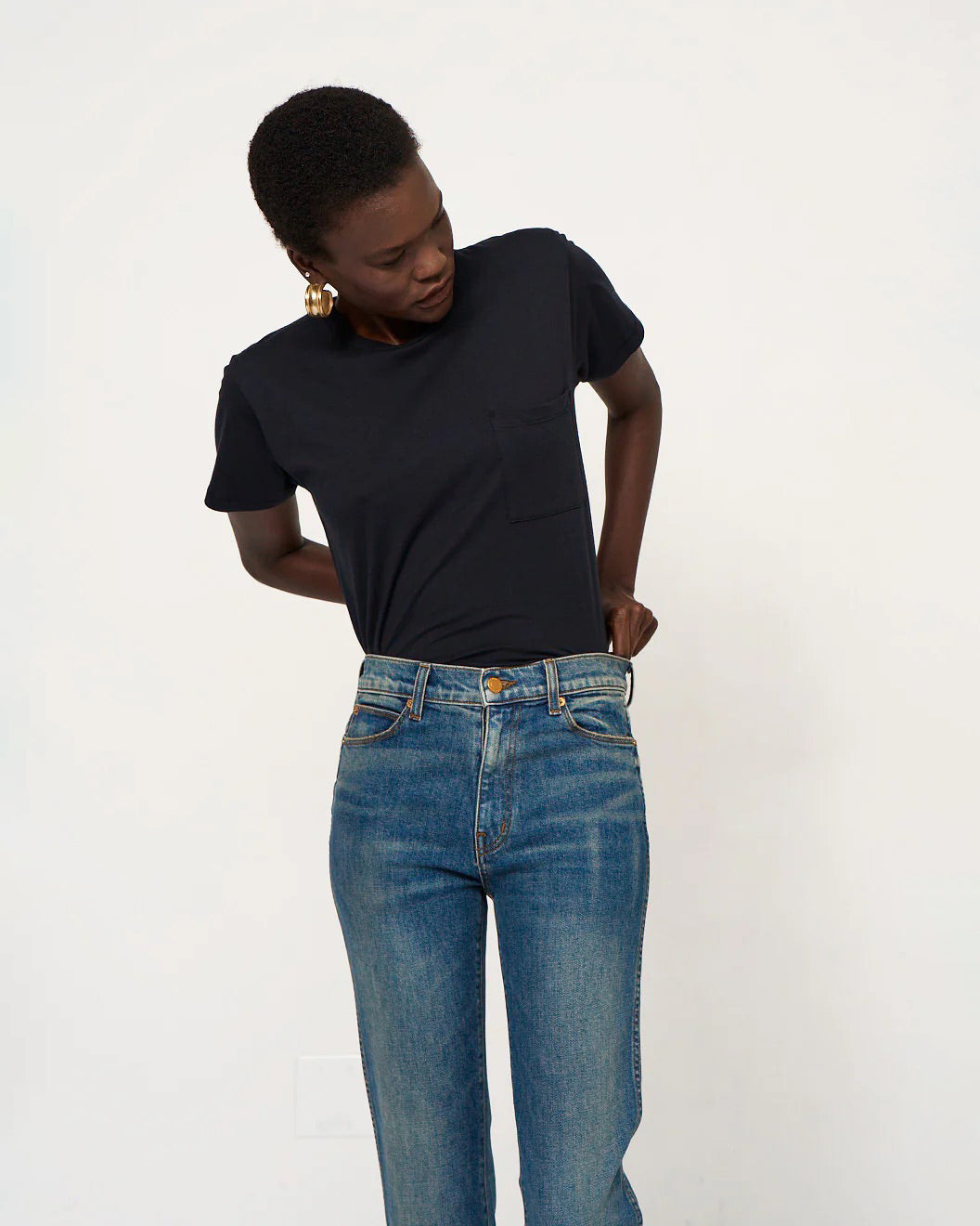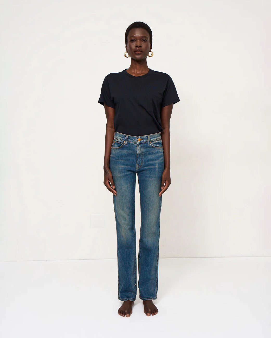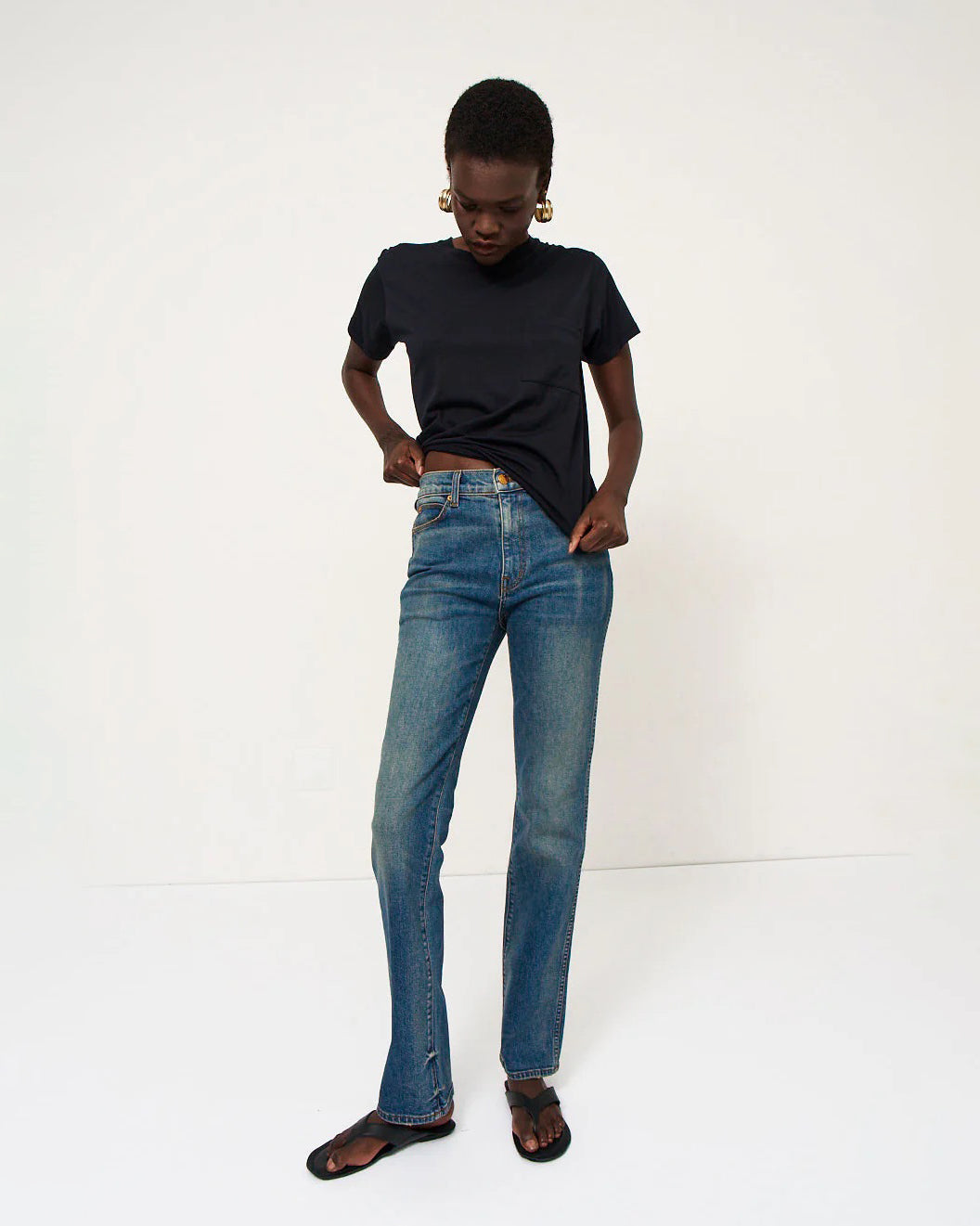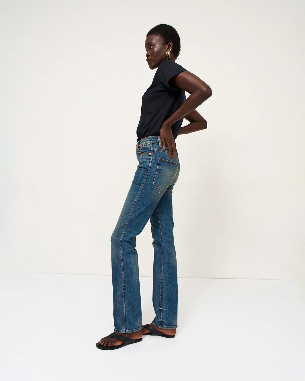 Named after a rock god, the Freddie is a true mid rise at 9 3/4". A long and lean straight leg stretch denim jean with a 30" inseam. Expertly cut for a straight and slimming shape with side seams that elongate. Double needle topstitch goes all the way down down the leg.